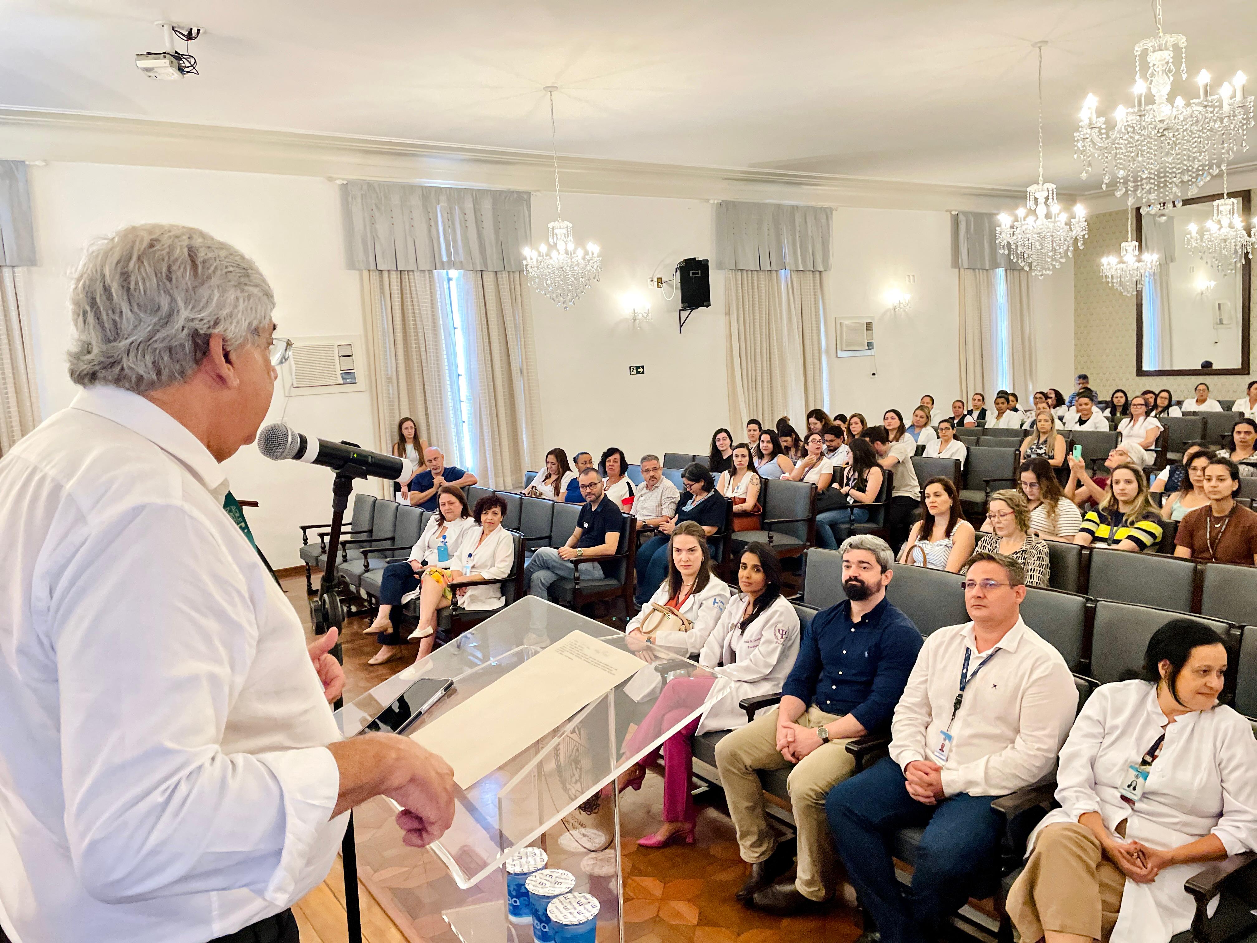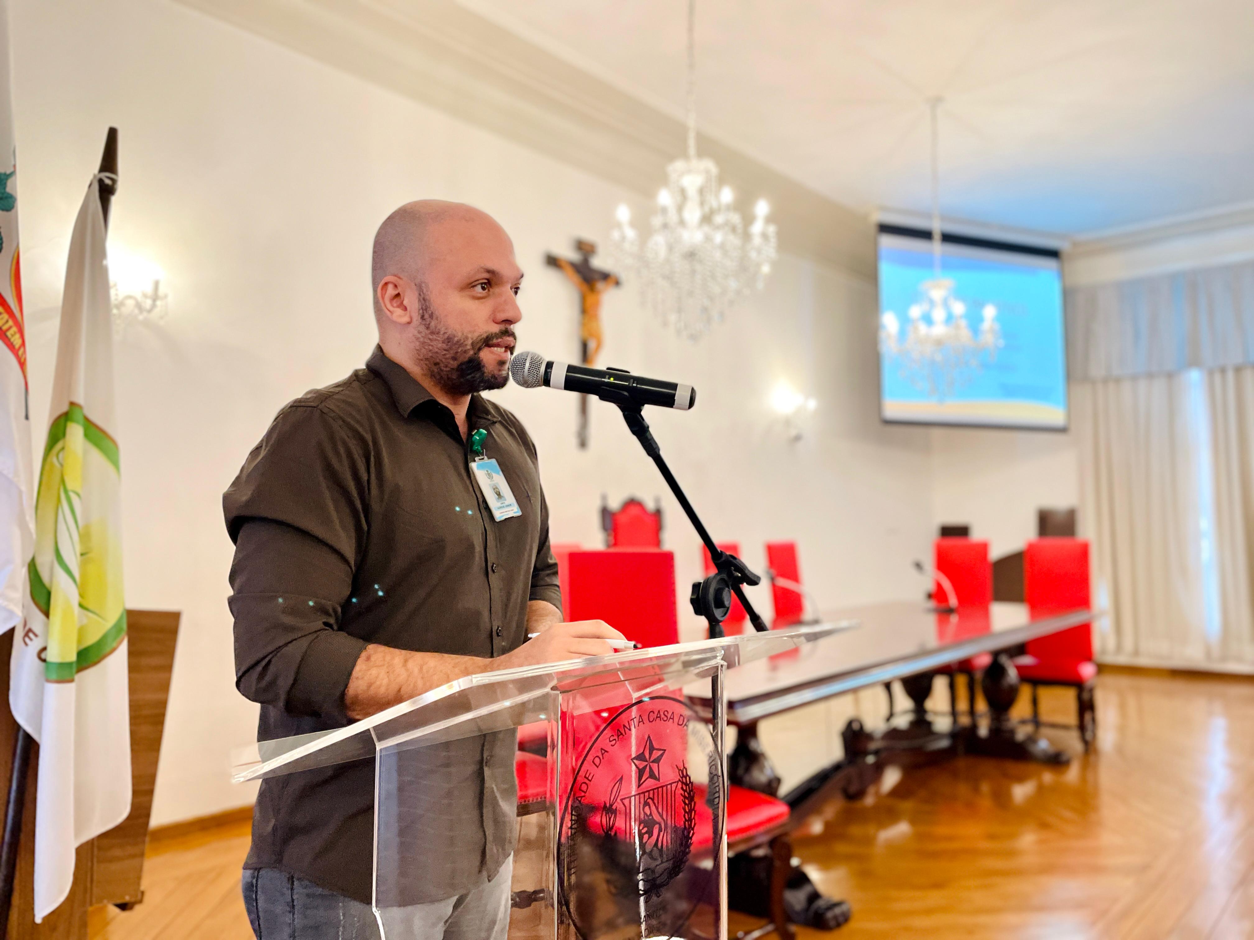 O diretor técnico, Dr. Alex Macedo, em seu momento de fala, relembrou como começaram os primeiros passos da equipe de Cuidados Paliativos na instituição e da atuação da assistente social Cláudia Jacob à frente do grupo.