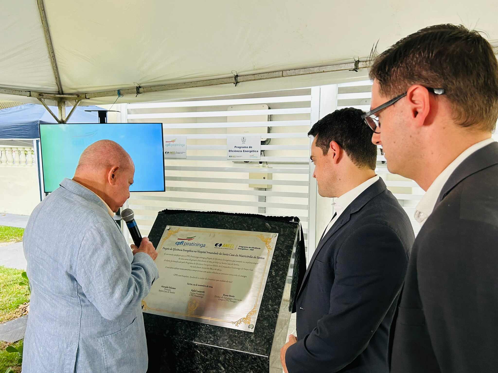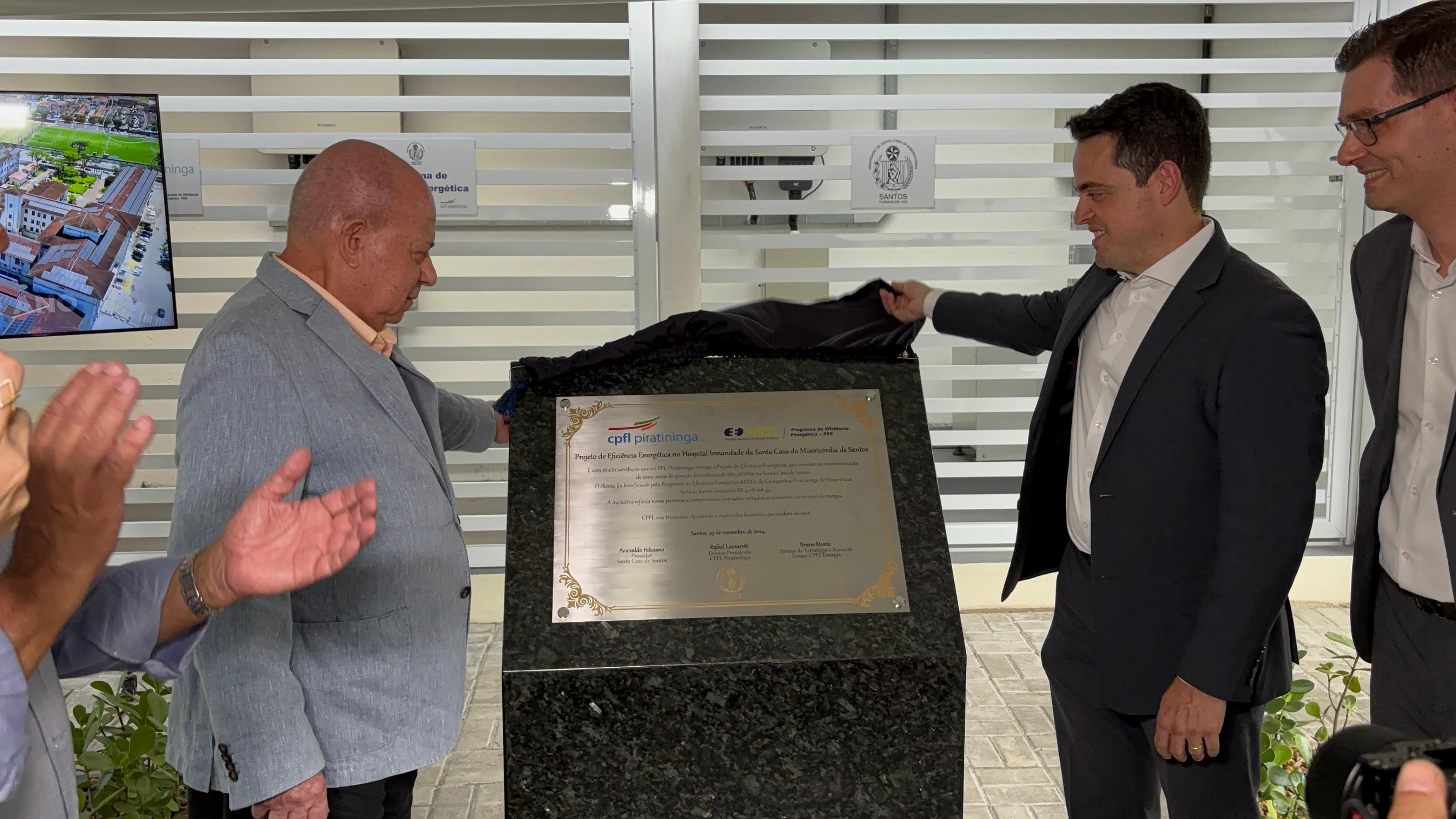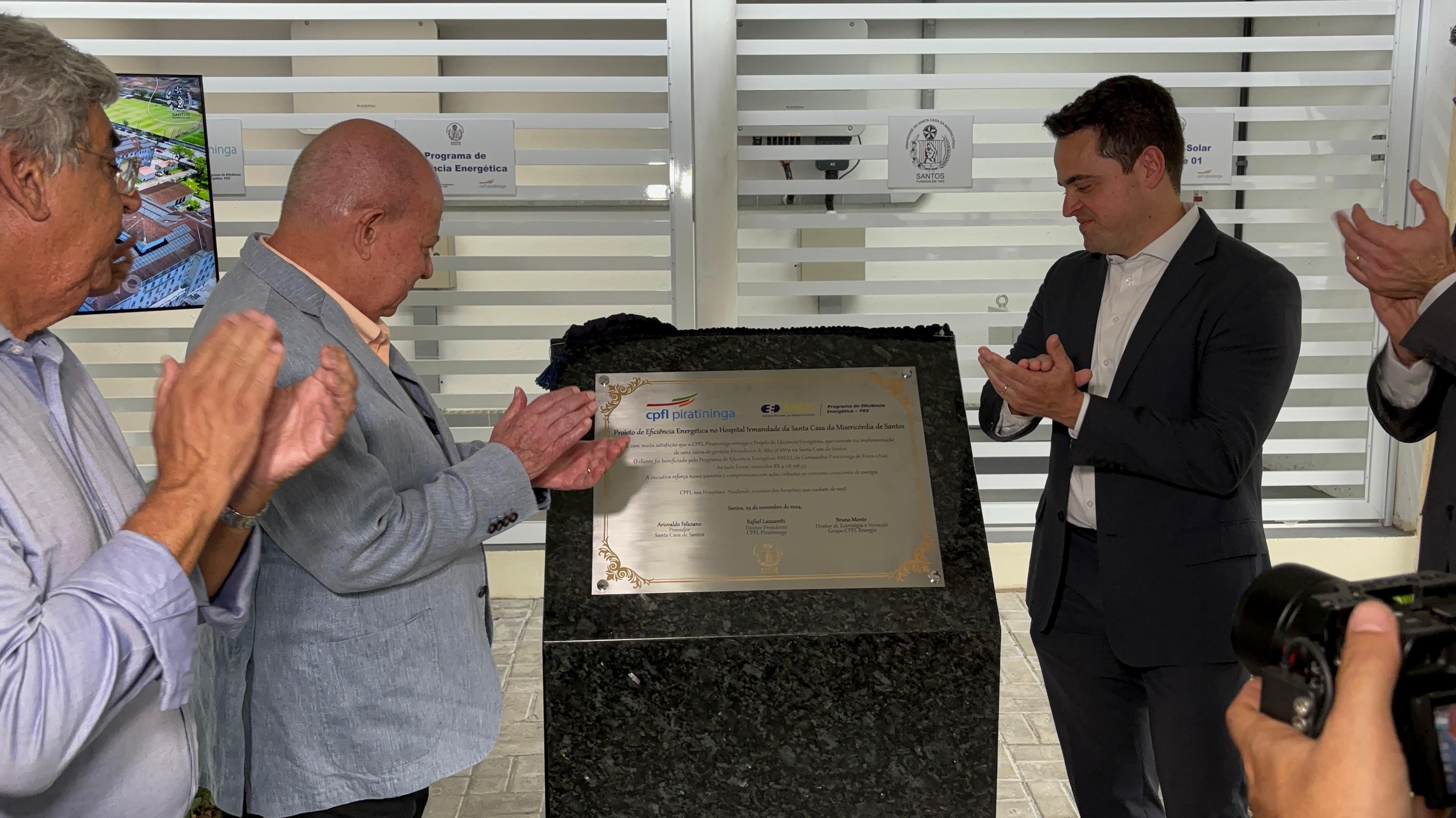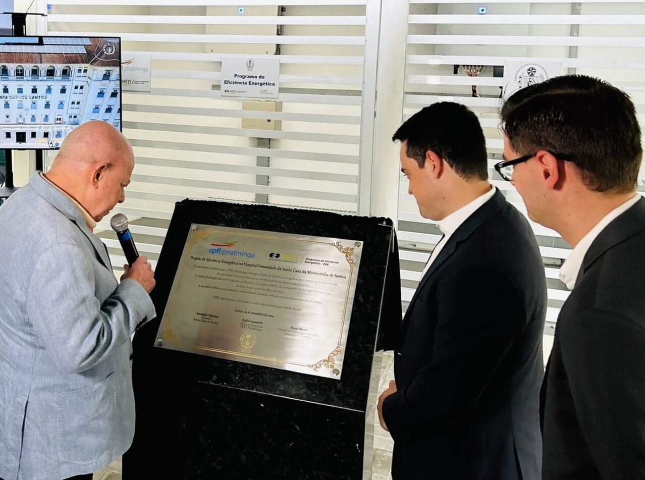 A entrega oficial do Sistema de Energia Fotovoltaica da Santa Casa de Santos aconteceu no dia 29/11/24, em solenidade que contou com o provedor do hospital, Ariovaldo Feliciano, o diretor presidente da CPFL Piratininga, Rafael Lazzaretti, e do diretor de Estratégia e Inovação do Grupo CPFL Energia, Bruno Monte.