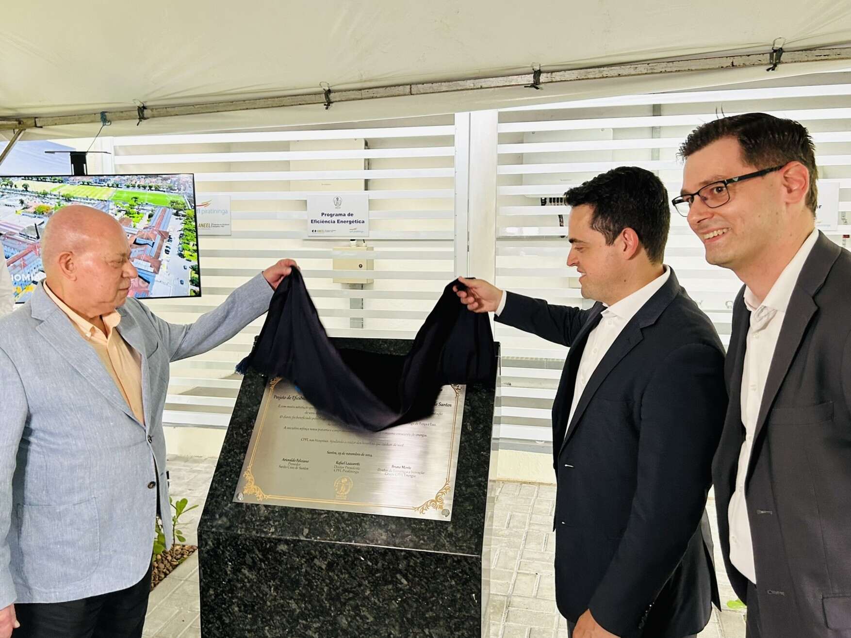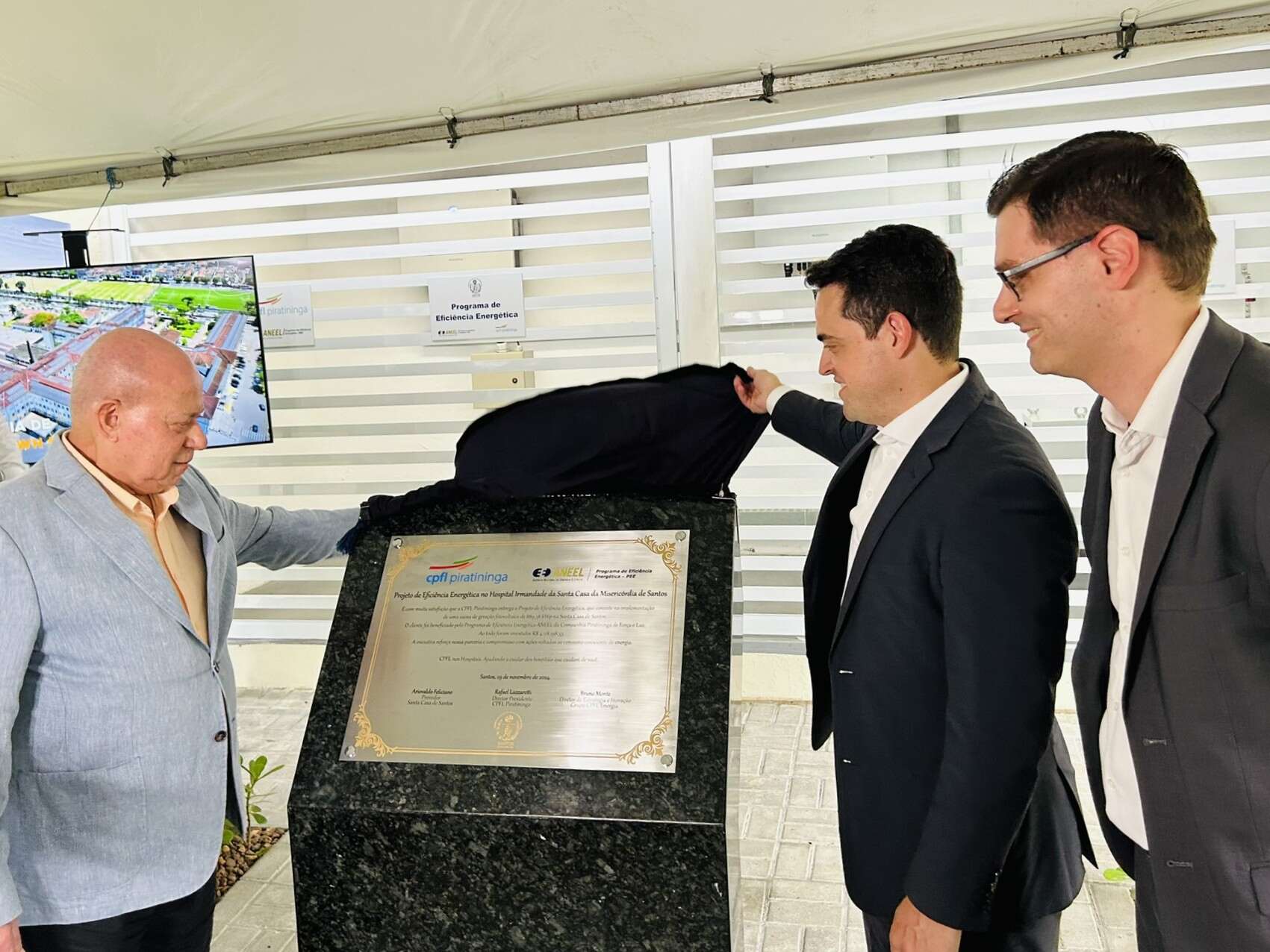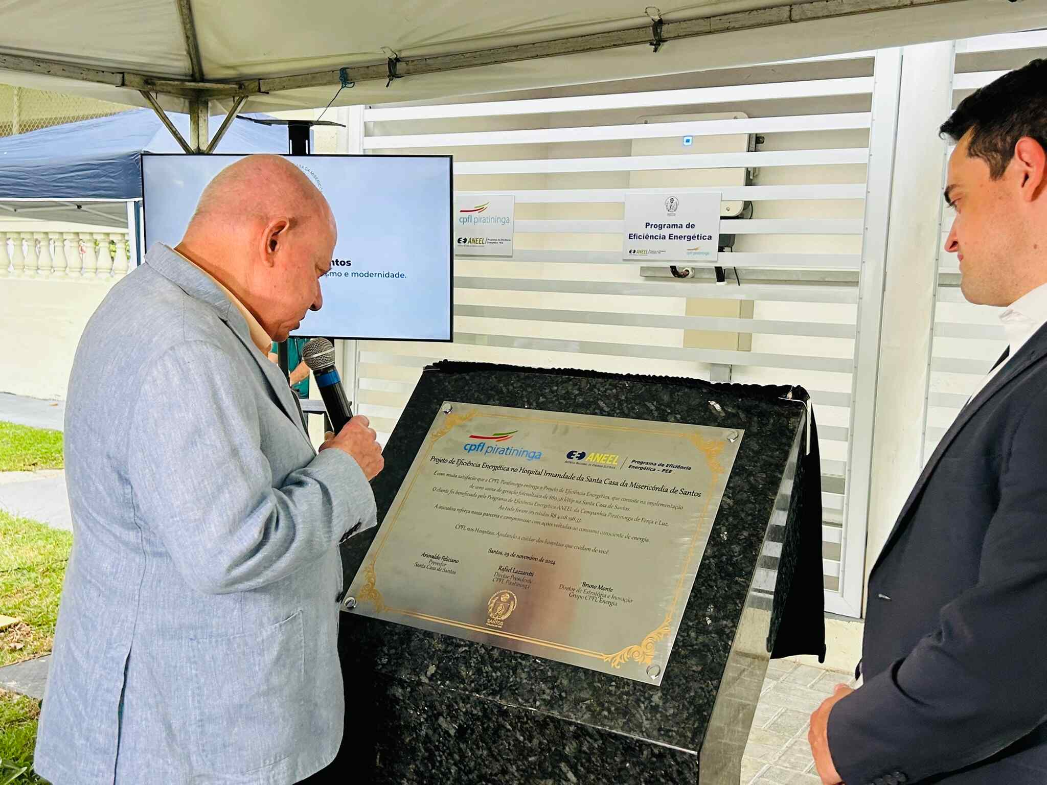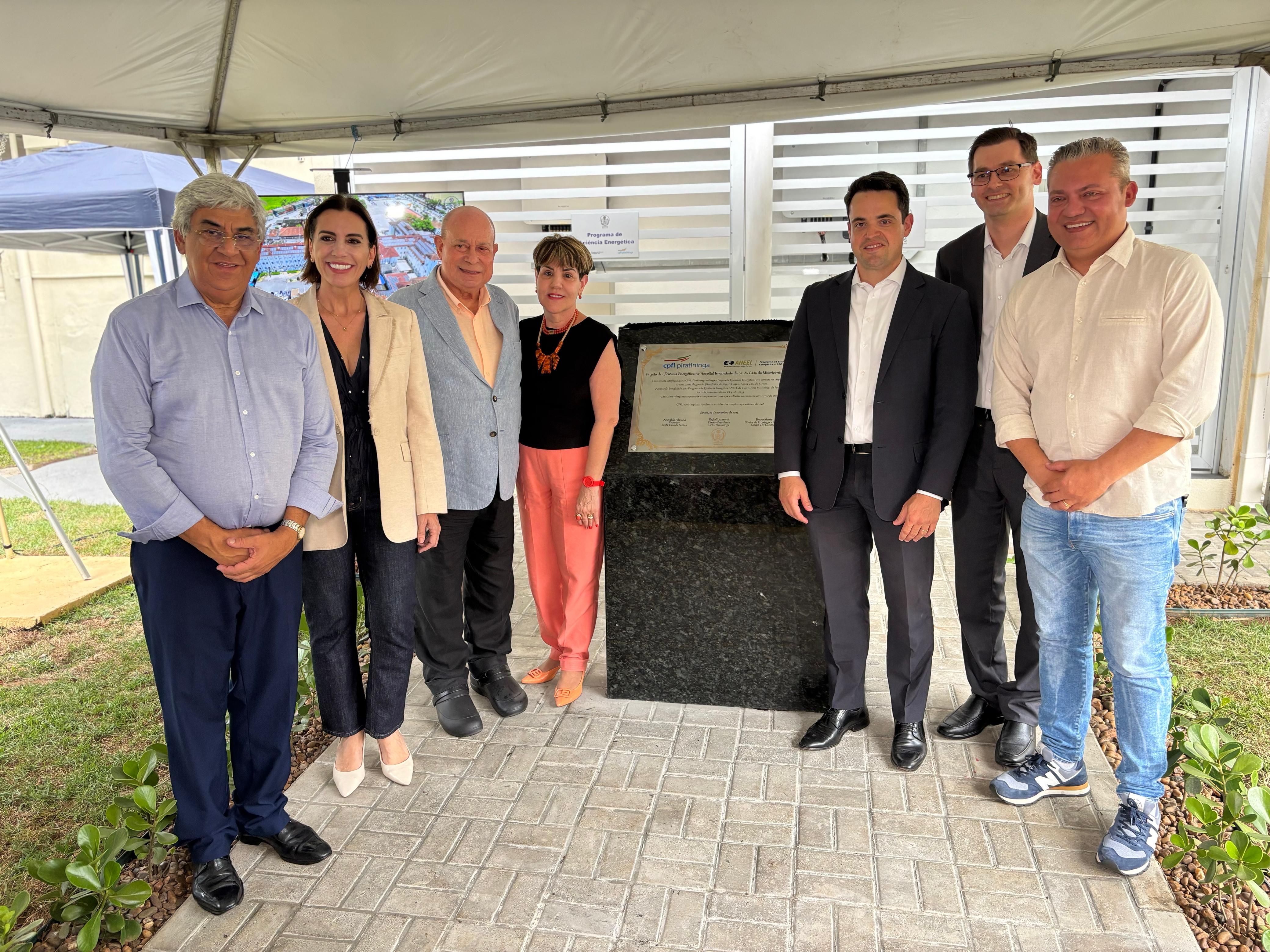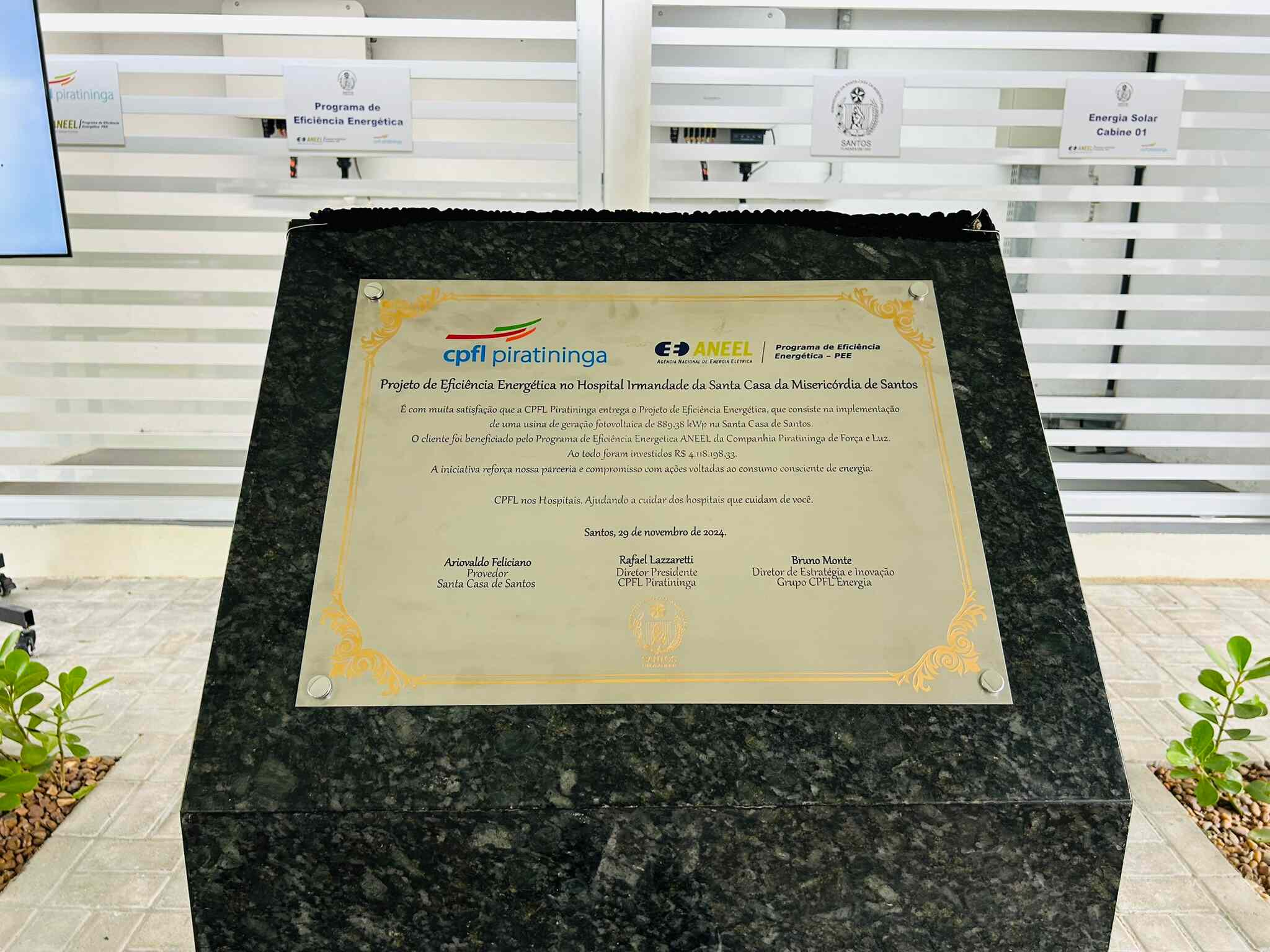 A entrega oficial do Sistema de Energia Fotovoltaica da Santa Casa de Santos aconteceu no dia 29/11/24, em solenidade que contou com o provedor do hospital, Ariovaldo Feliciano, o diretor presidente da CPFL Piratininga, Rafael Lazzaretti, e do diretor de Estratégia e Inovação do Grupo CPFL Energia, Bruno Monte.