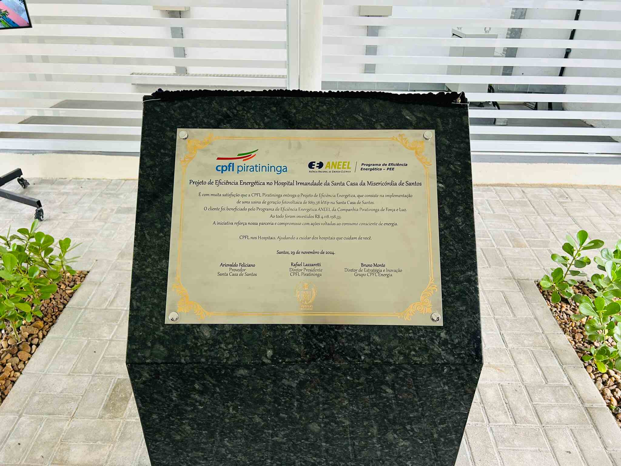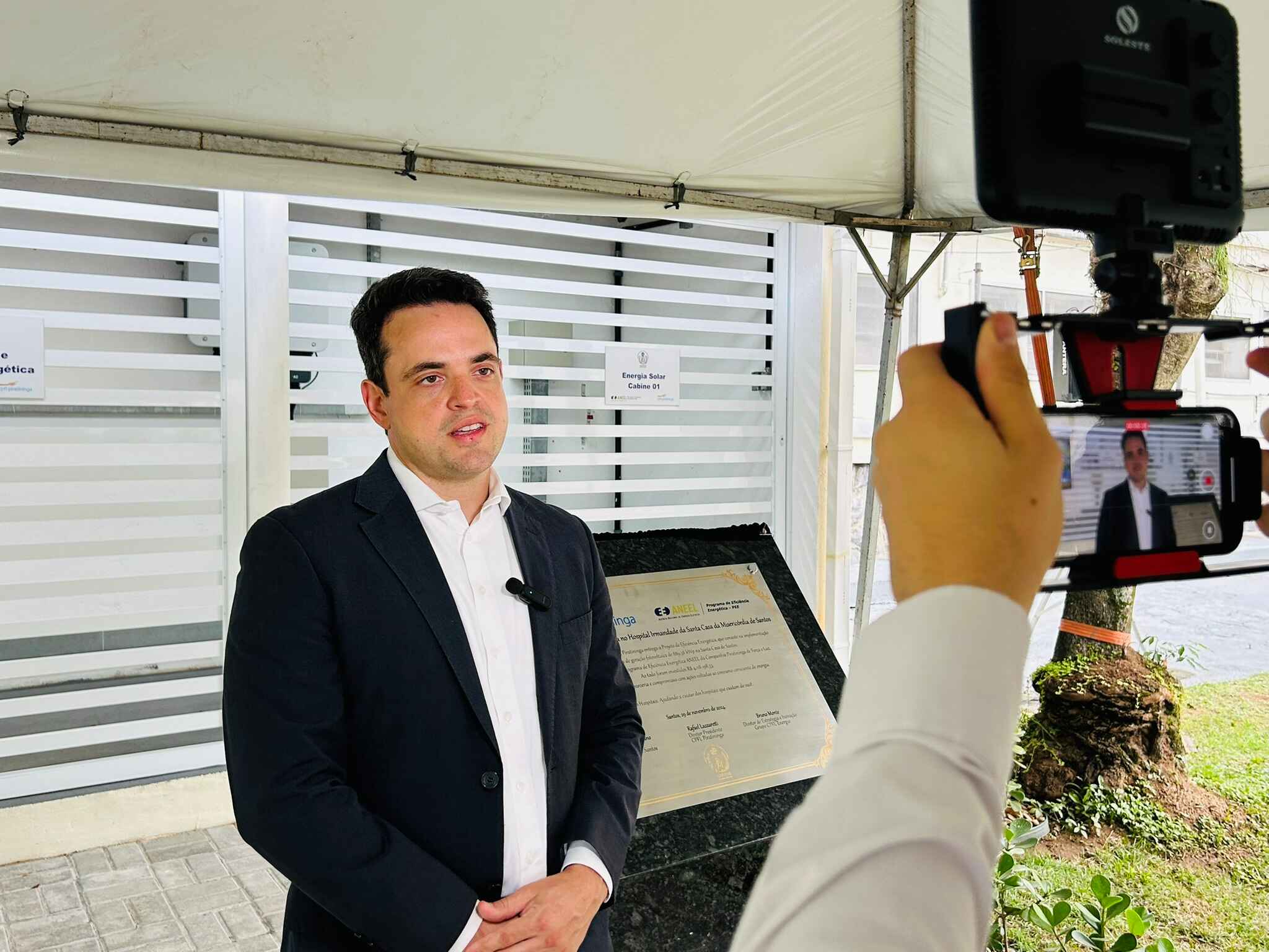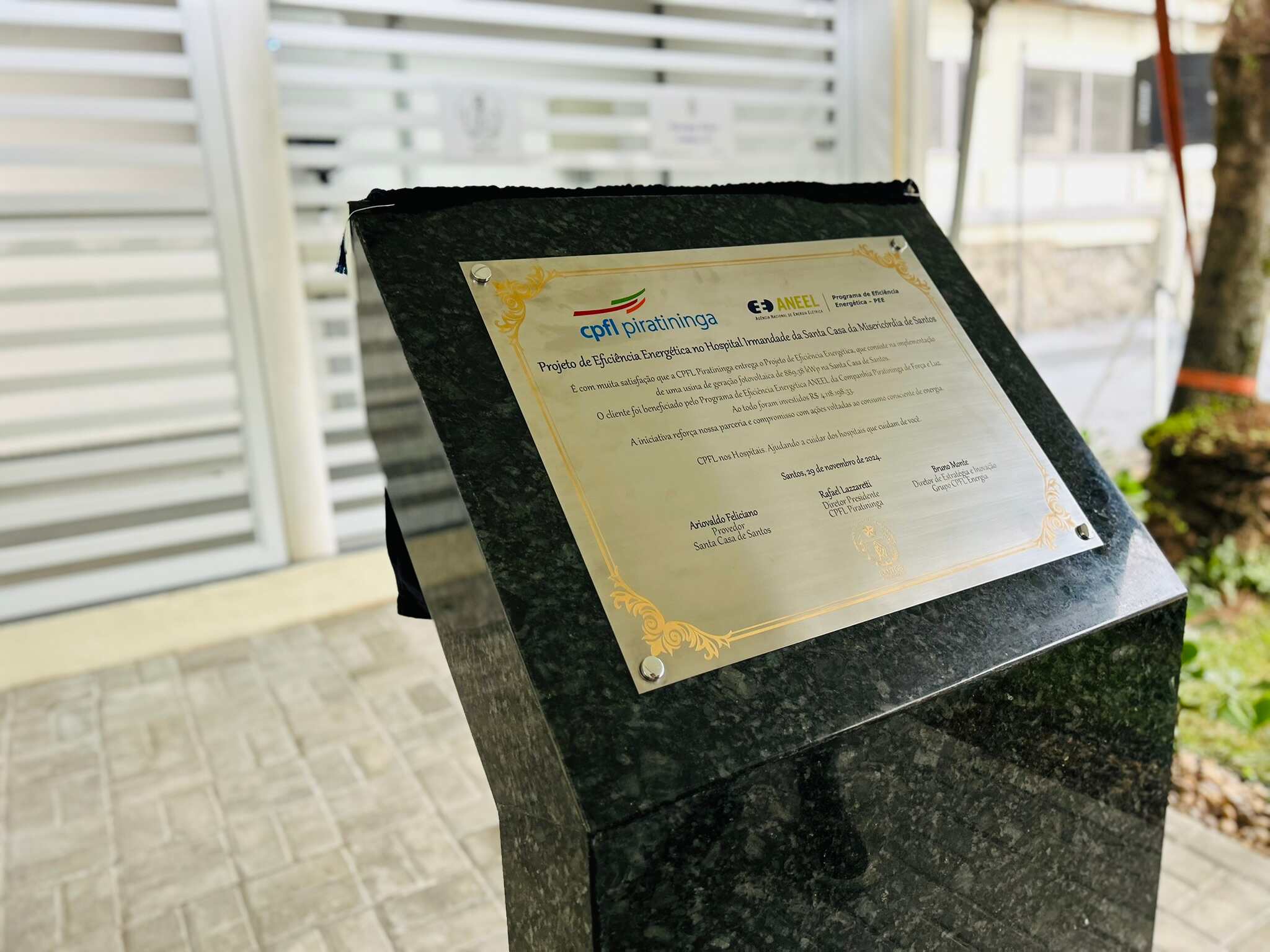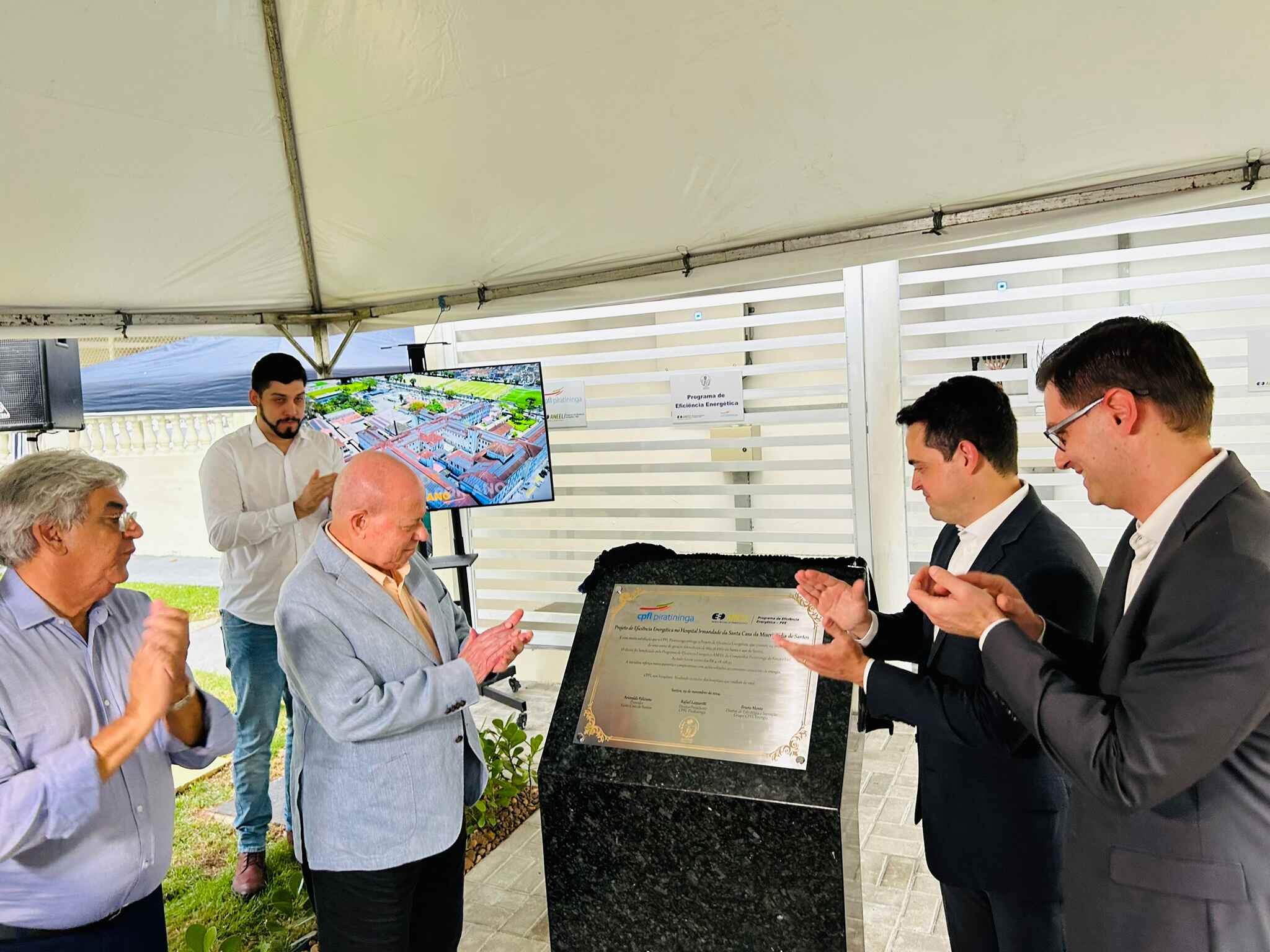 A entrega oficial do Sistema de Energia Fotovoltaica da Santa Casa de Santos aconteceu no dia 29/11/24, em solenidade que contou com o provedor do hospital, Ariovaldo Feliciano, o diretor presidente da CPFL Piratininga, Rafael Lazzaretti, e do diretor de Estratégia e Inovação do Grupo CPFL Energia, Bruno Monte.