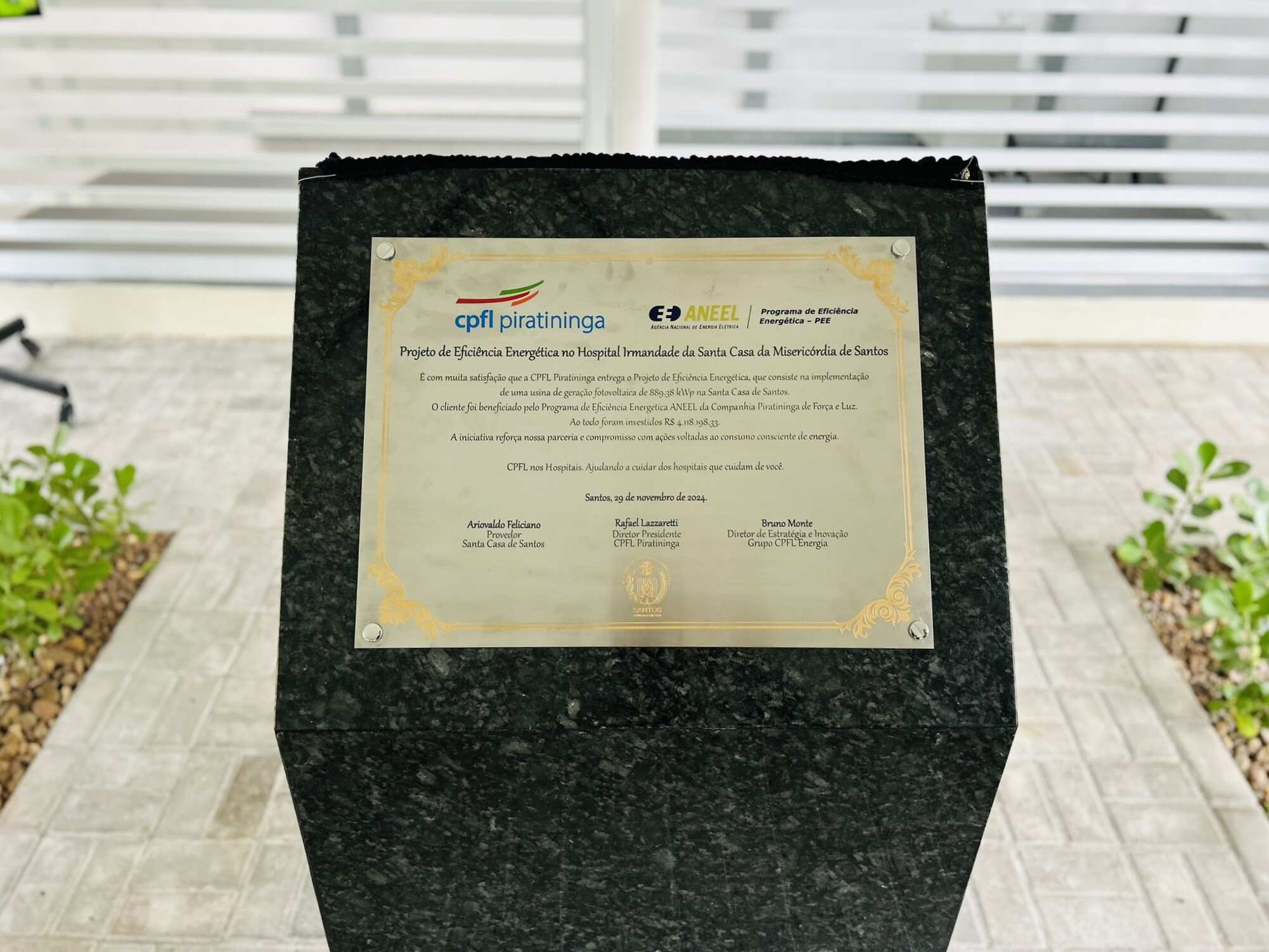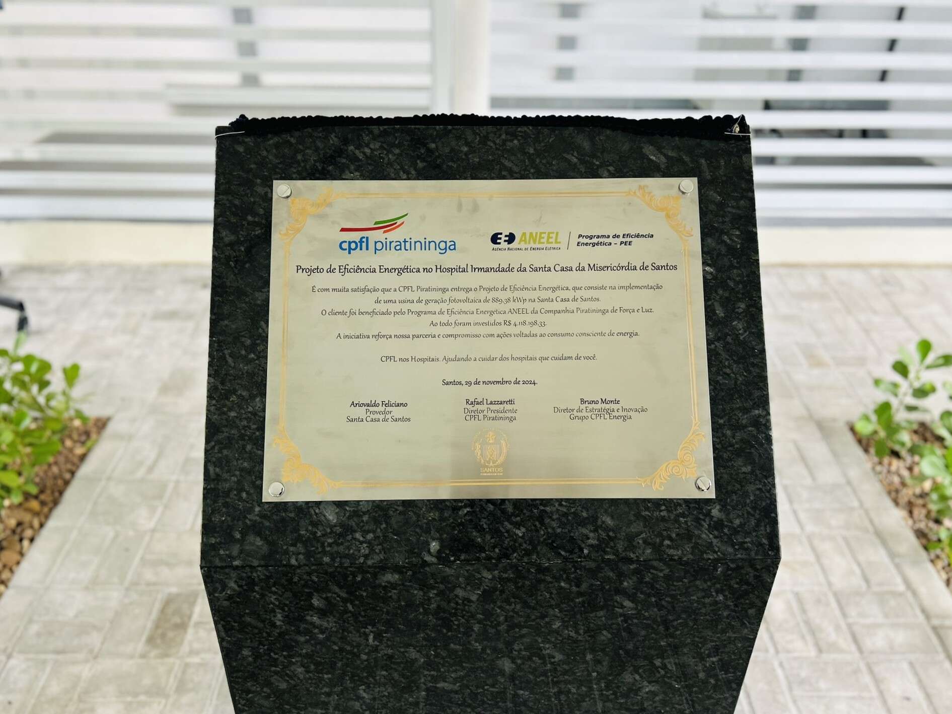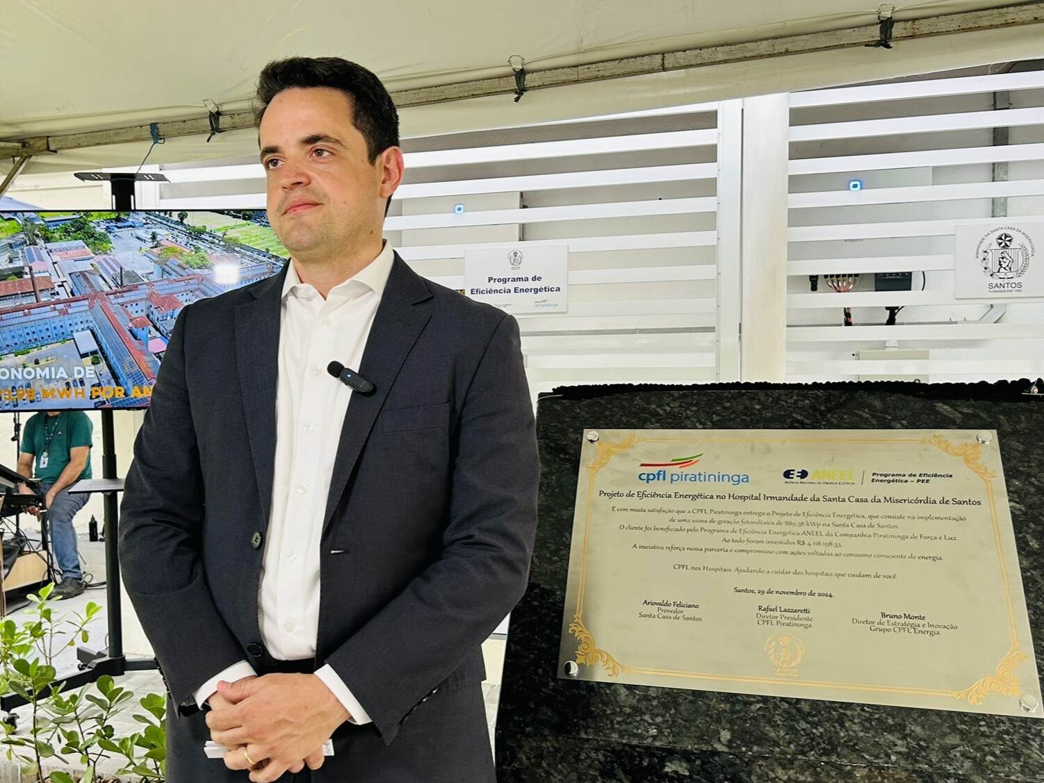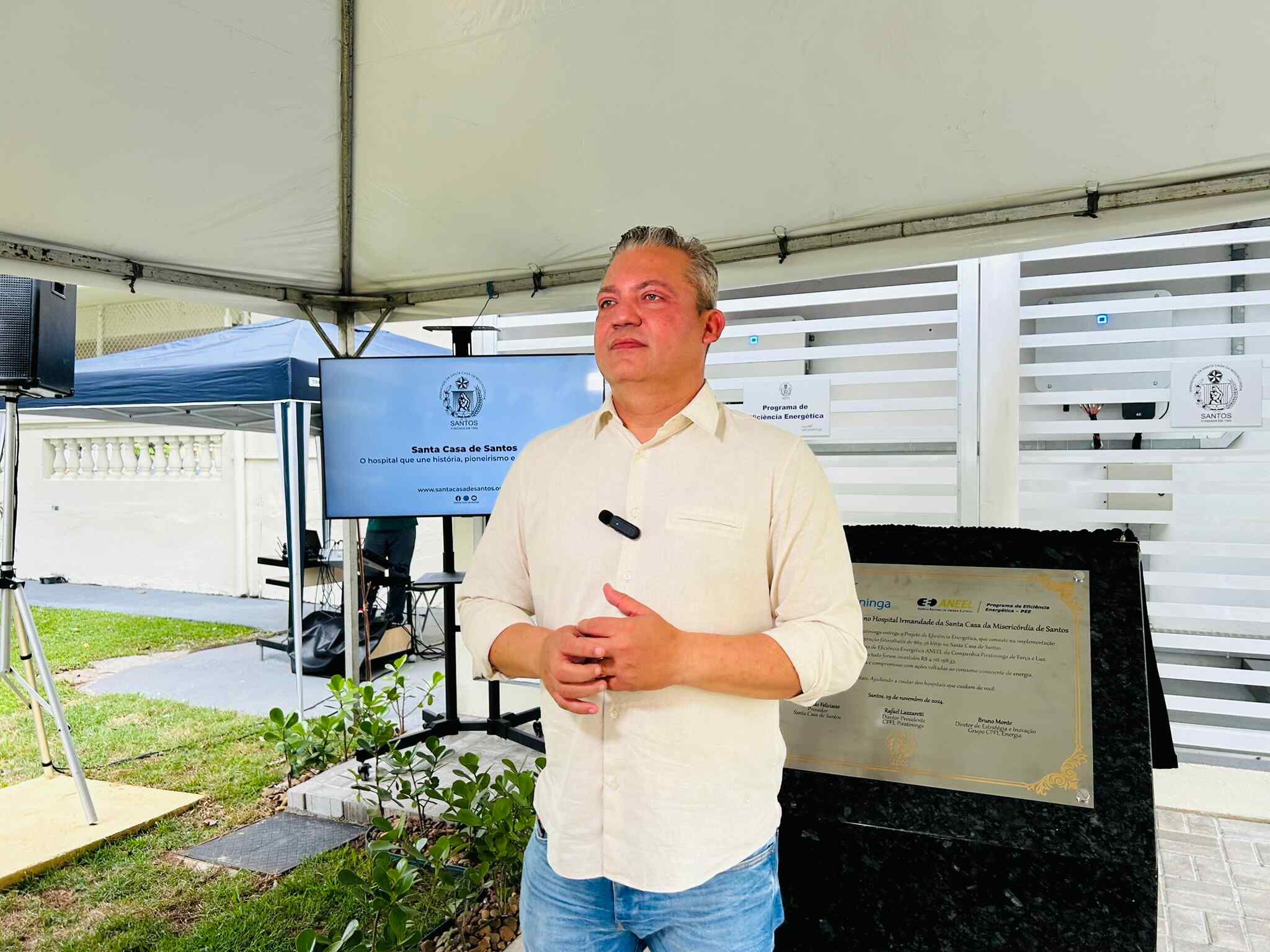 A entrega oficial do Sistema de Energia Fotovoltaica da Santa Casa de Santos aconteceu no dia 29/11/24, em solenidade que contou com o provedor do hospital, Ariovaldo Feliciano, o diretor presidente da CPFL Piratininga, Rafael Lazzaretti, e do diretor de Estratégia e Inovação do Grupo CPFL Energia, Bruno Monte.
