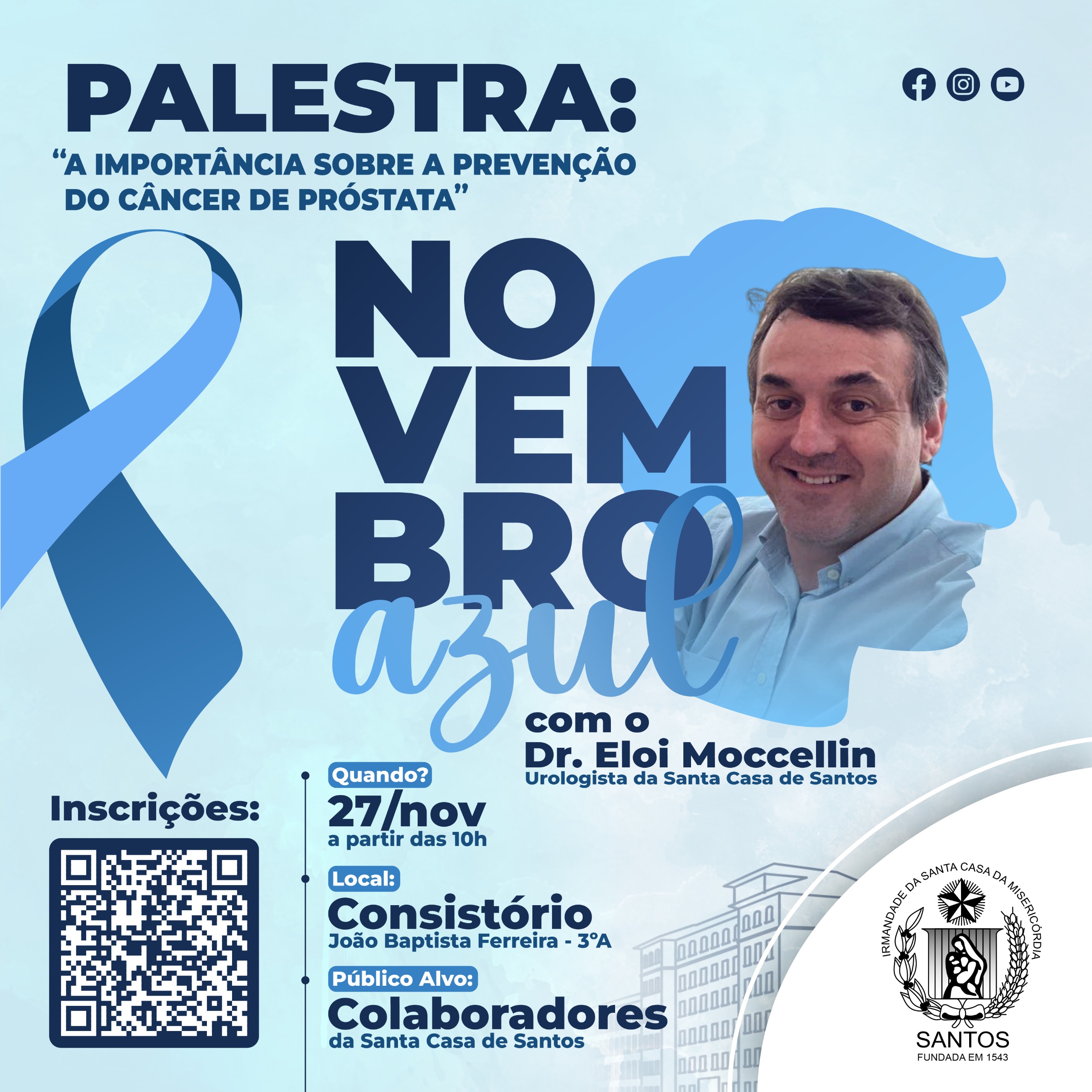 No dia 27/11, às 10h, o Setor de Medicina do Trabalho da Santa Casa de Santos promoverá o evento institucional “Novembro Azul – A importância da prevenção do câncer de próstata”, com palestras da nutricionista, Rita de Cássia, e do urologista, Dr. Eloi Moccellin.