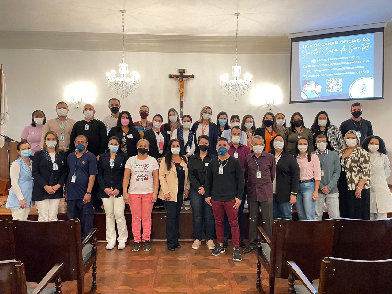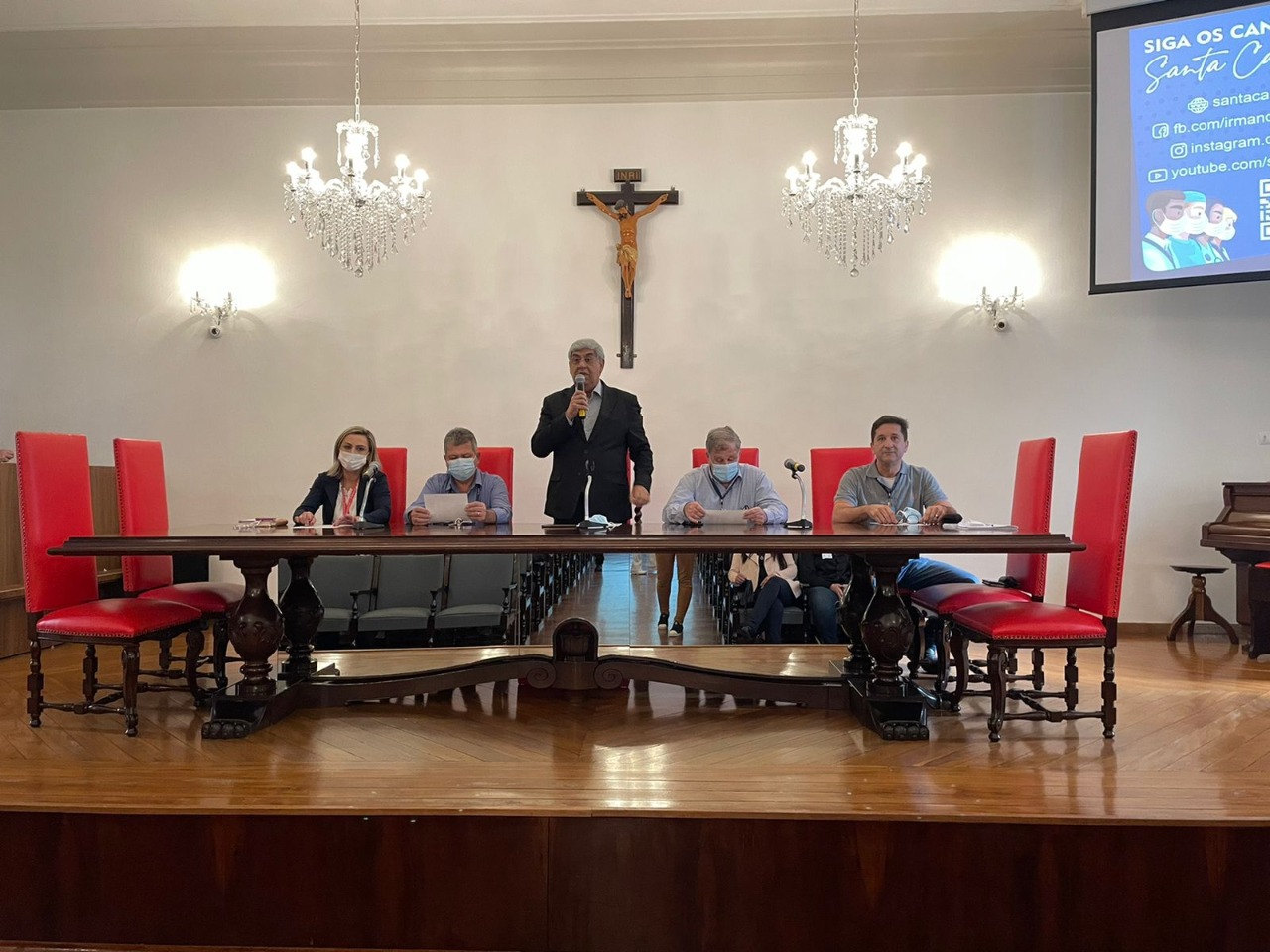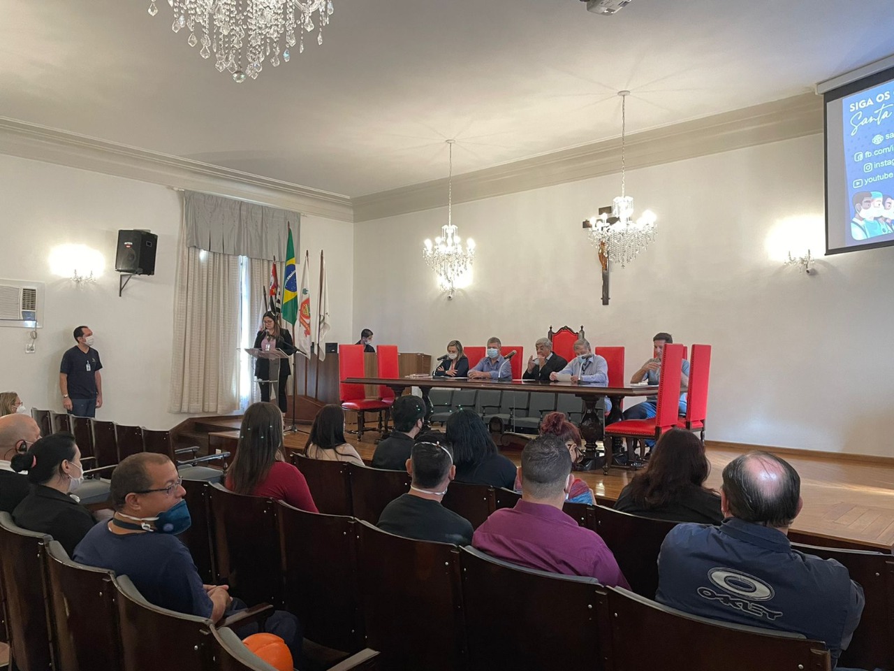 Na mesa de honra, tomaram lugar: o vice provedor, Carlos Teixeira Filho; o 2º tesoureiro, Antônio Carvalho; o diretor de Apoio, Octavio Tavolaro Filho; o presidente da CIPA gestão 2021/2022, Ricardo Guarmani; e a nova presidente da CIPA gestão 2022/2023, Enfª Suzana Gomes.