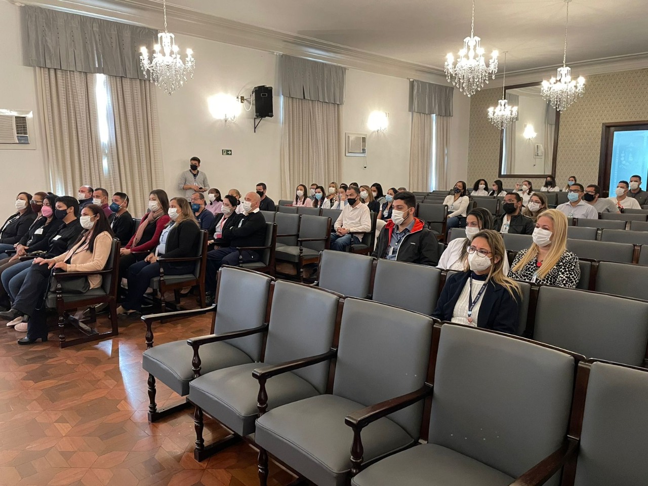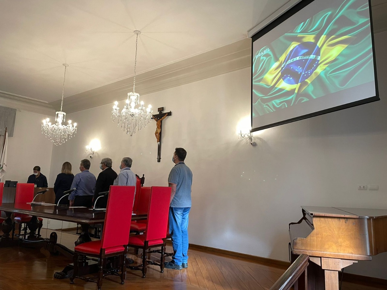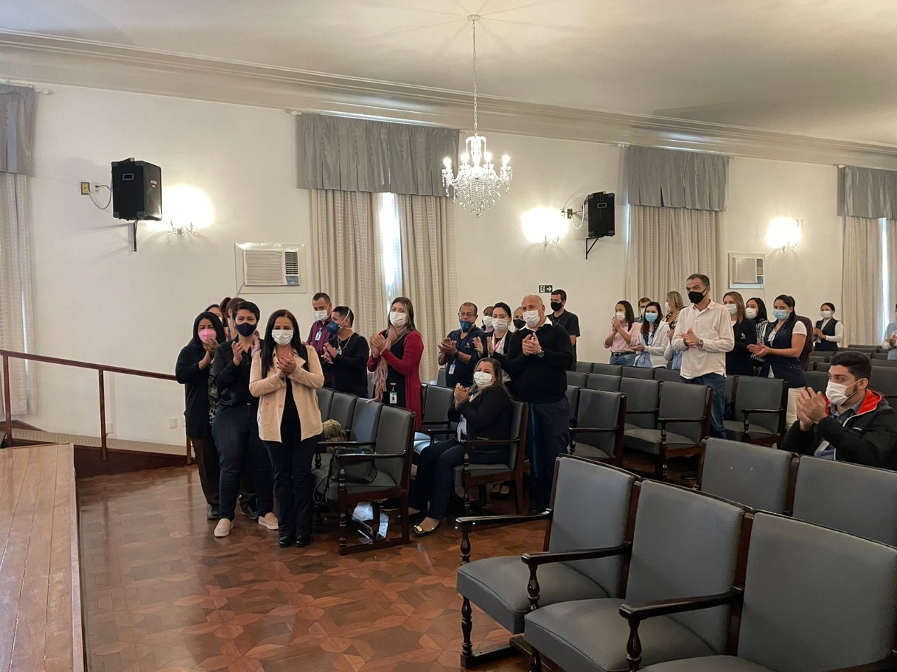 Na mesa de honra, tomaram lugar: o vice provedor, Carlos Teixeira Filho; o 2º tesoureiro, Antônio Carvalho; o diretor de Apoio, Octavio Tavolaro Filho; o presidente da CIPA gestão 2021/2022, Ricardo Guarmani; e a nova presidente da CIPA gestão 2022/2023, Enfª Suzana Gomes.