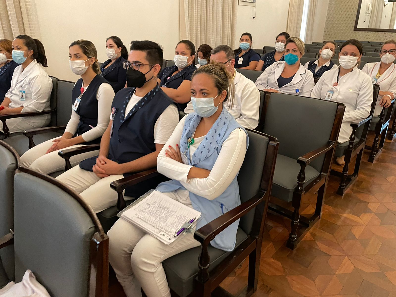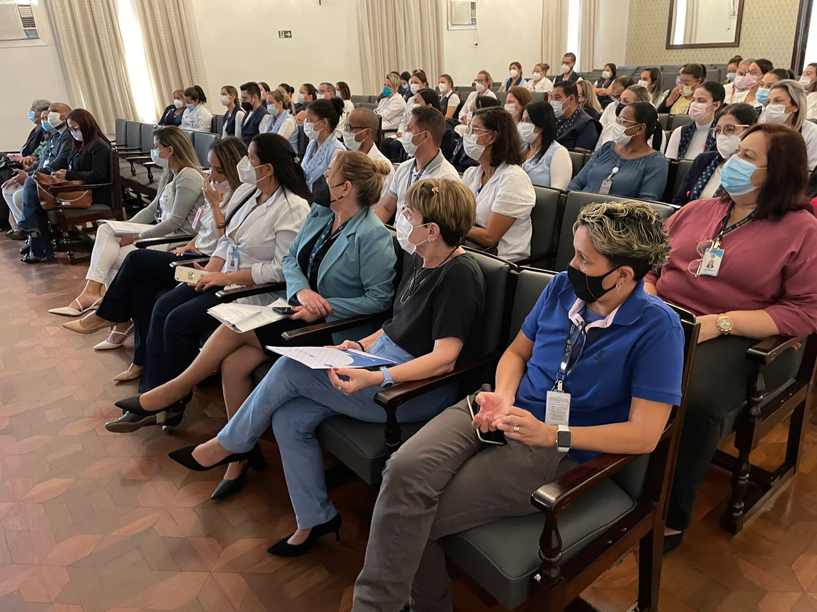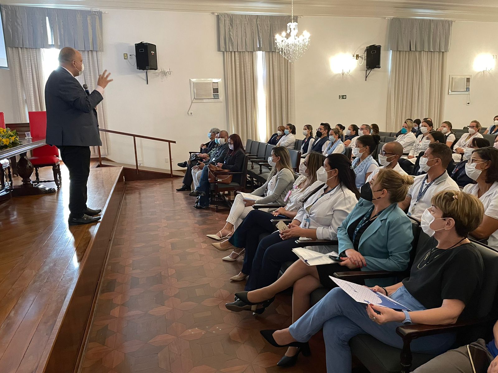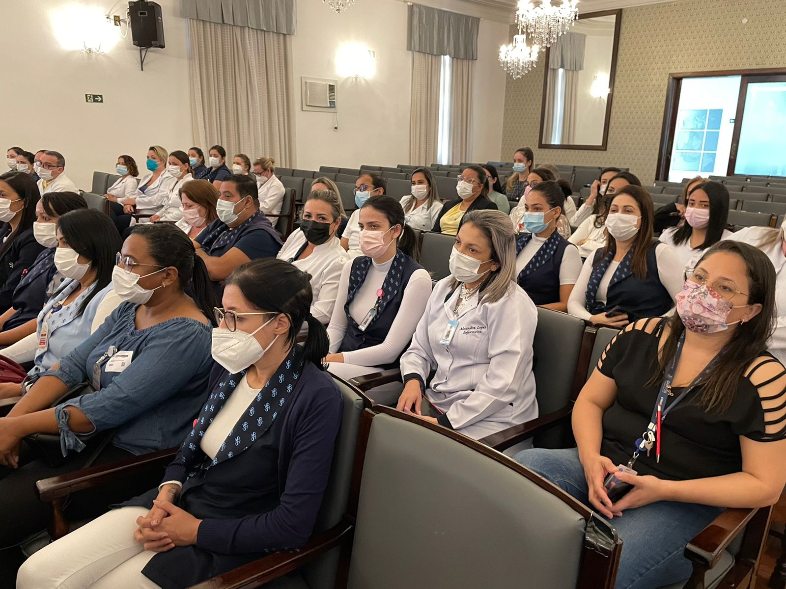 Para mesa de honra, foram convidados a tomar lugar: o vice provedor, Carlos Teixeira Filho; a gerente de Enfermagem, Alessandra Roberto Conceição Manetta; o presidente do Coren-SP, James Francisco dos Santos; e a coordenadora das Comissões de Ética do Coren-SP, Ivete Losada Alves Trotti.
