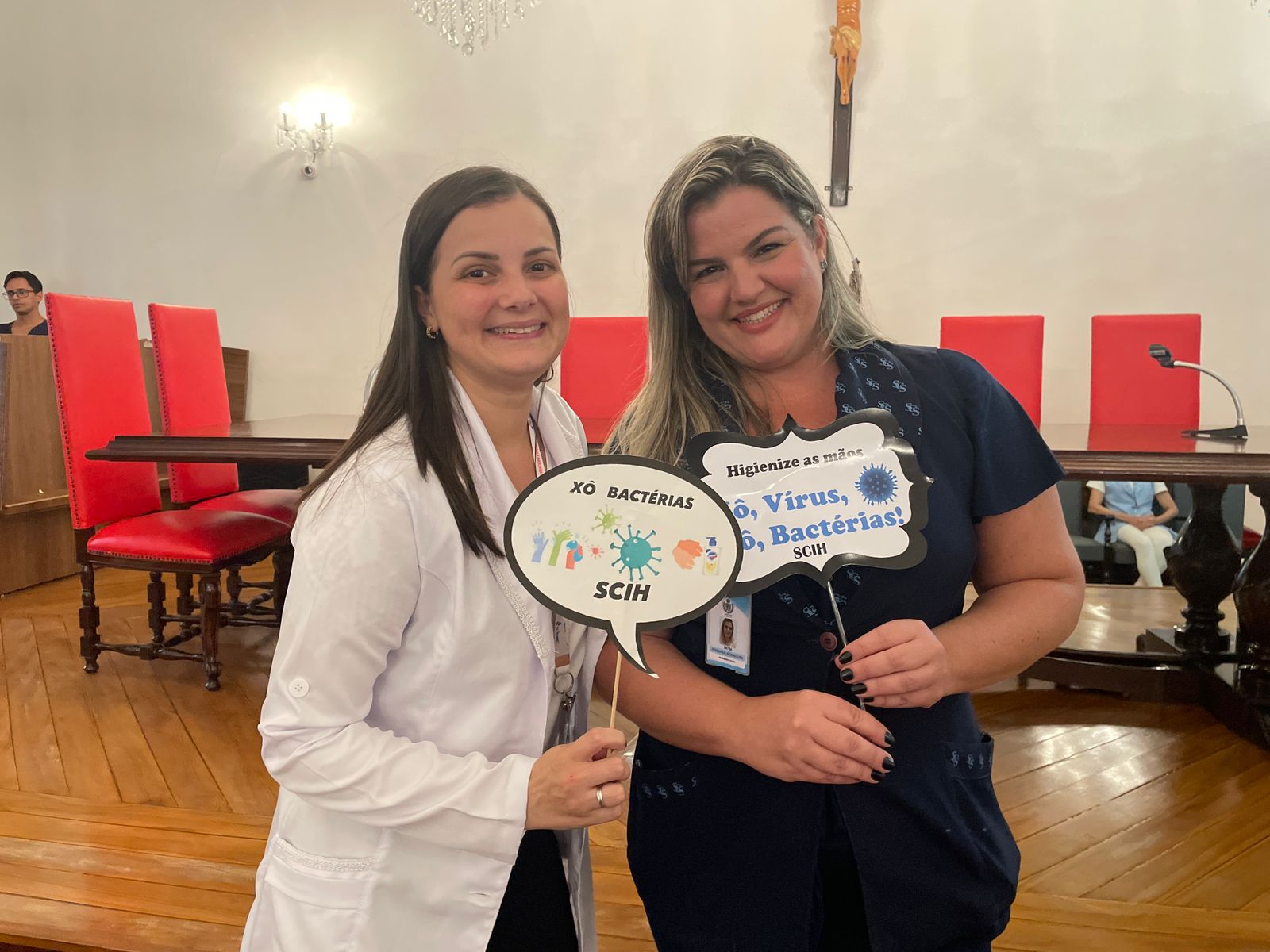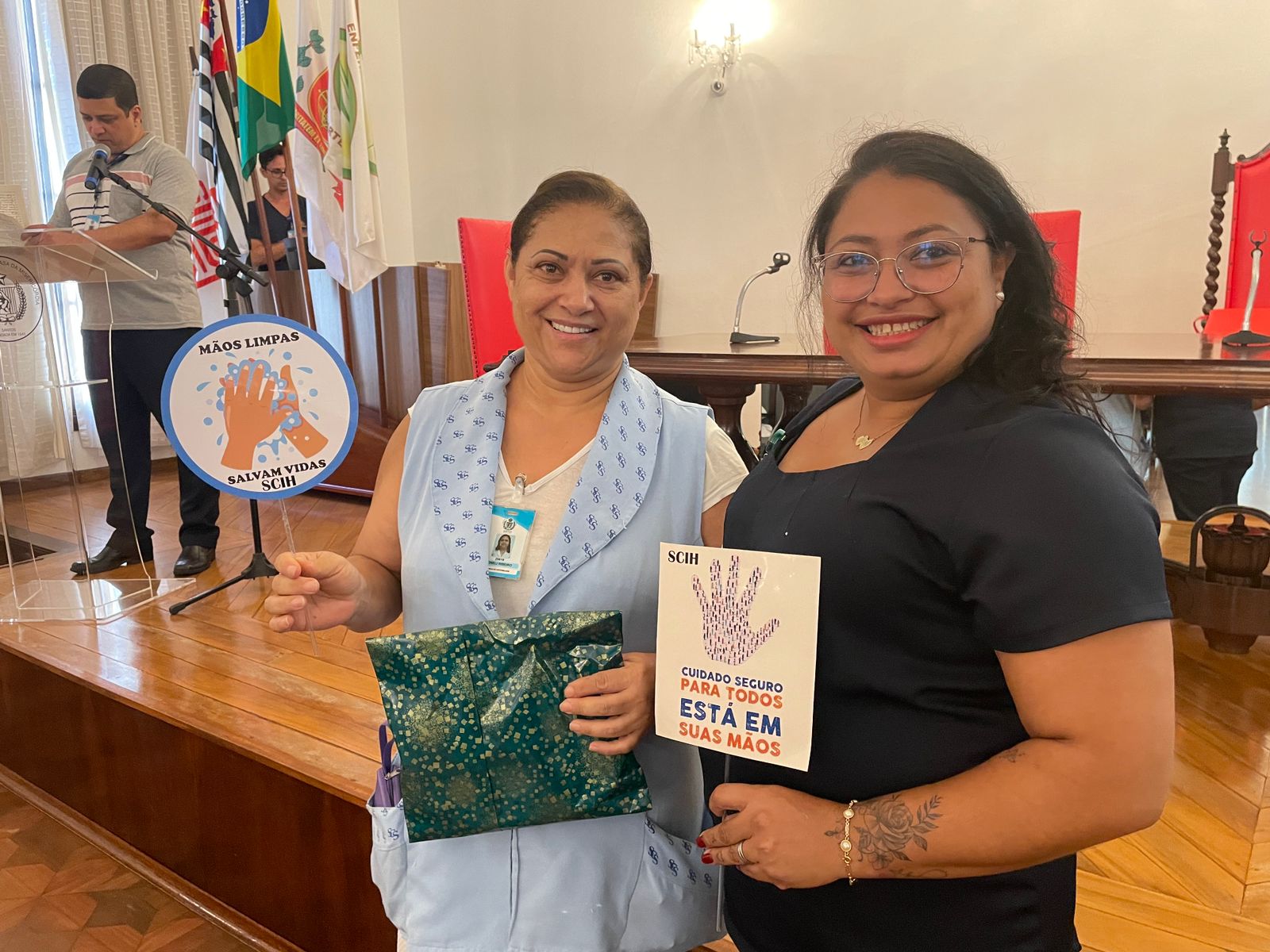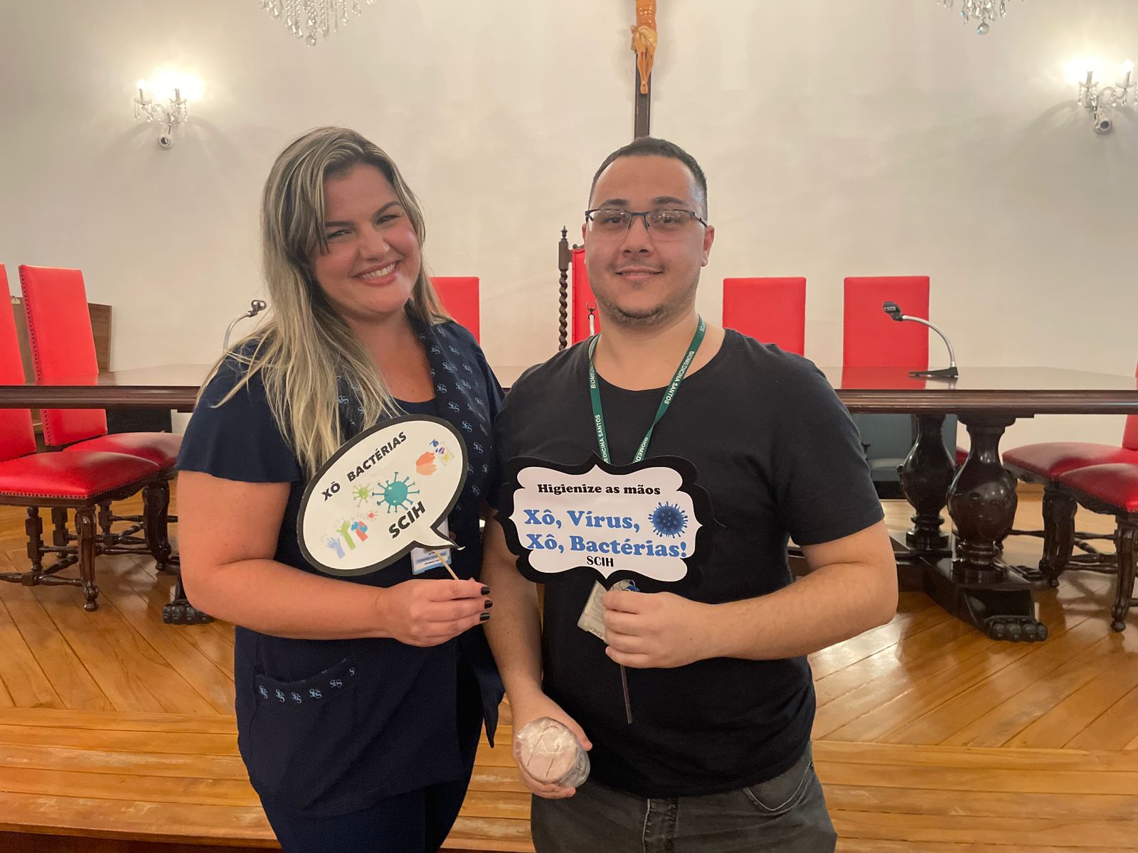 Na última terça-feira, 7 de maio, o Consistório da Santa Casa de Santos recebeu duas palestras com o tema: O Impacto da Higienização das Mãos em Ambiente Hospitalar. No período da tarde, foi ministrada pelo Médico Infectologista e Presidente da Comissão de Controle de Infecção Hospitalar (CCIH), Dr. Sérgio Feijoó Rodriguez. E para os colaboradores do período noturno, a palestra foi ministrada pela Enfermeira do Serviço de Controle de Infecção Hospitalar (SCIH), Olivia Guedes Silva. Ao final do evento teve sorteio de brindes aos participantes. Ao todo, 180 colaboradores assistiram o curso.
