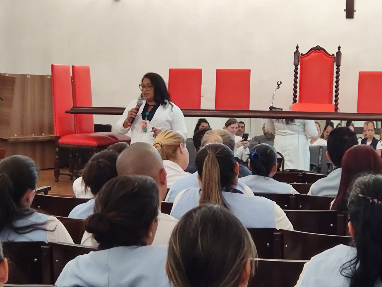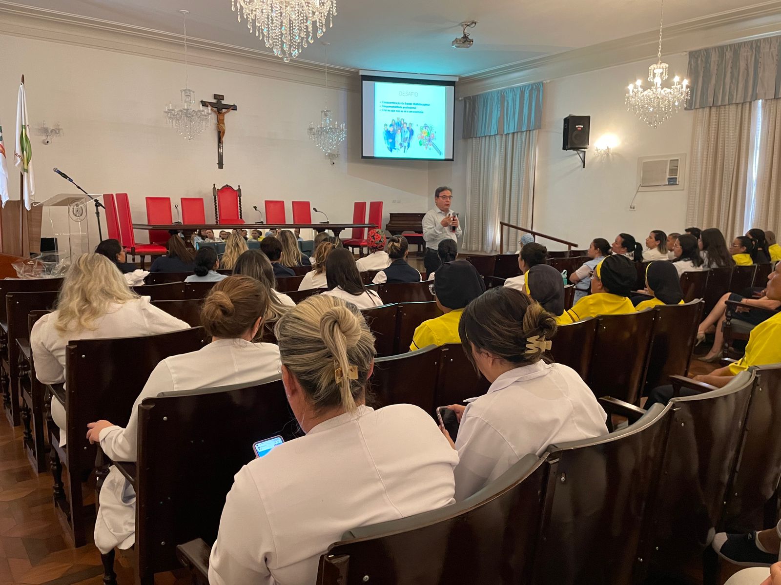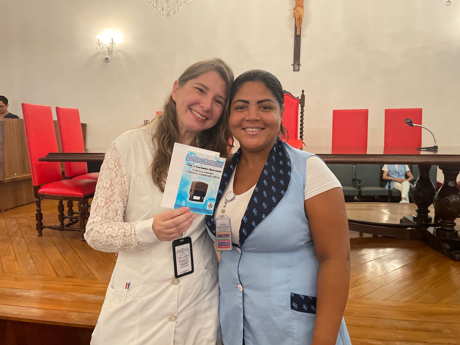 Na última terça-feira, 7 de maio, o Consistório da Santa Casa de Santos recebeu duas palestras com o tema: O Impacto da Higienização das Mãos em Ambiente Hospitalar. No período da tarde, foi ministrada pelo Médico Infectologista e Presidente da Comissão de Controle de Infecção Hospitalar (CCIH), Dr. Sérgio Feijoó Rodriguez. E para os colaboradores do período noturno, a palestra foi ministrada pela Enfermeira do Serviço de Controle de Infecção Hospitalar (SCIH), Olivia Guedes Silva. Ao final do evento teve sorteio de brindes aos participantes. Ao todo, 180 colaboradores assistiram o curso.