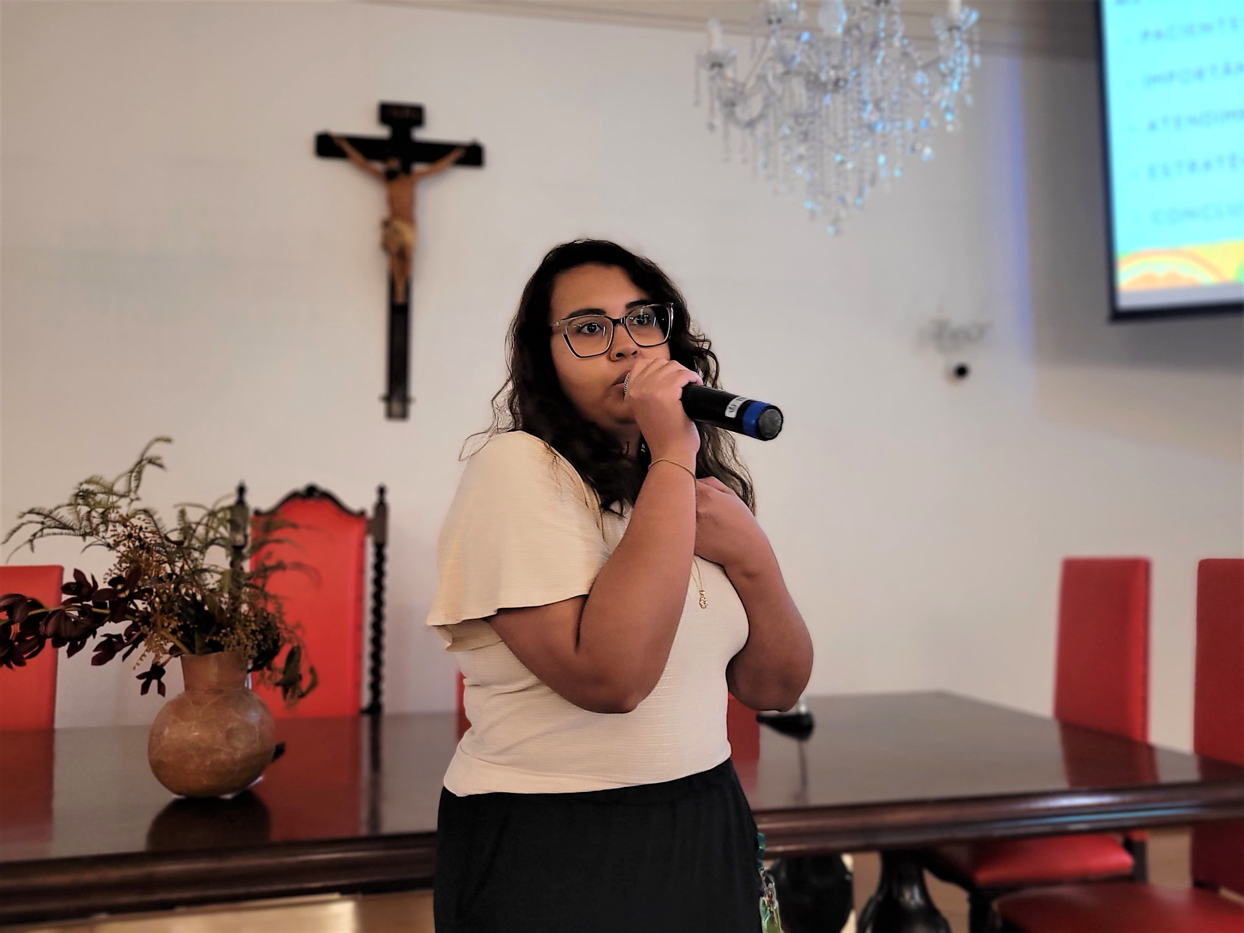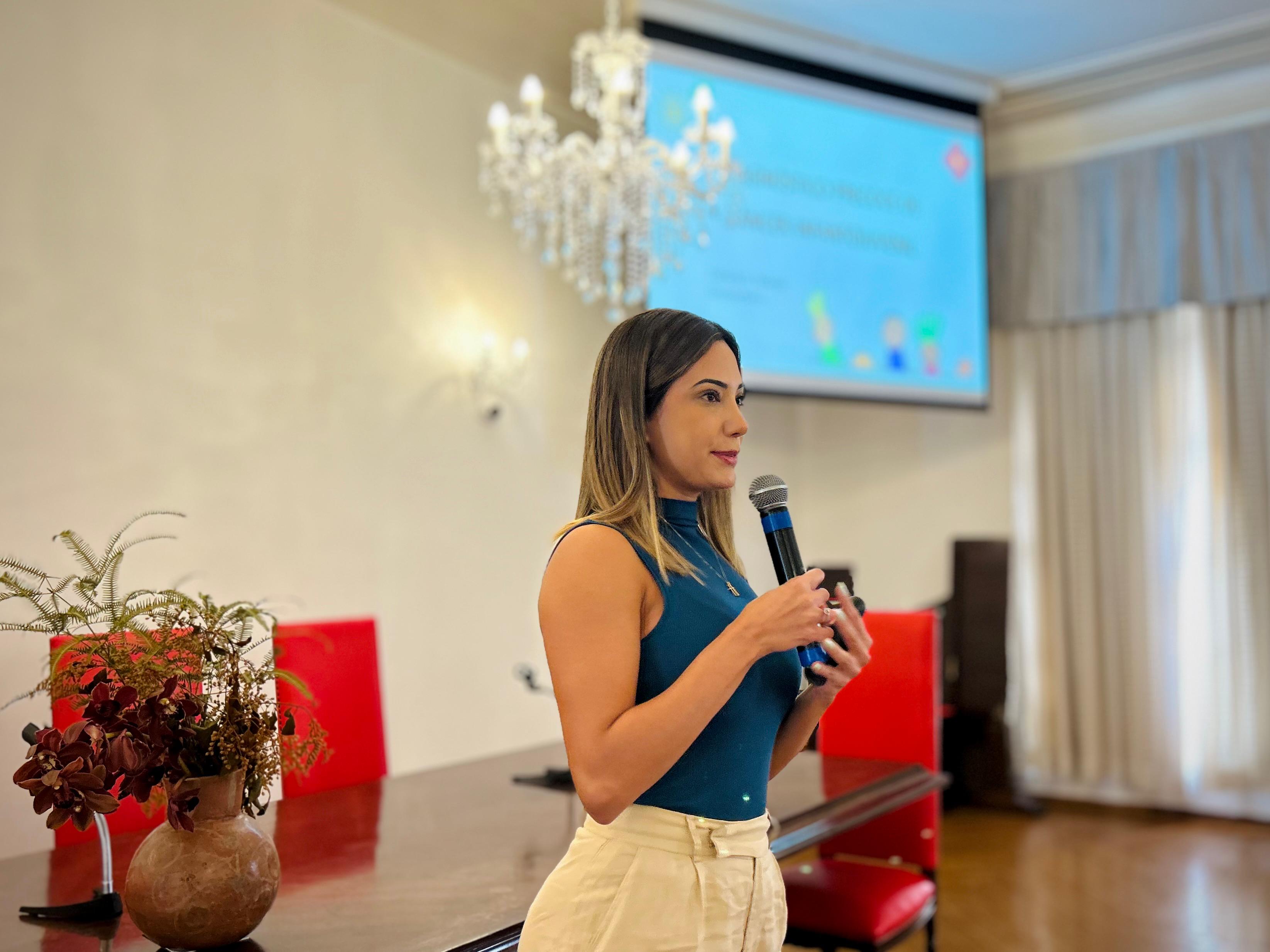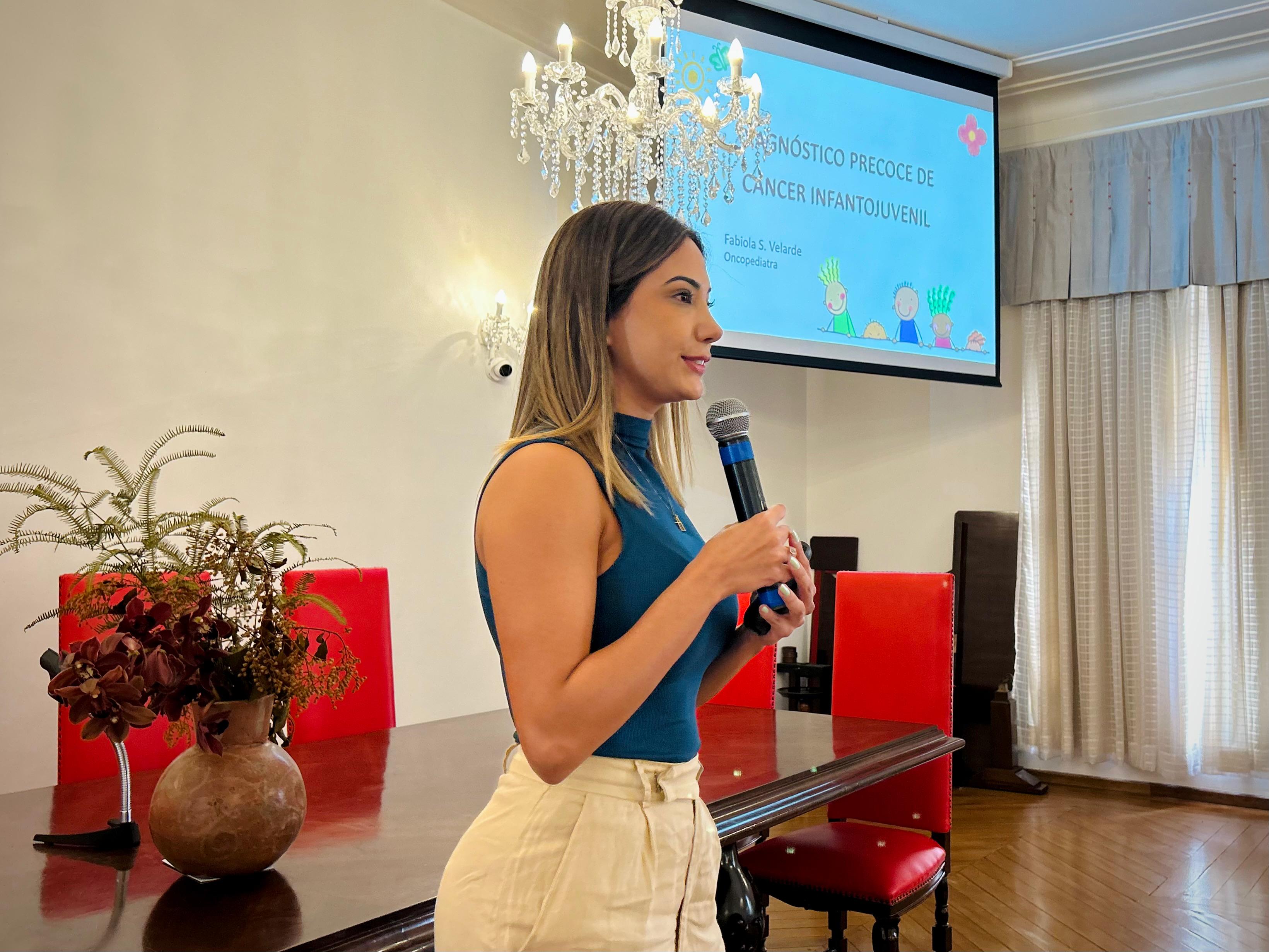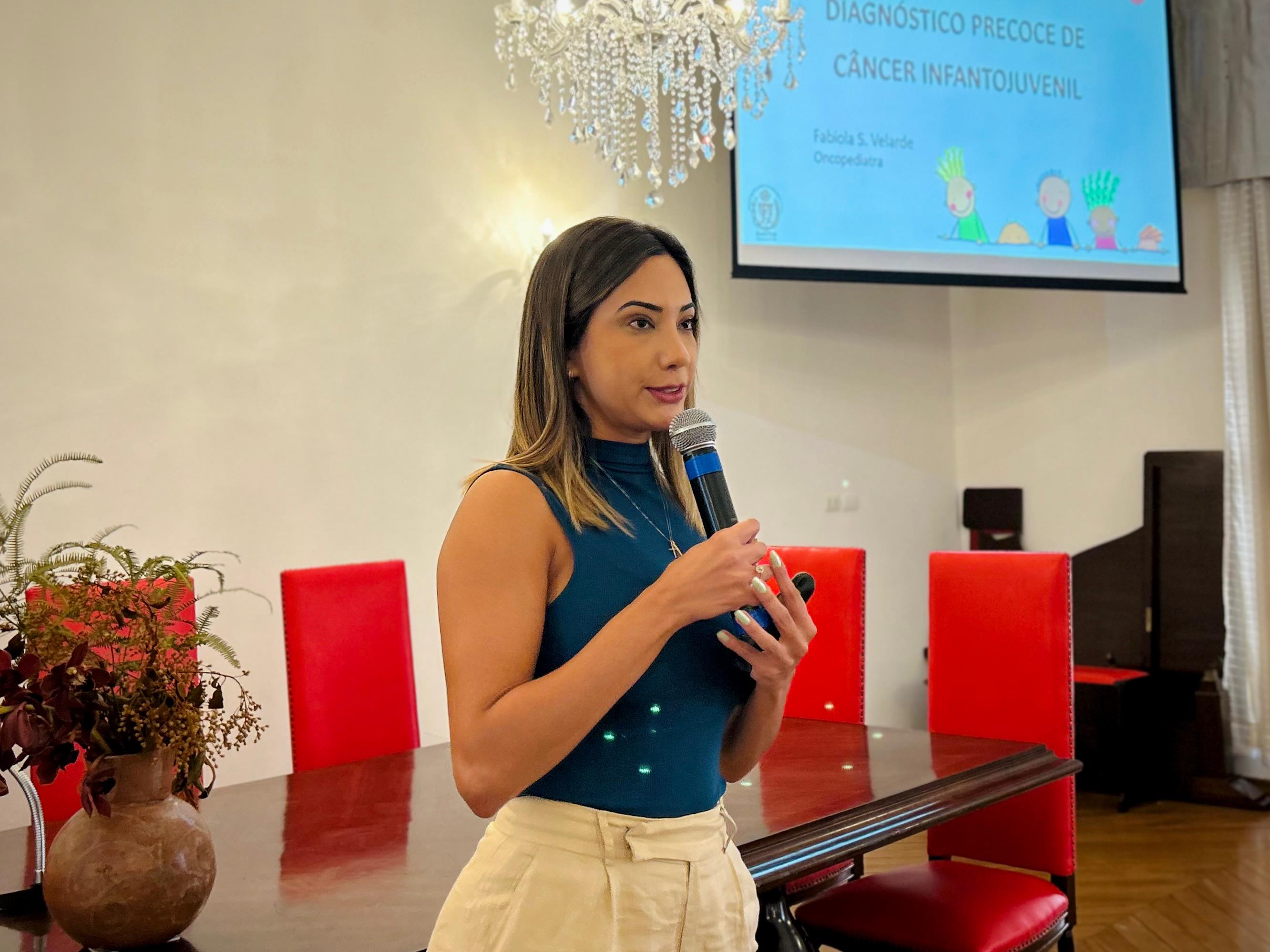 A segunda palestra foi com a médica oncologista pediátrica responsável pelo Serviço de Oncopediatra da Santa Casa, Drª. Fabiola Velarde, que falou sobre os sinais e sintomas do câncer, e a importância do diagnóstico precoce. Drª. Fabiola também explicou que a causa do câncer infanto juvenil ainda é desconhecida.