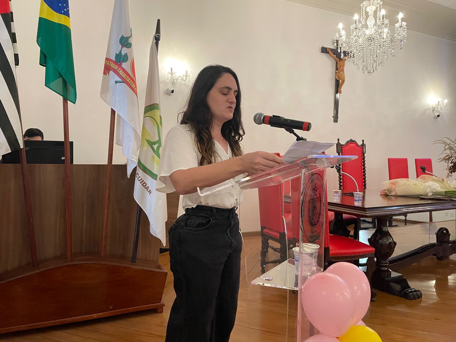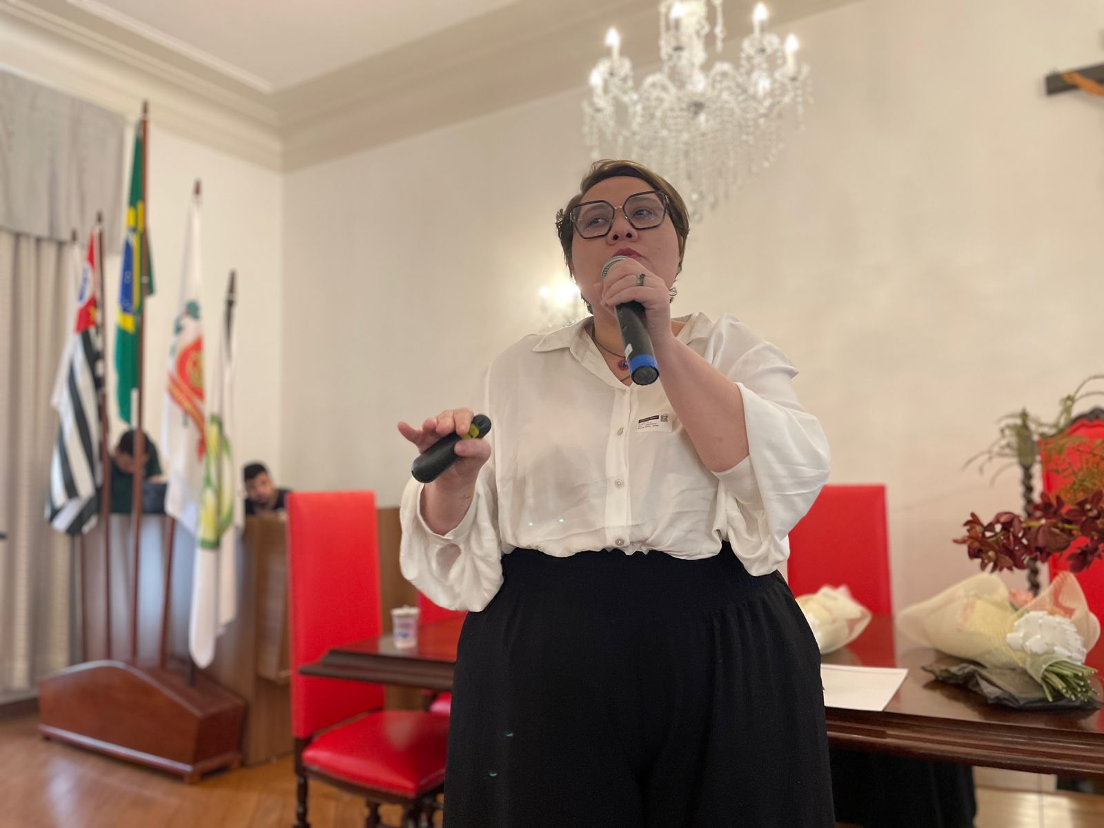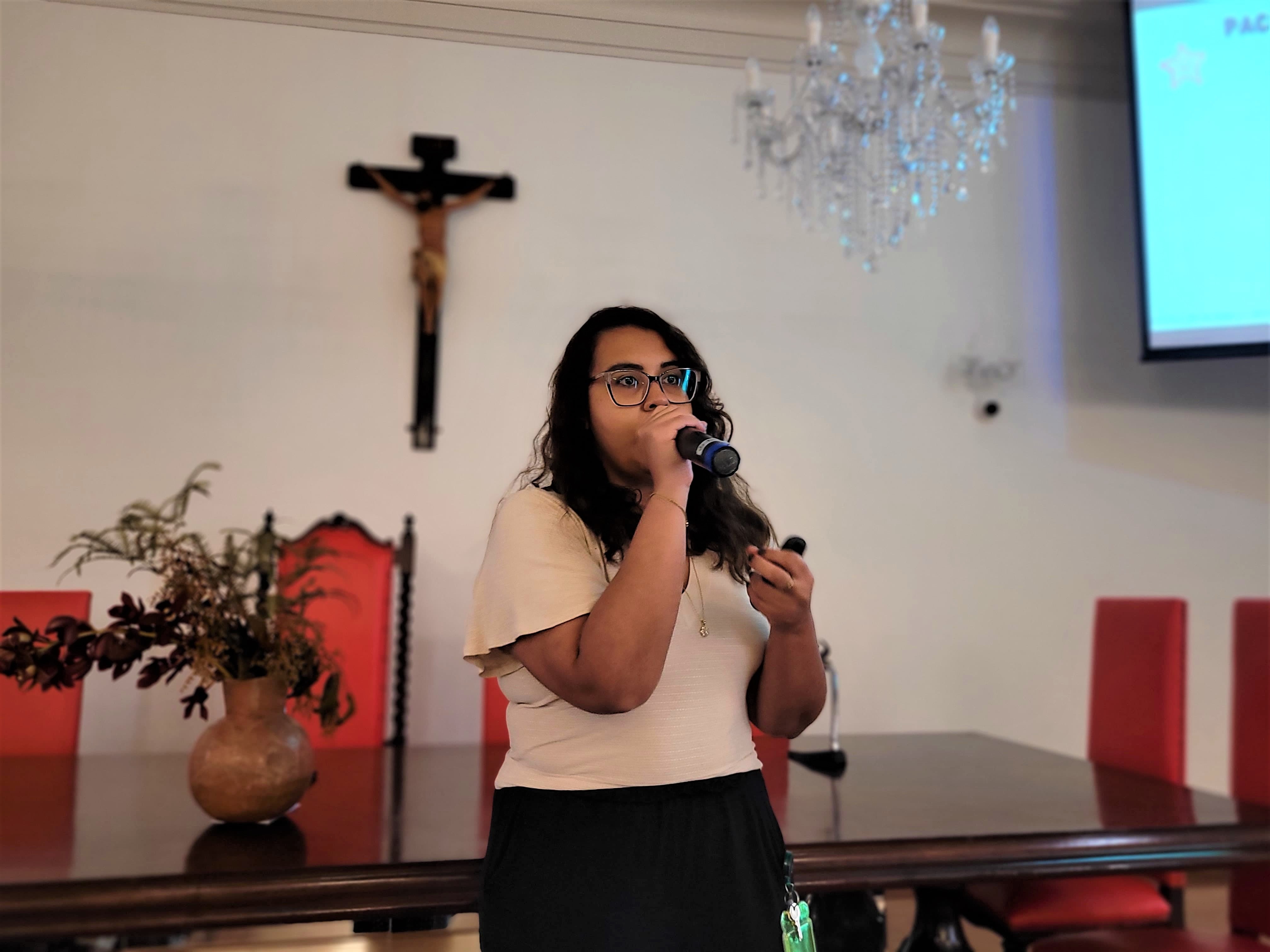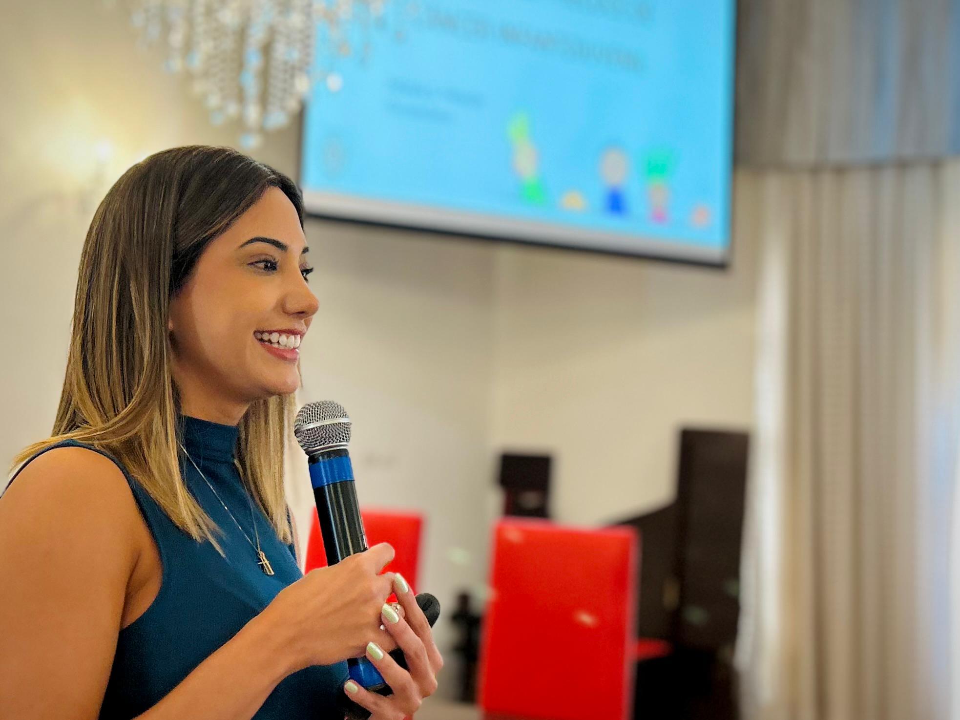 A segunda palestra foi com a médica oncologista pediátrica responsável pelo Serviço de Oncopediatra da Santa Casa, Drª. Fabiola Velarde, que falou sobre os sinais e sintomas do câncer, e a importância do diagnóstico precoce. Drª. Fabiola também explicou que a causa do câncer infanto juvenil ainda é desconhecida.