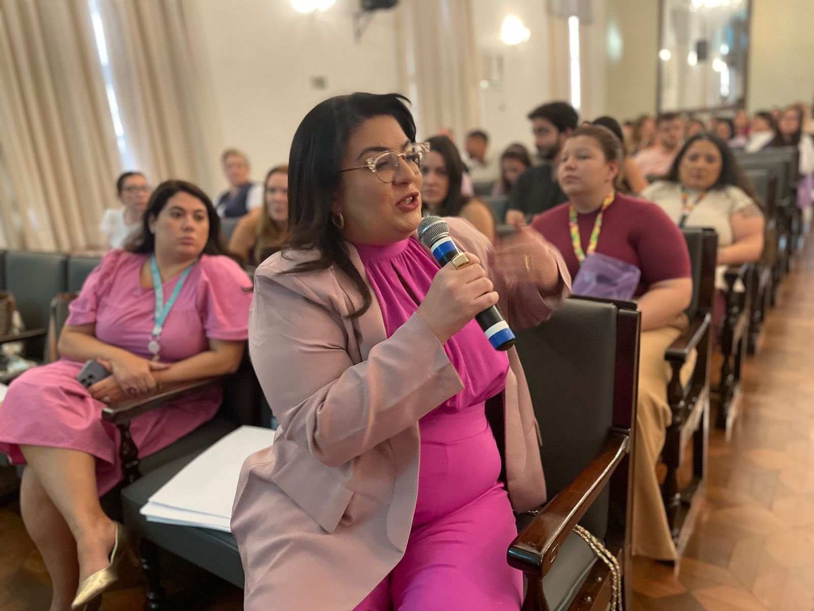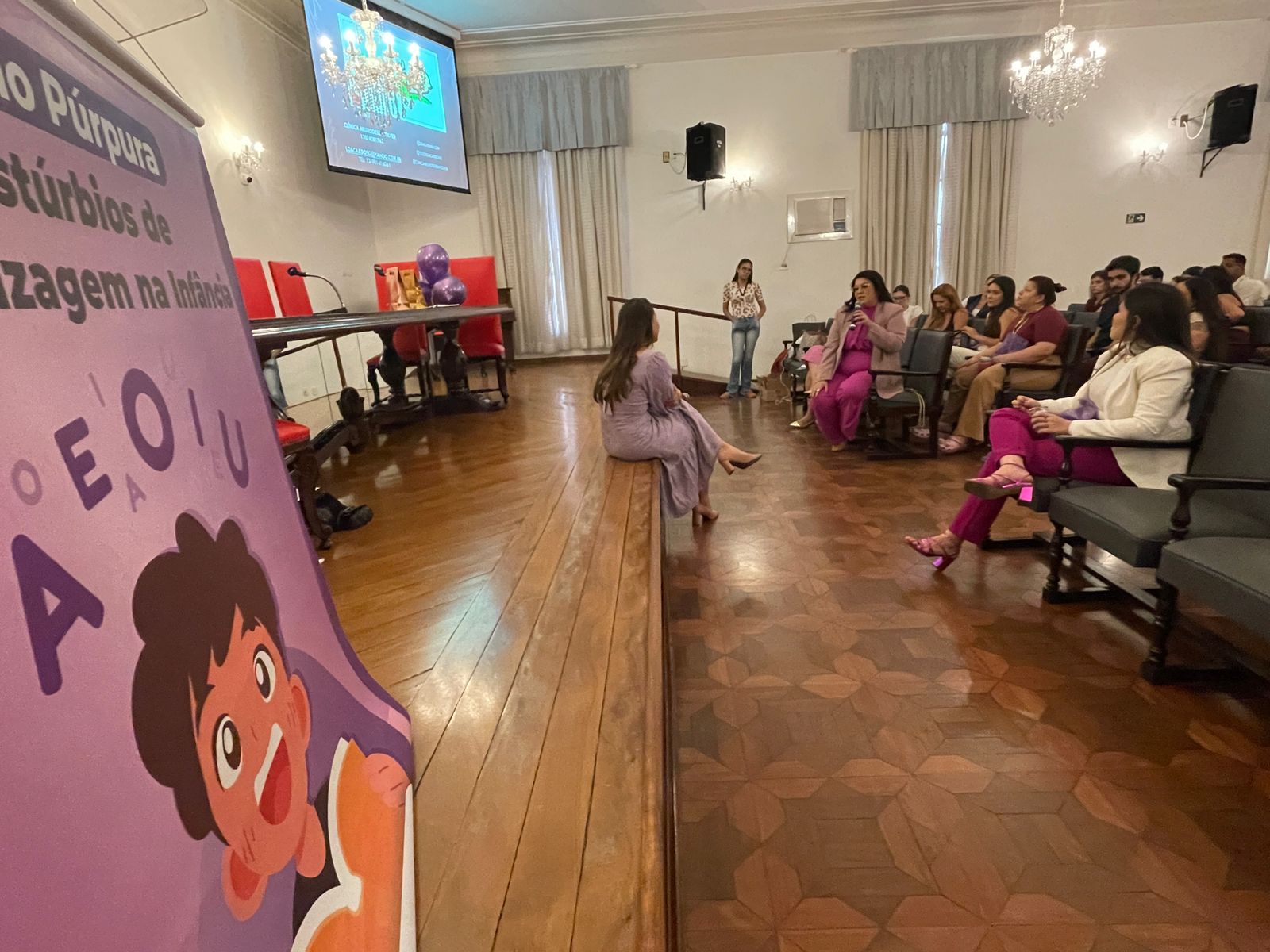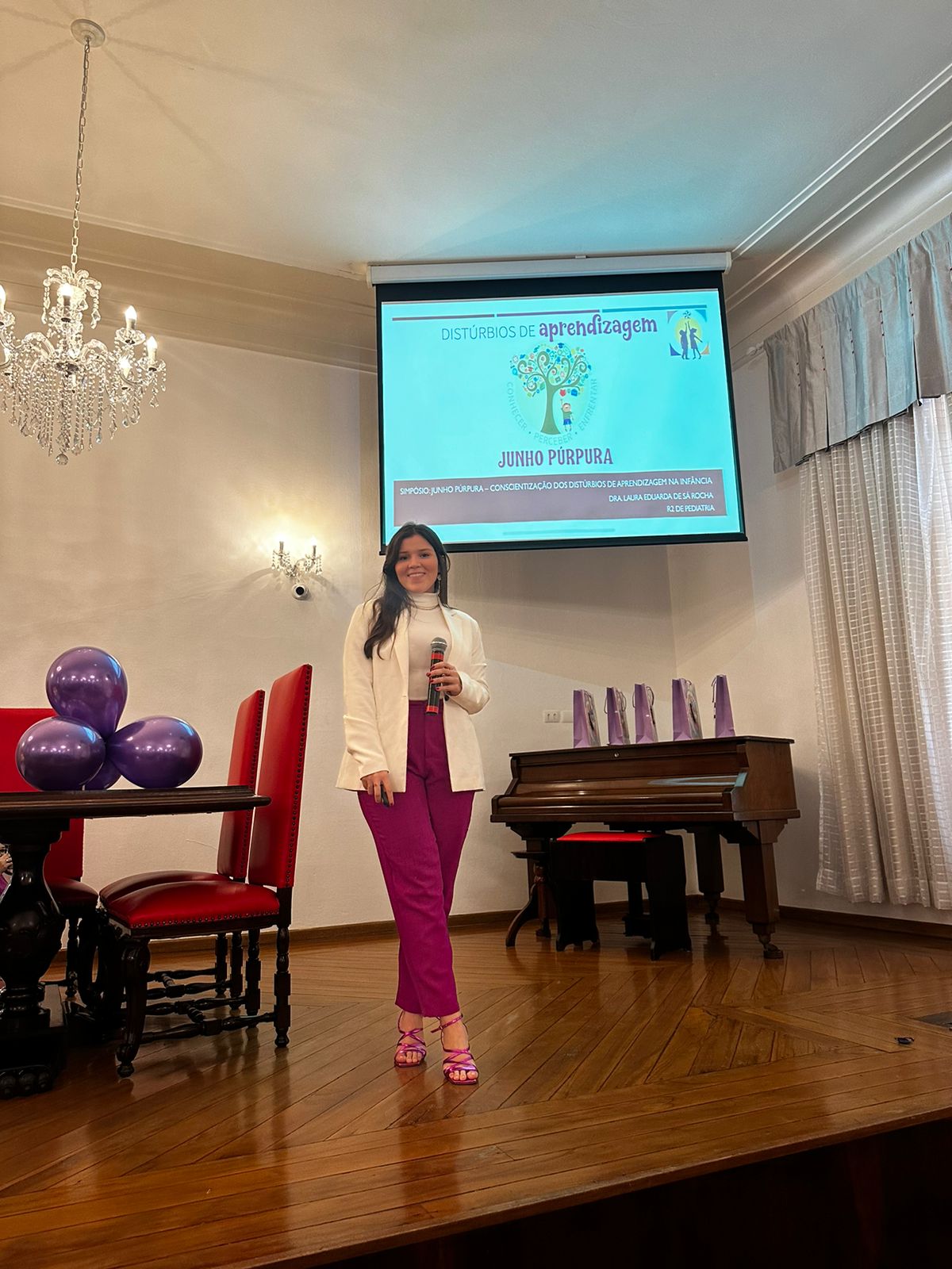 A primeira palestra foi ministrada pela médica residente da Pediatria, Drª. Aline Onahara, que falou sobre a campanha Junho Púrpura, seus objetivos e a importância dos distúrbios de aprendizagem no contexto pediátrico.