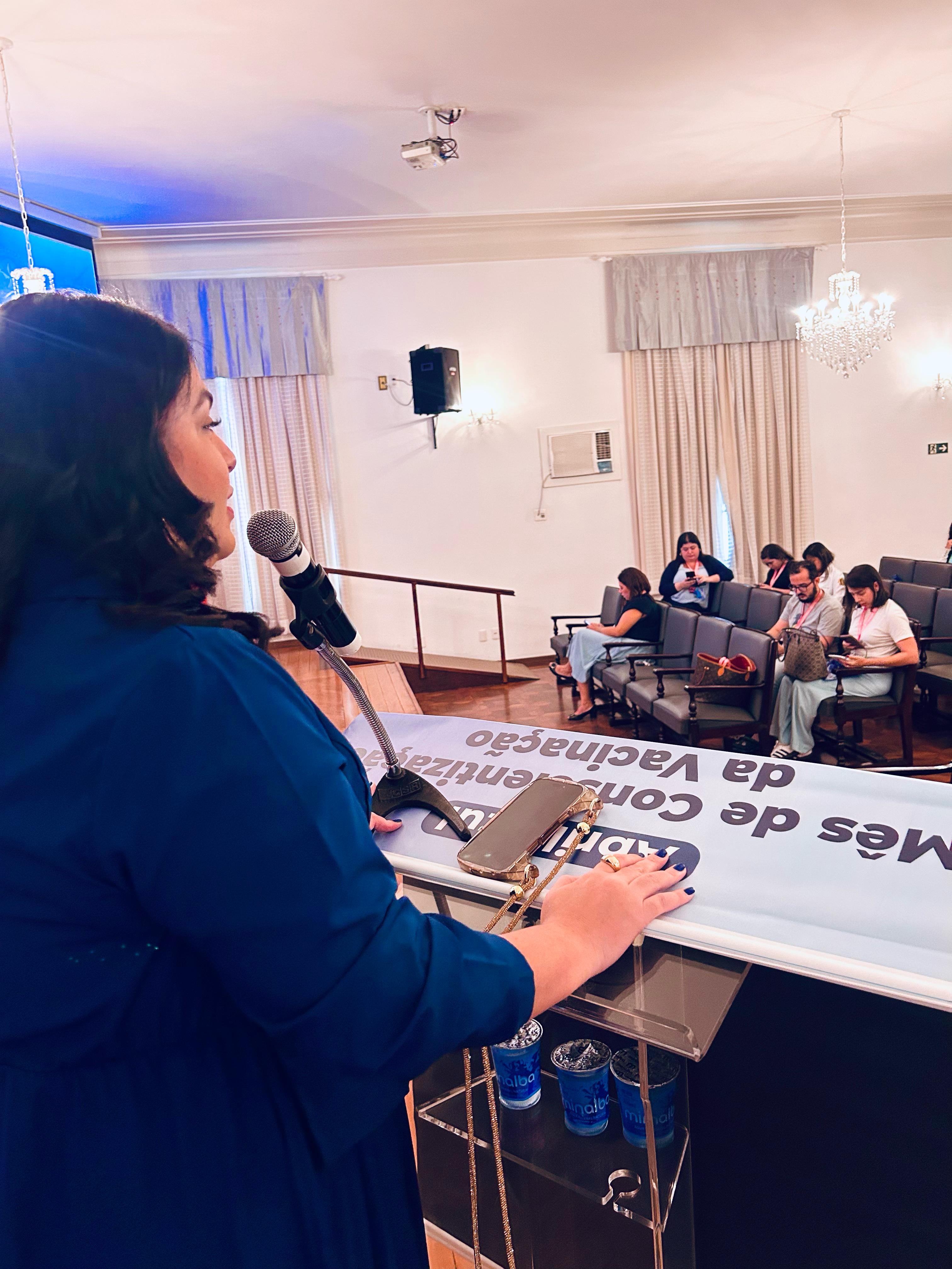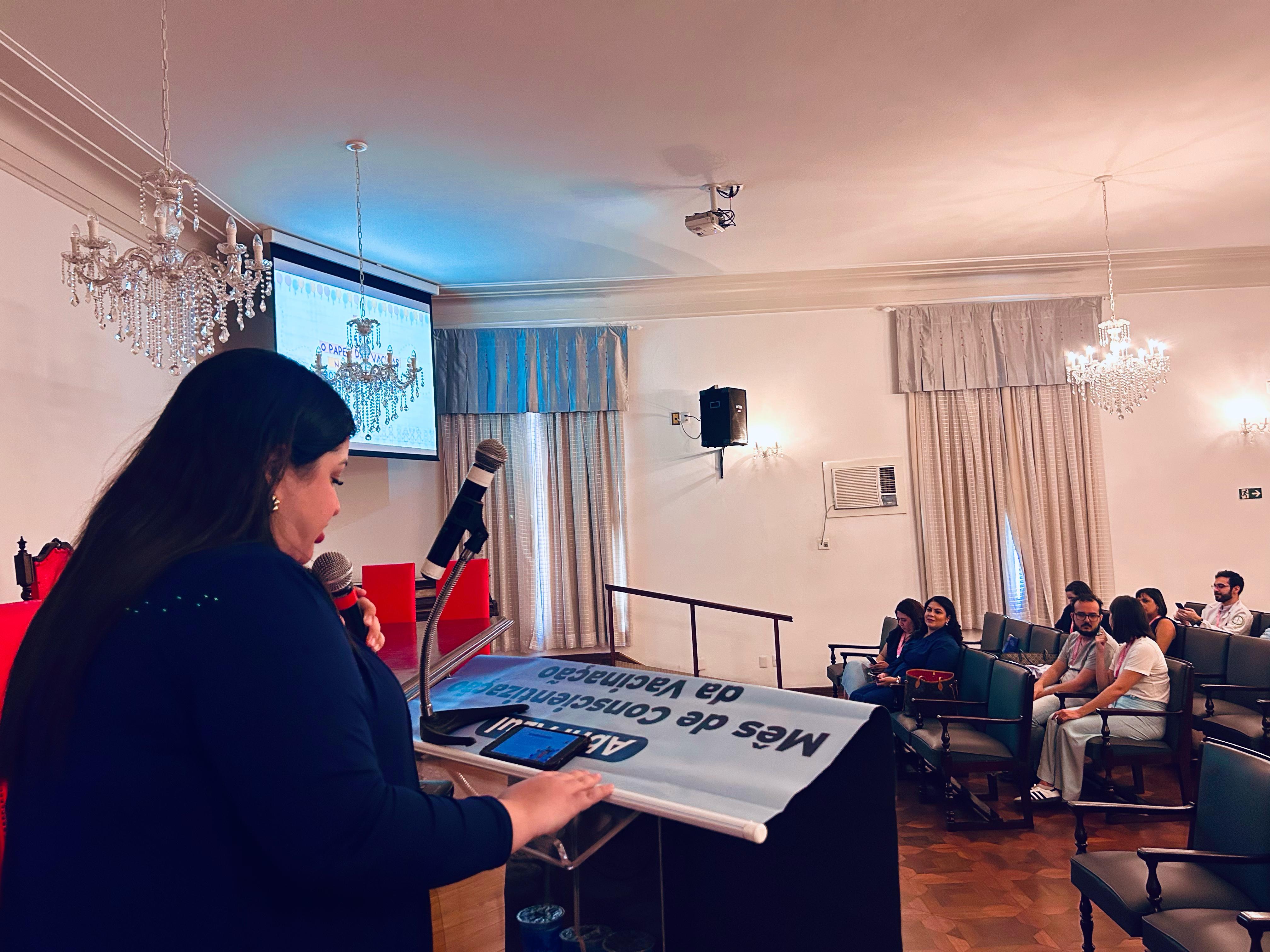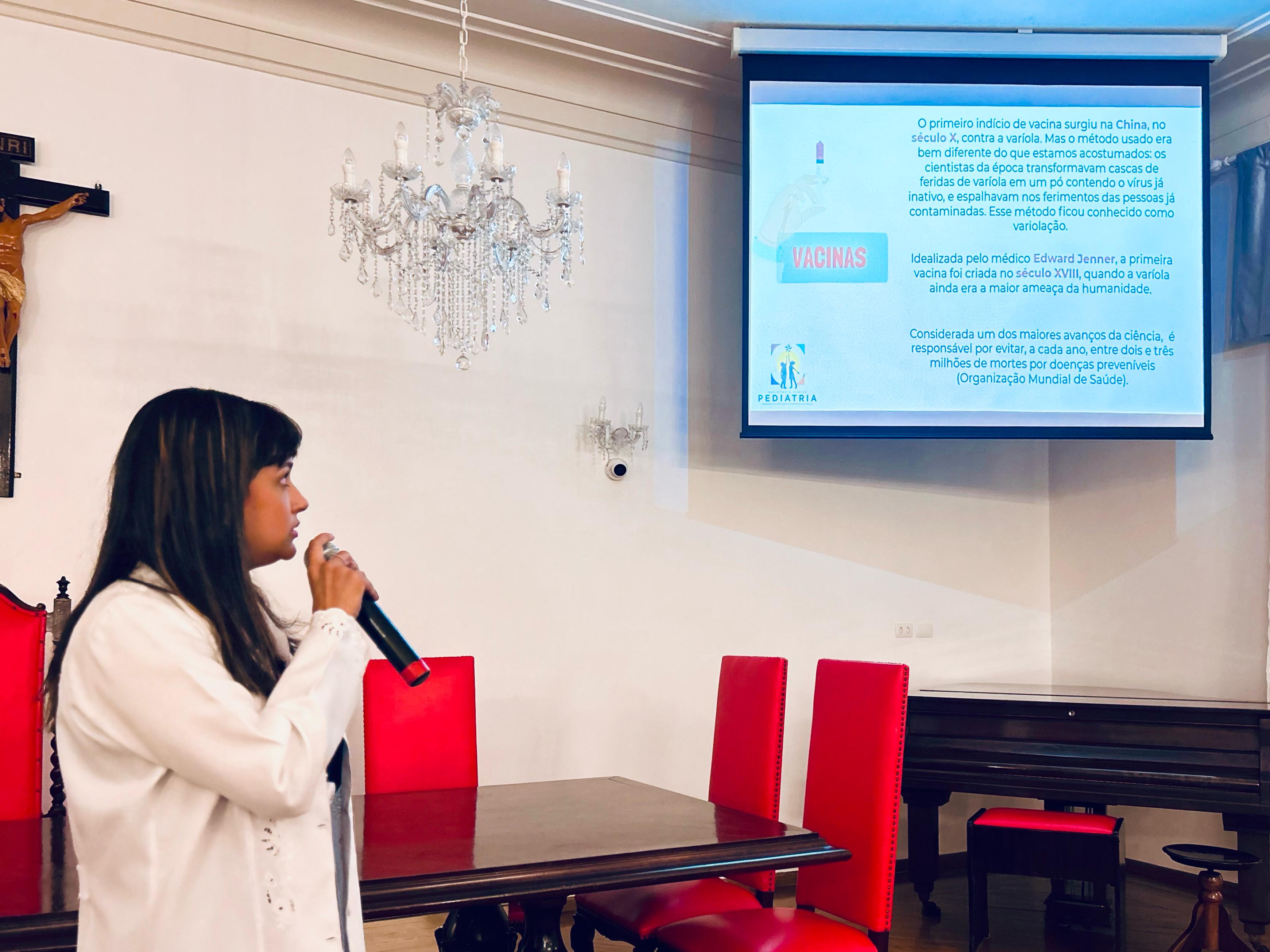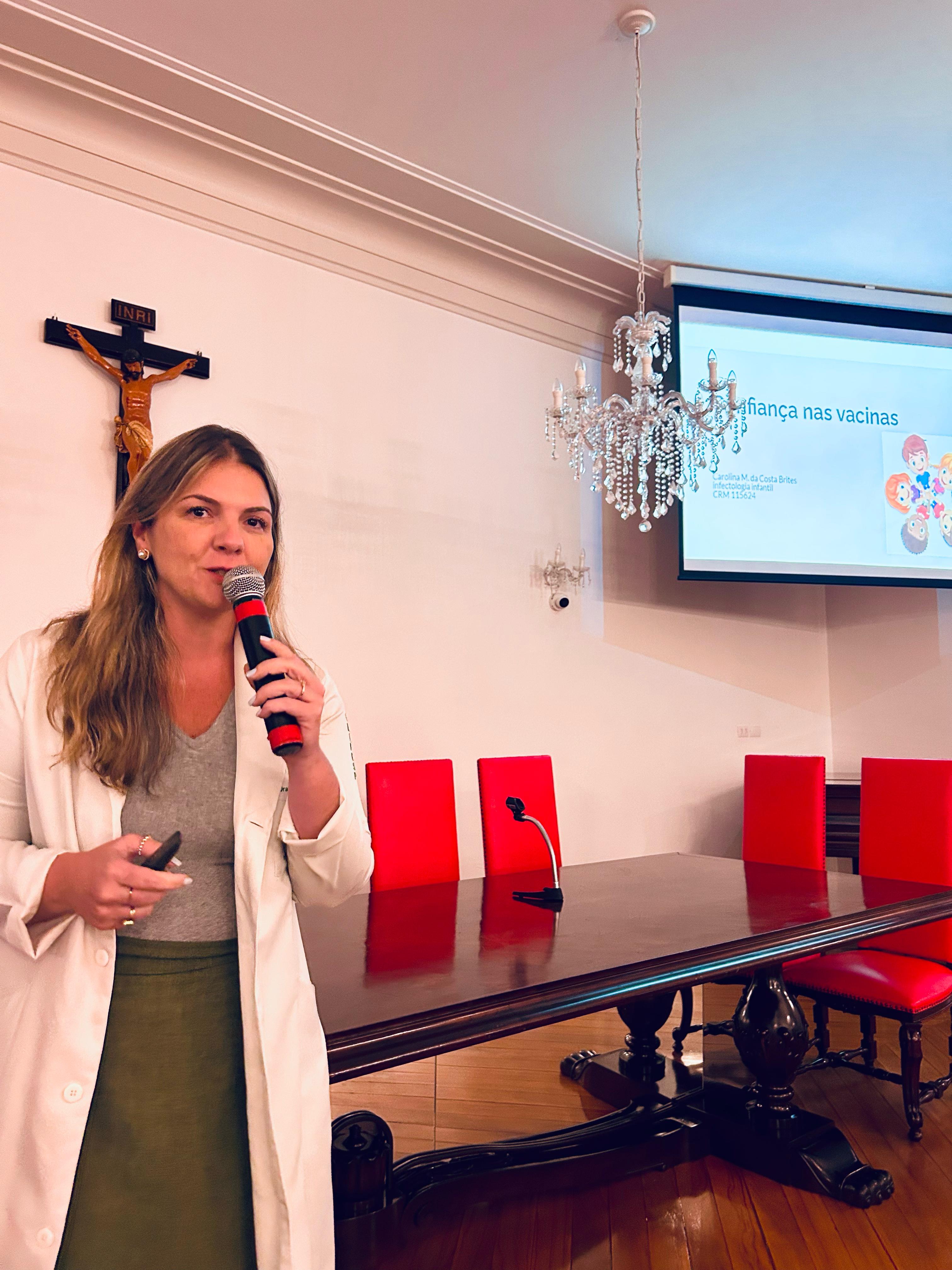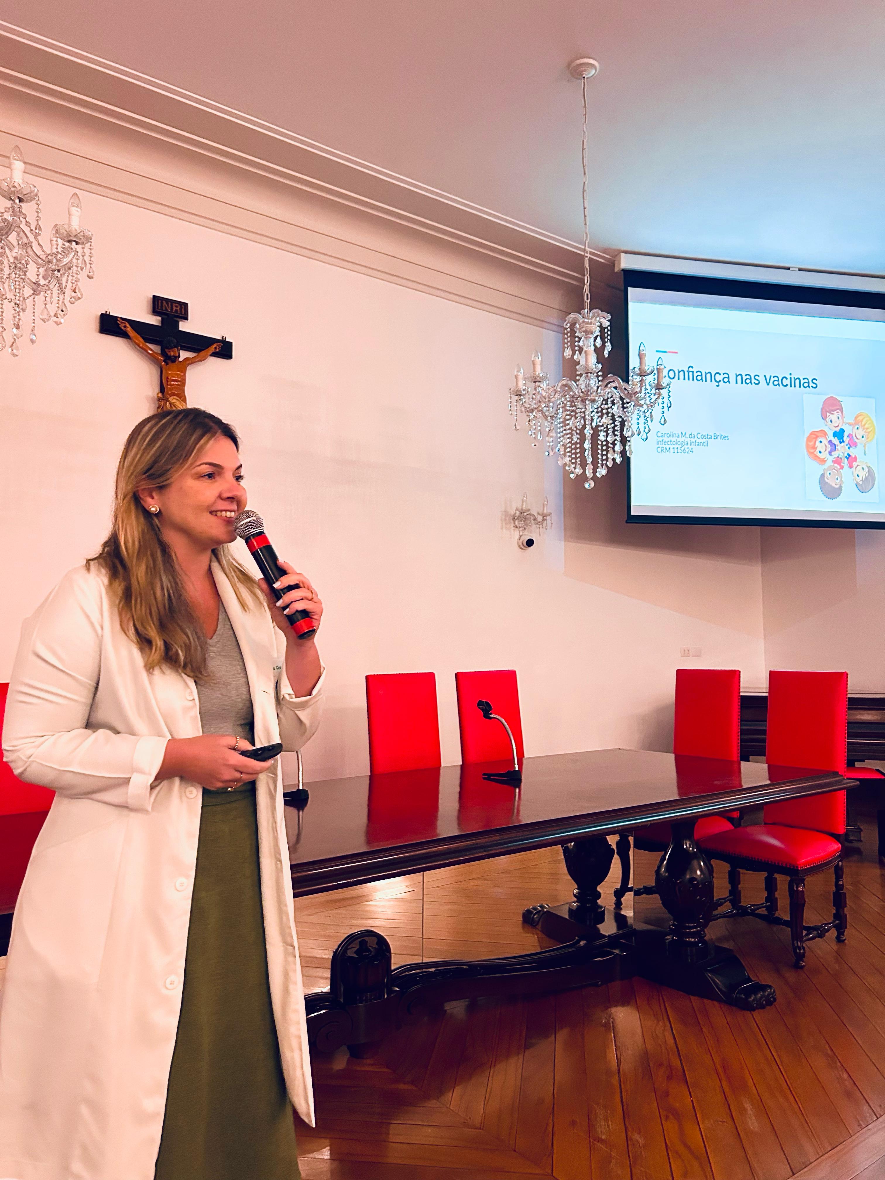 E para finalizar a tarde de palestras, a Dra. Caroline Brites, médica Infectologista Pediátrica, abordou o tema: “Evidências e segurança das vacinas”, e destacou que o médico Pediatra tem a obrigação de passar todas as informações sobre o assunto aos pais das crianças assistidas, inclusive as vacinas complementares, que não são disponíveis no SUS. “O médico tem o papel de orientar e desmistificar a desinformação e notícias falsas sobre o tema. Se existe vacina é porque tem histórico de doença e sequelas nas crianças”.
