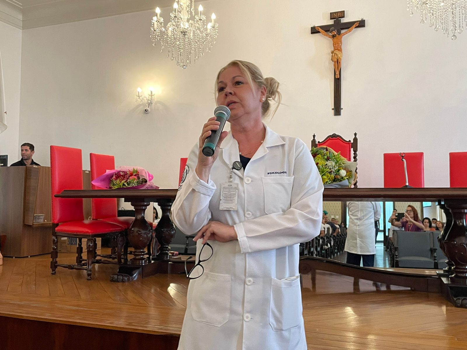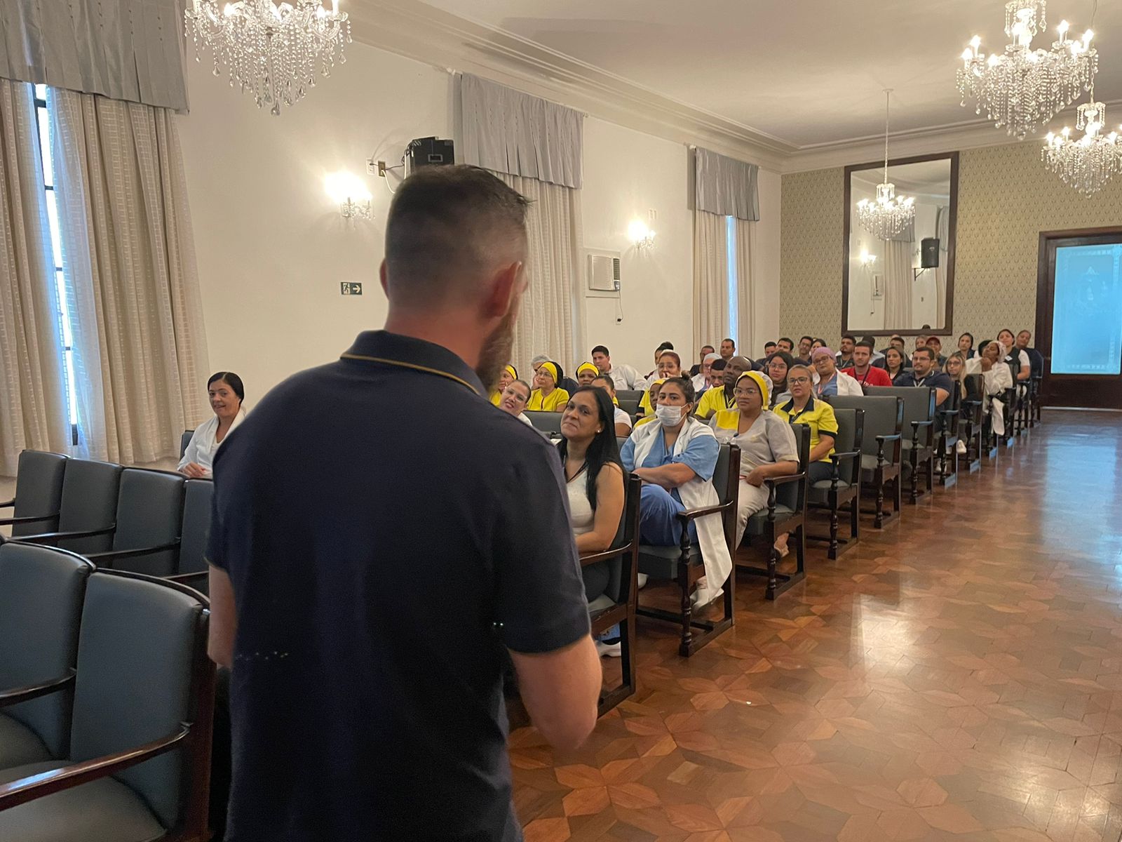No período noturno, o Enfº. Sérgio Cardoso, coordenador do Serviço de Higienização Hospitalar, falou sobre acidentes de trabalho e suas complicações e consequências.