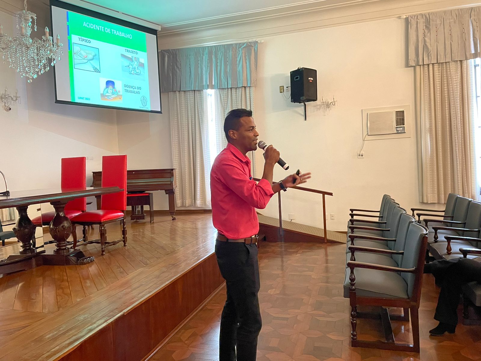 Na sequência, o técnico de Segurança do Trabalho, Flávio Leite, abordou o tema acidente de trabalho e acidente de trajeto, detalhando situações de risco, e mencionando exemplos de ocorrências que se enquadram em acidente de trajeto.
