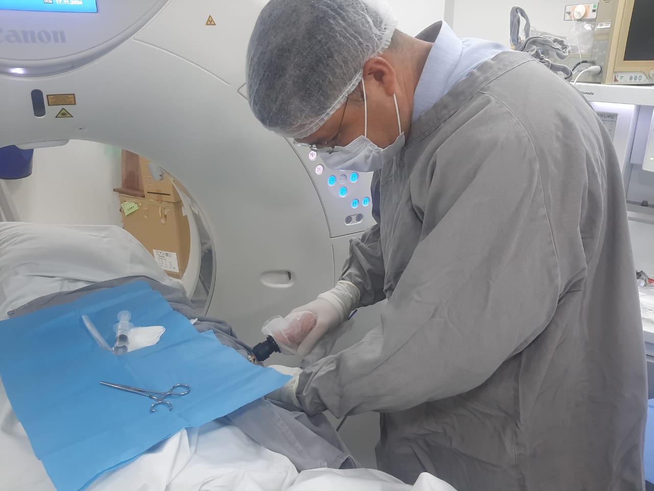 Para a realização do procedimento, uma das salas do Serviço de Tomografia foi equipada como um centro cirúrgico, com equipe e todos os recursos necessários por cerca de 2 horas.
