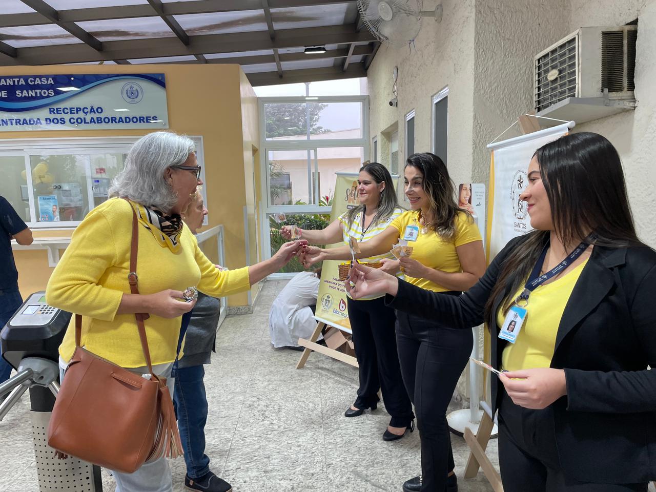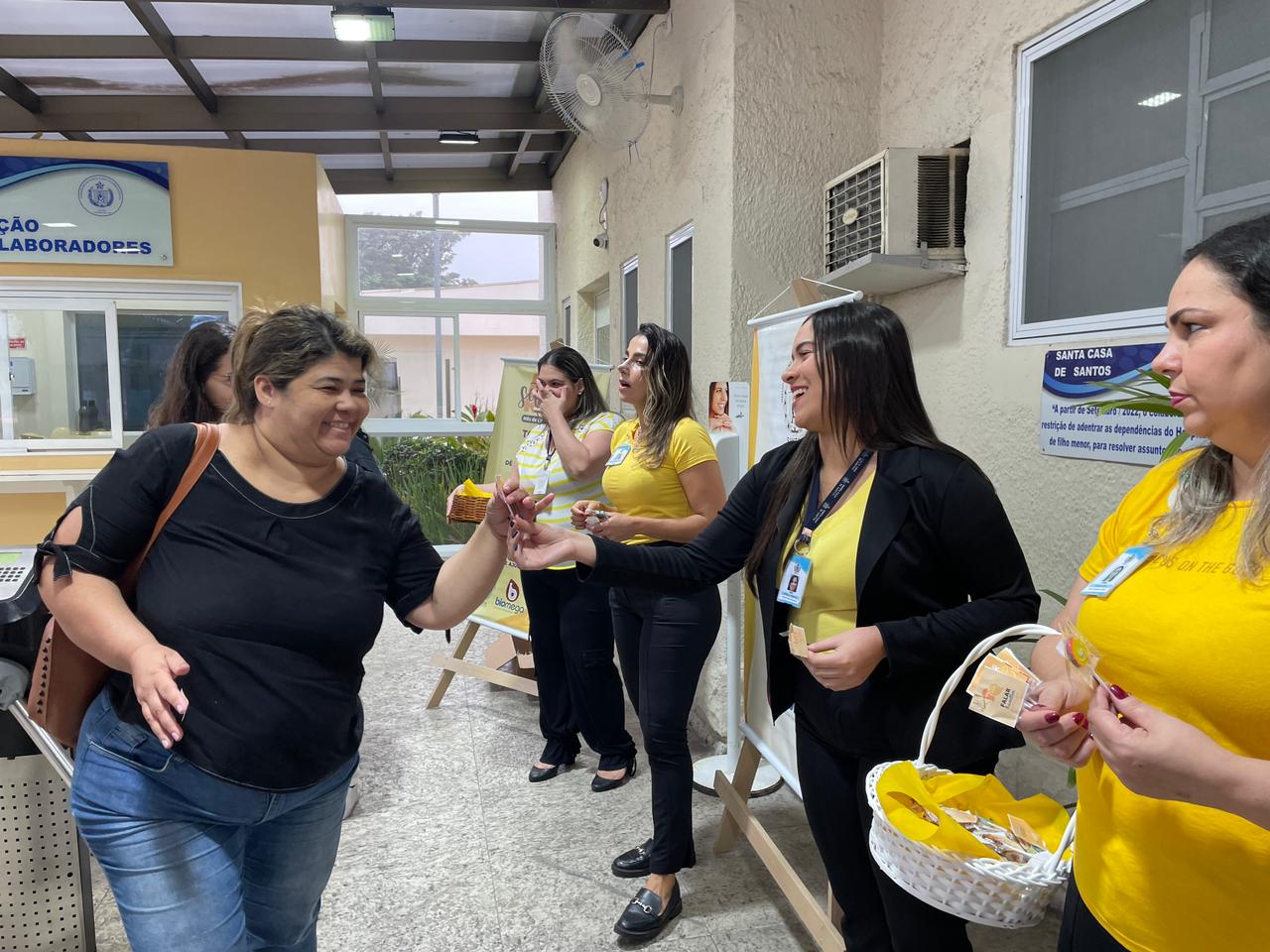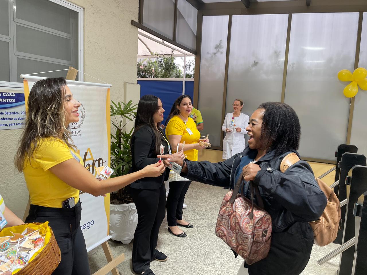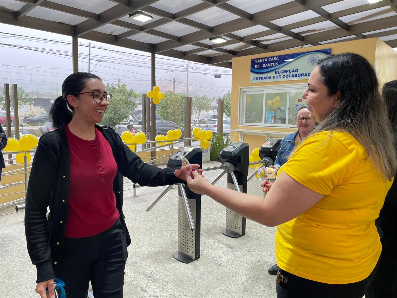 O início da semana na Santa Casa de Santos começou diferente para os funcionários da instituição, que foram recepcionados logo no primeiro horário da manhã com música e um grupo da comissão organizadora da campanha Setembro Amarelo entregando pirulitos com frases motivacionais.