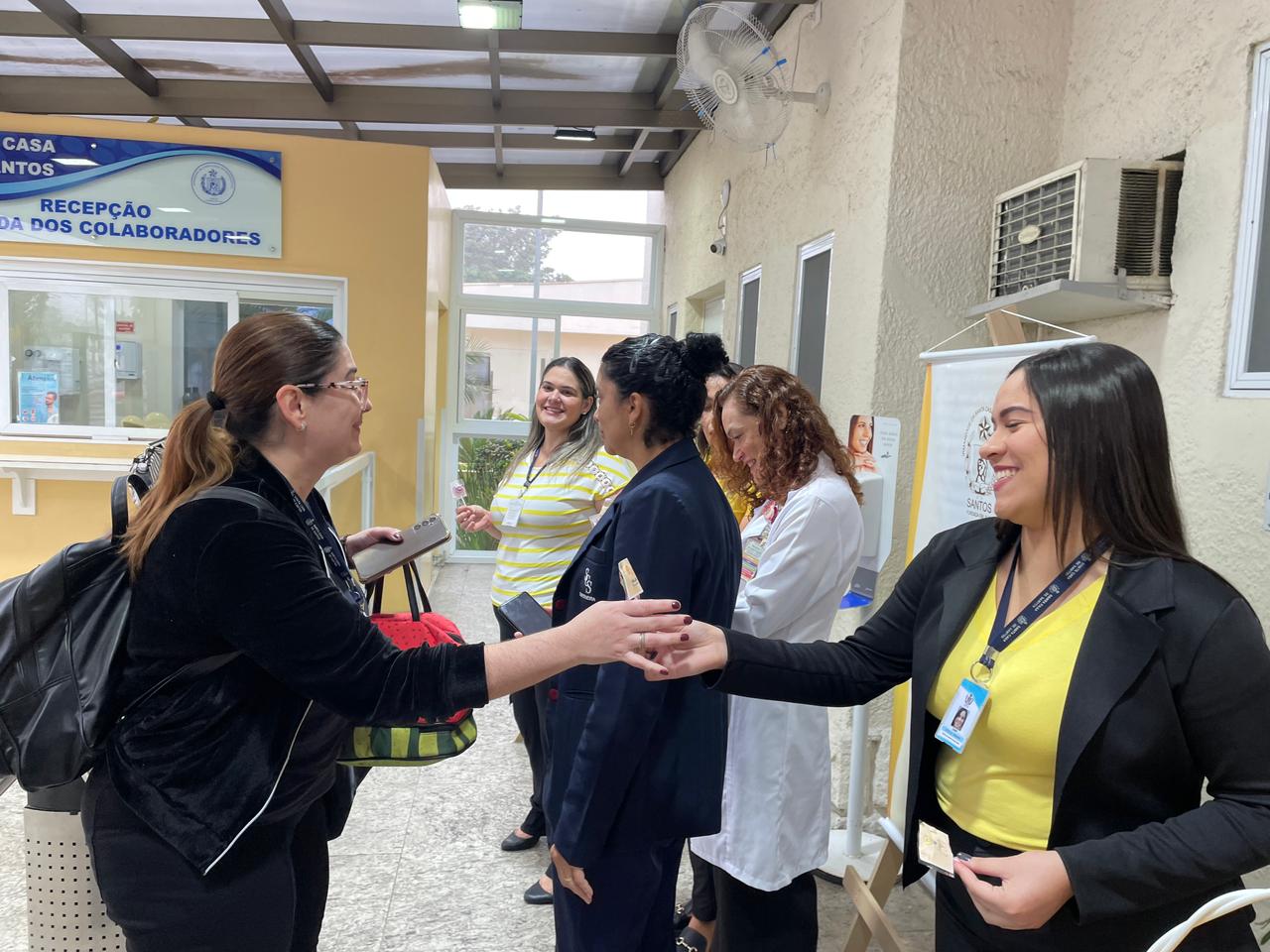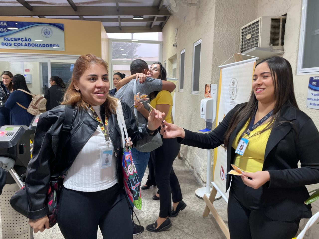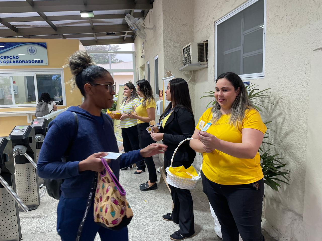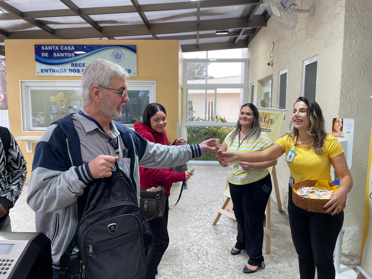 O início da semana na Santa Casa de Santos começou diferente para os funcionários da instituição, que foram recepcionados logo no primeiro horário da manhã com música e um grupo da comissão organizadora da campanha Setembro Amarelo entregando pirulitos com frases motivacionais.