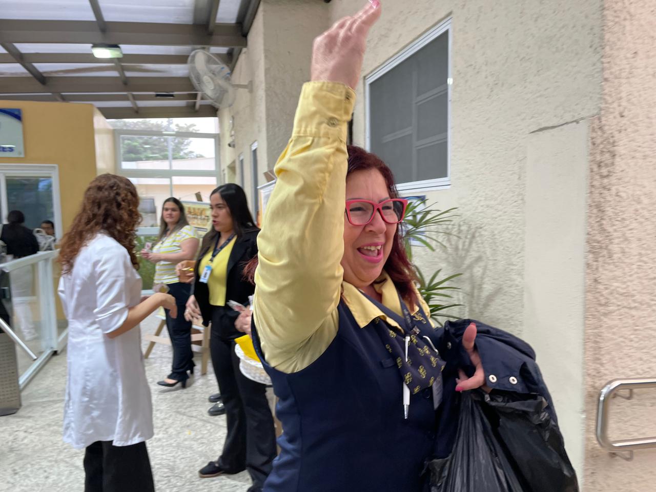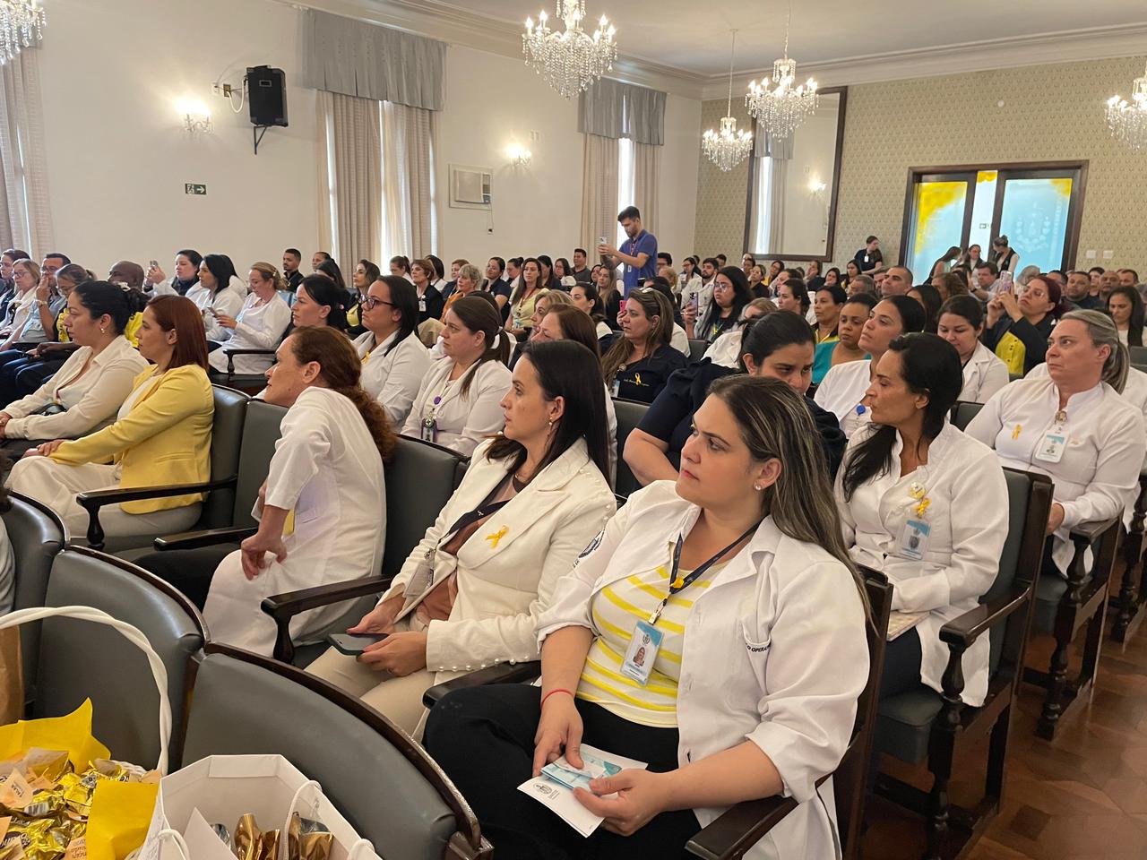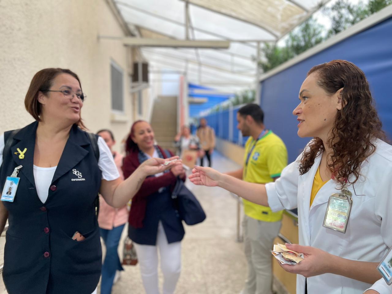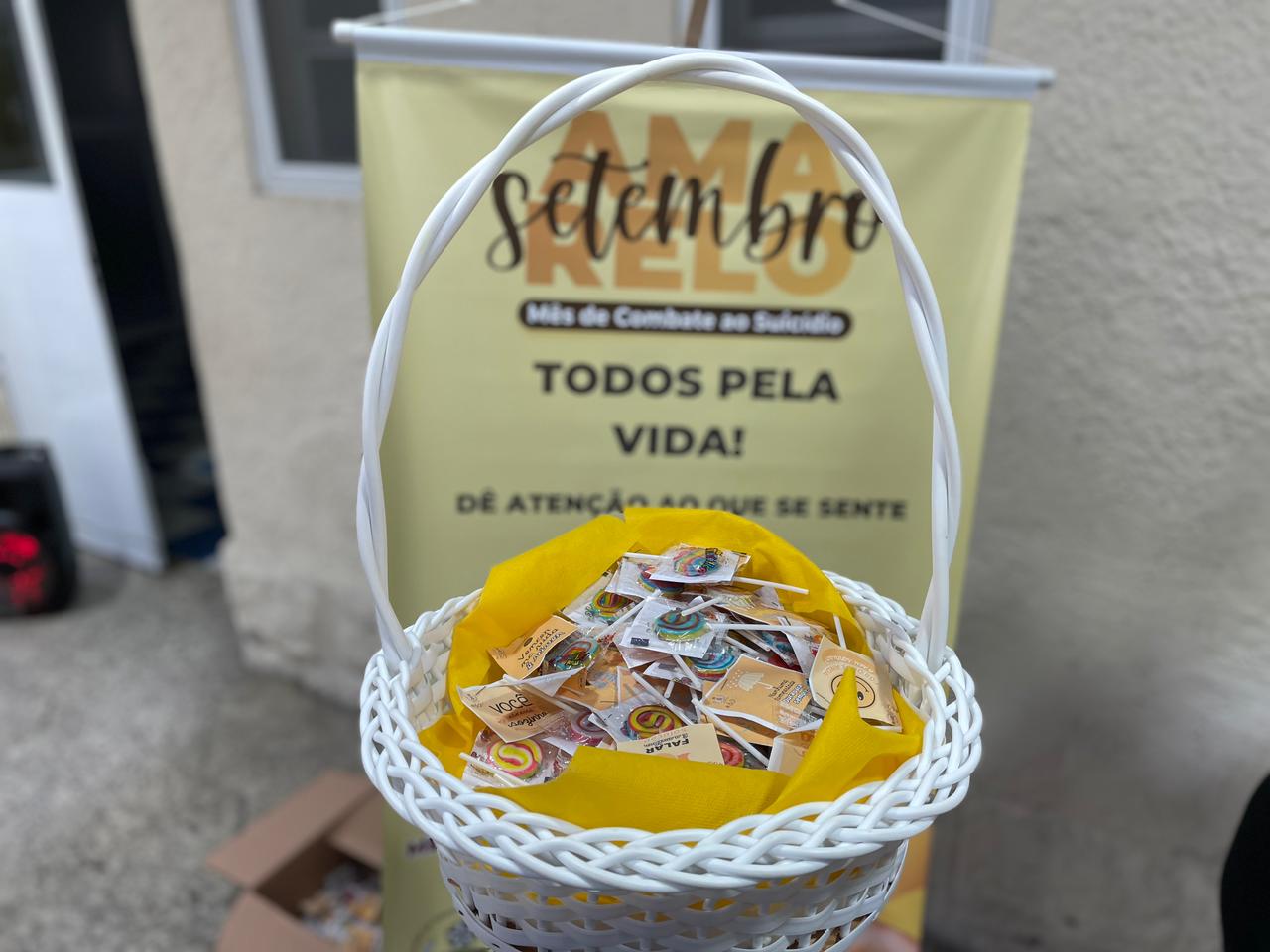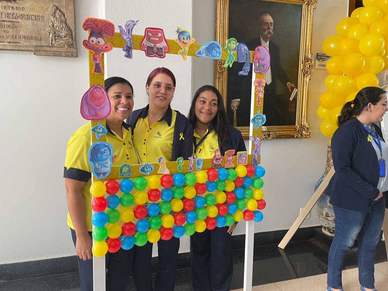 O início da semana na Santa Casa de Santos começou diferente para os funcionários da instituição, que foram recepcionados logo no primeiro horário da manhã com música e um grupo da comissão organizadora da campanha Setembro Amarelo entregando pirulitos com frases motivacionais.