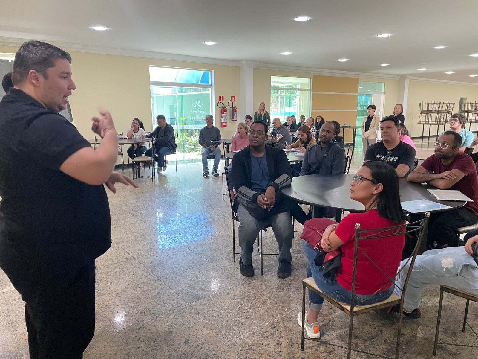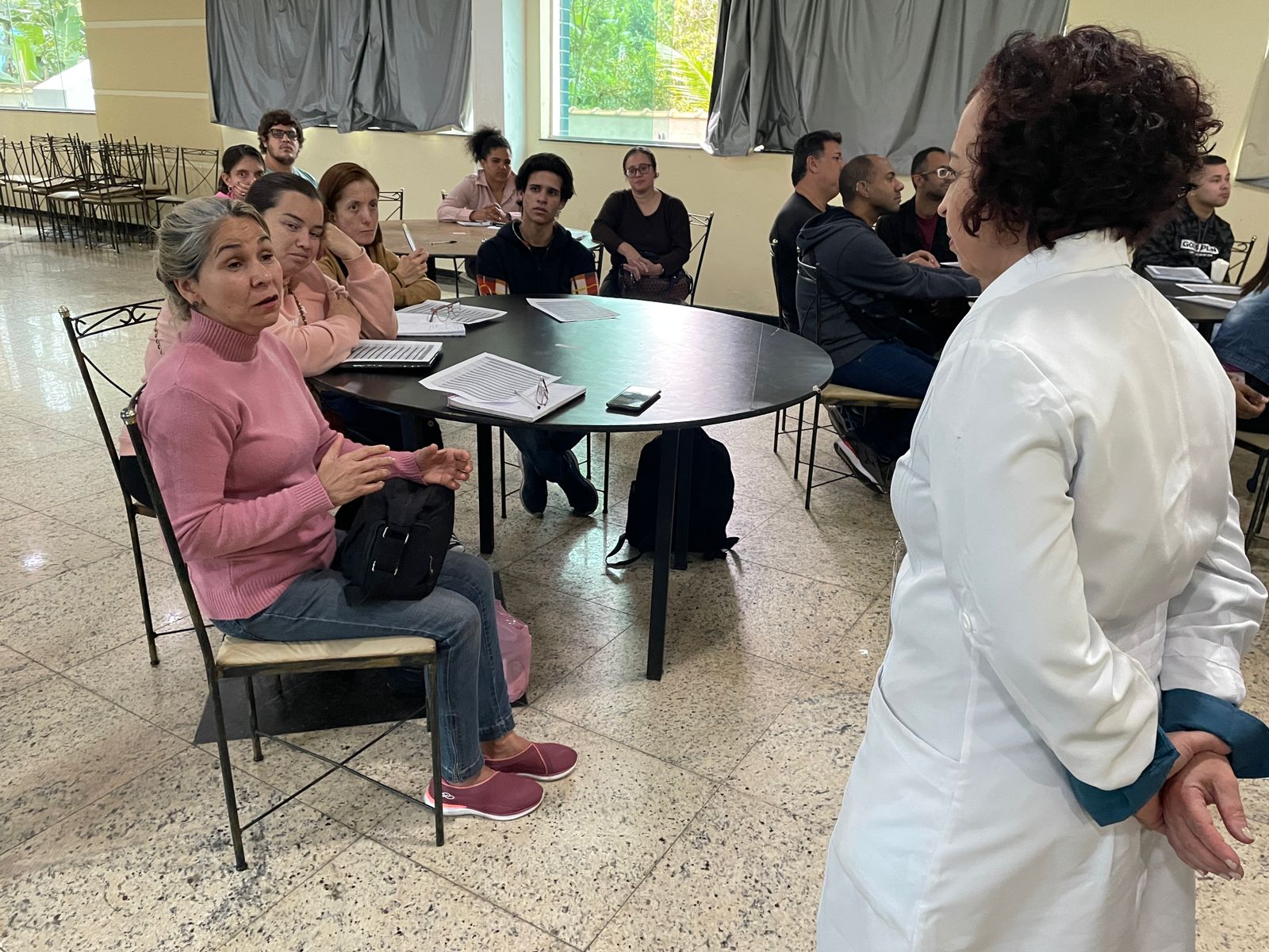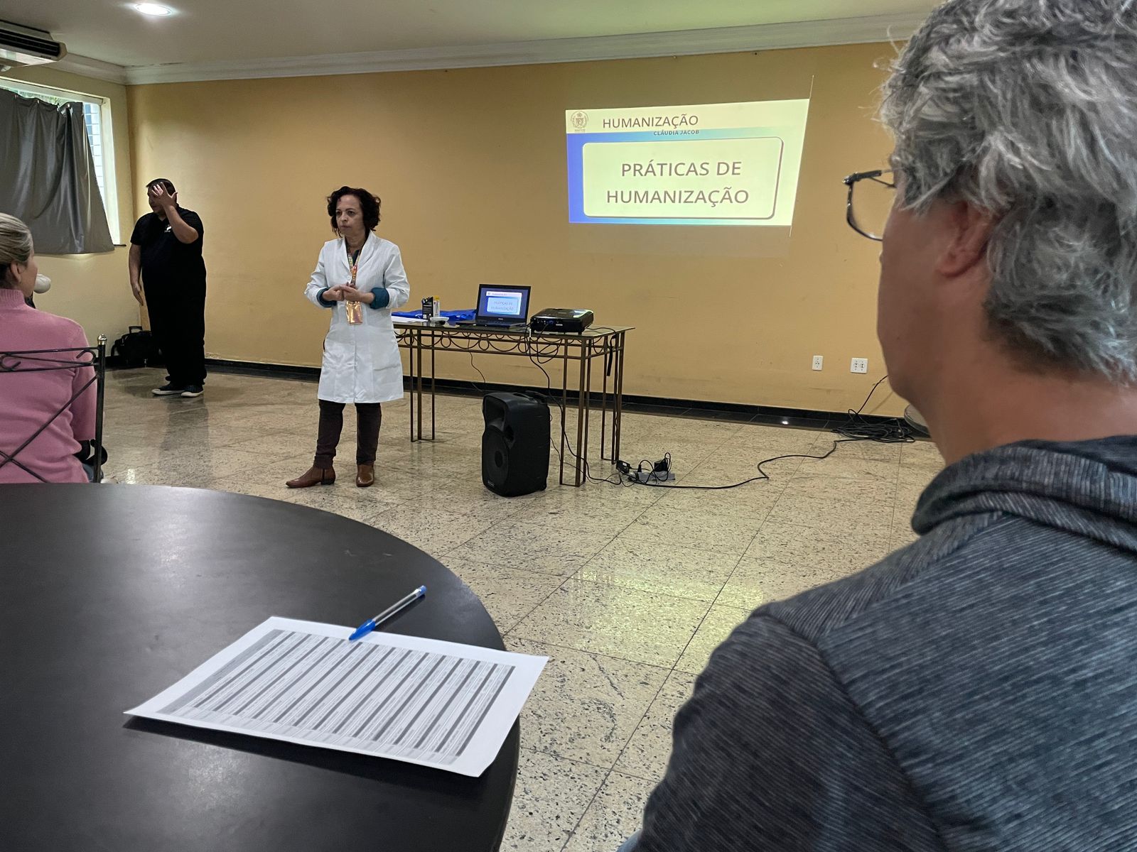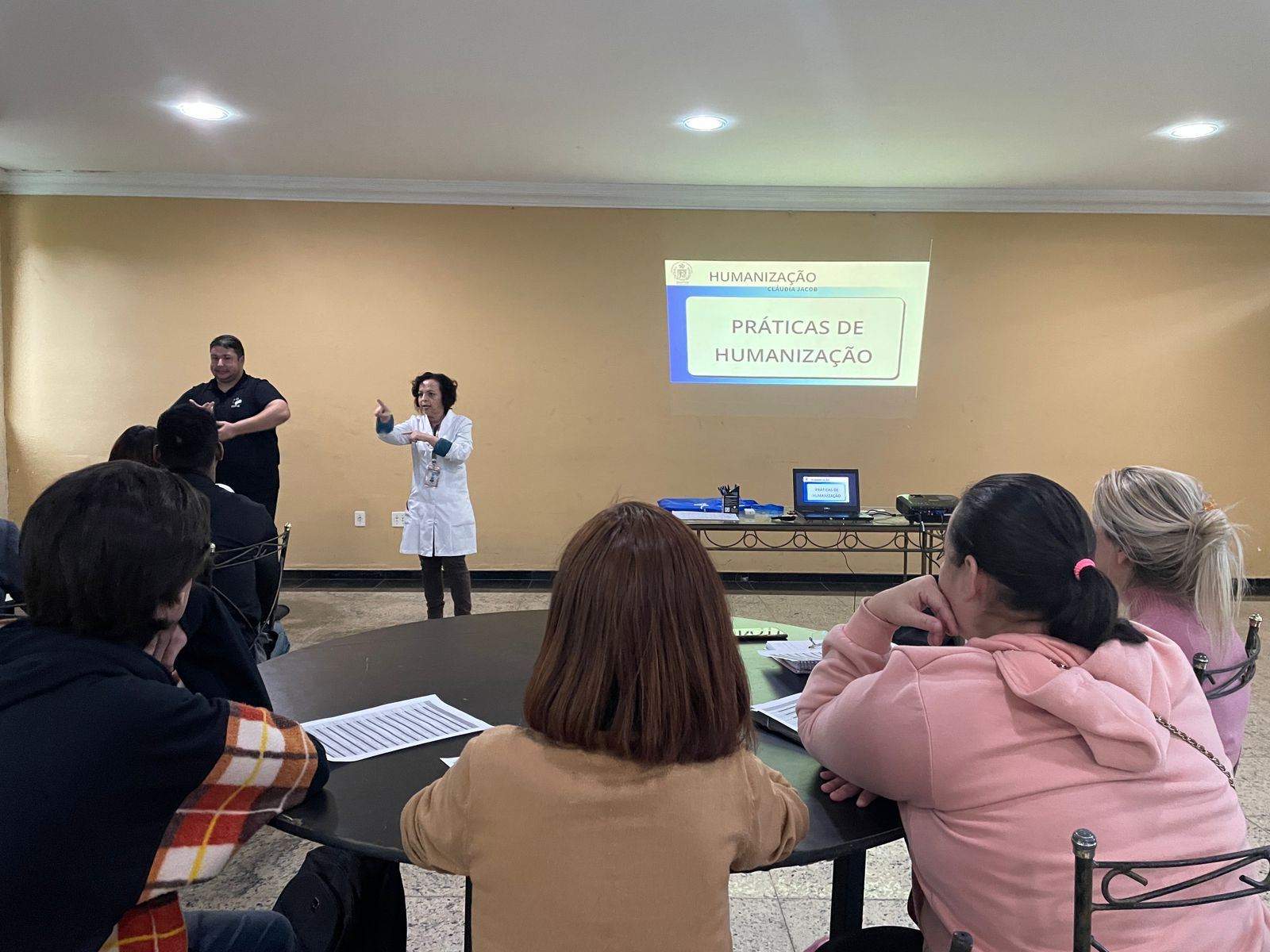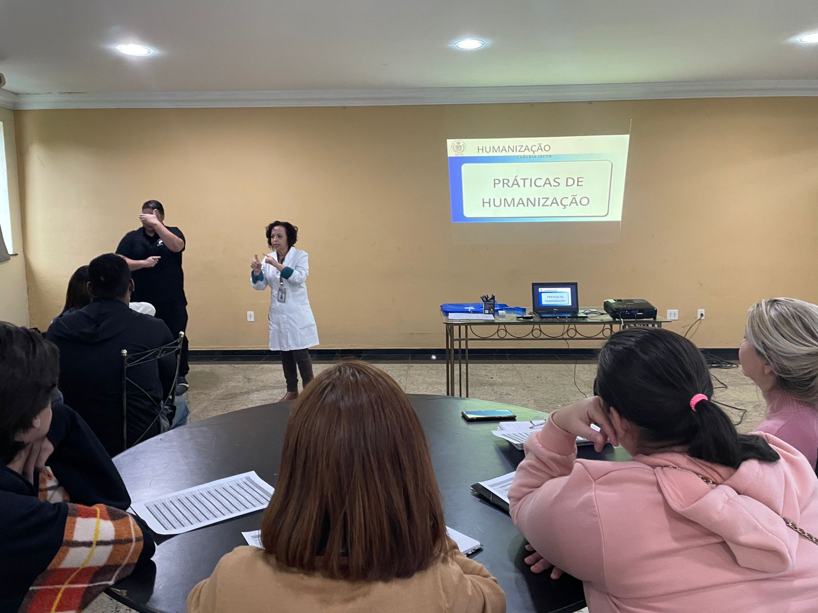 Após o coffee break, os alunos tiveram a primeira aula, com a Supervisora de Humanização Claudia Jacob, com o tema “O Processo de Comunicação e Humanização”. Claudia iniciou com um vídeo de introdução que fala sobre inclusão na sociedade. Também abordou o tema de práticas de humanização, tanto no ambiente hospitalar, como no dia a dia.