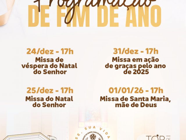 Encerrando o ano, no dia 31 de dezembro, às 17h, haverá a Missa em Ação de Graças pelo ano de 2025, momento dedicado à reflexão e agradecimento pelas conquistas e aprendizados do período.