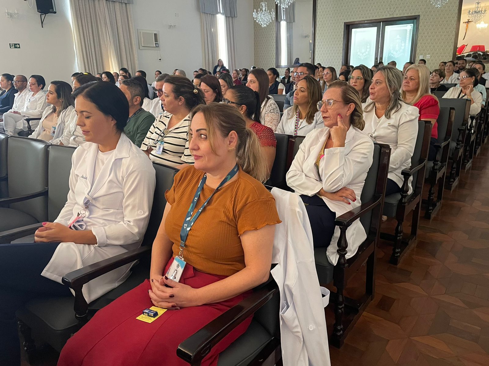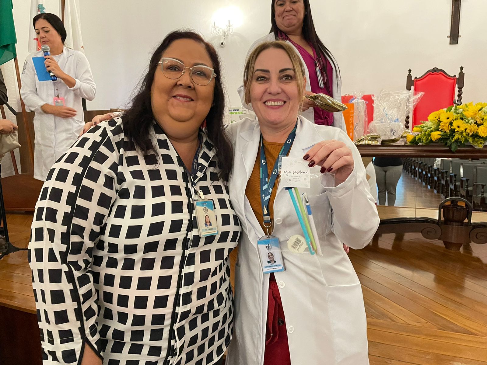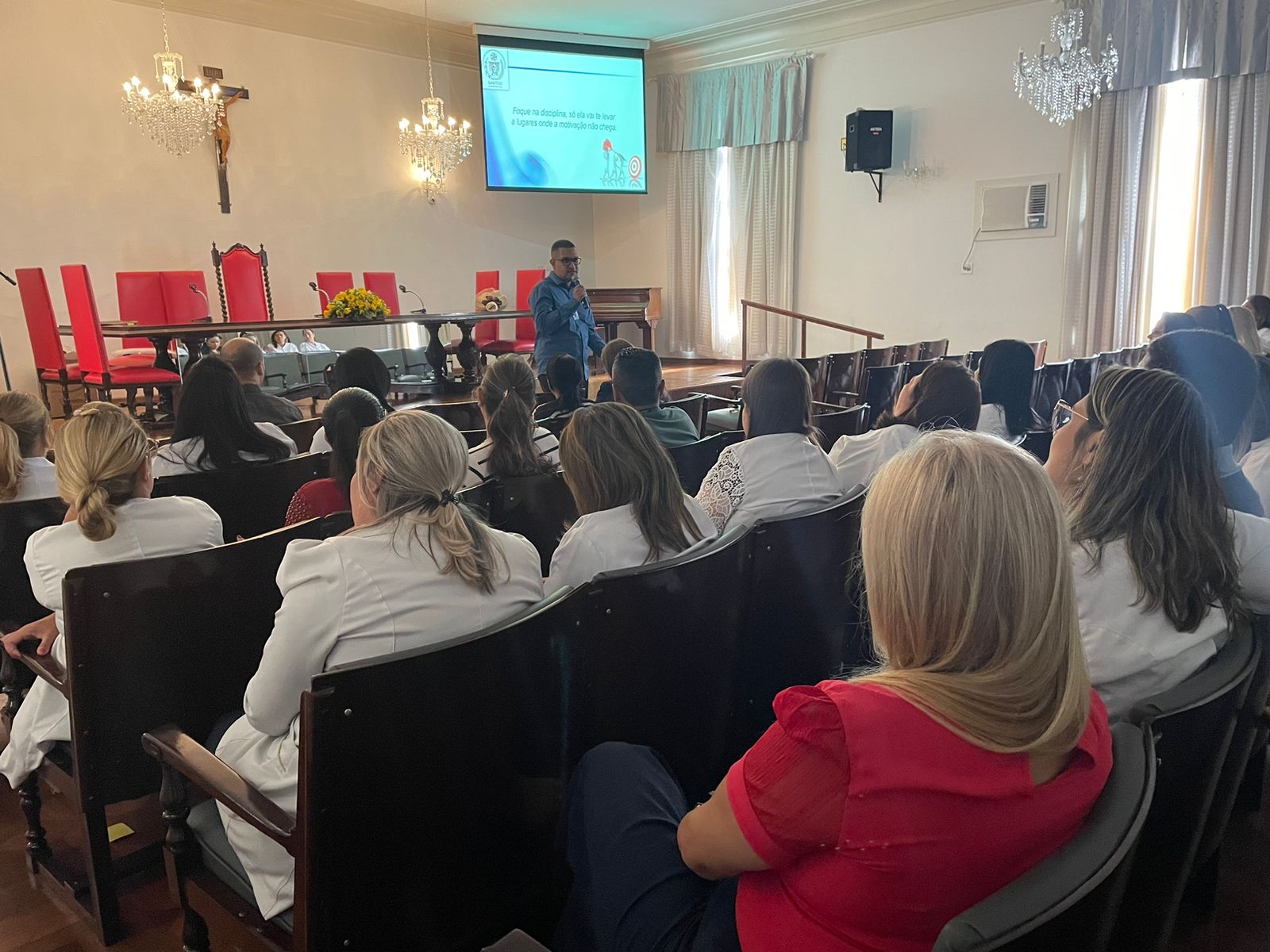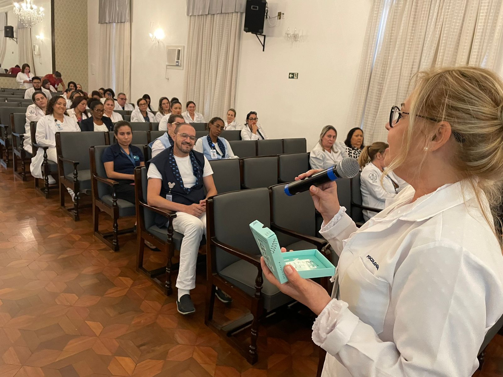 Após os discursos de abertura, a primeira palestra foi com a supervisora de Humanização do hospital, Cláudia Jacob, que abordou exatamente sobre o atendimento humanizado, e a importância de sempre dar o seu melhor, pois é sempre possível fazer um “algo a mais”, seja num gesto, uma palavra, ou uma simples “mudança na posição de uma cadeira”.
