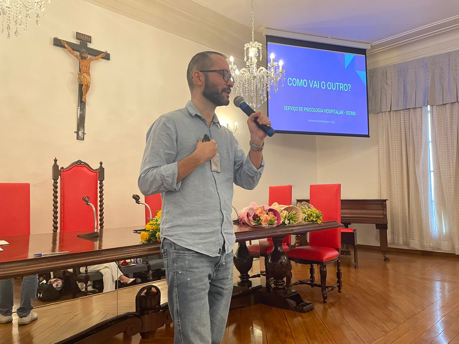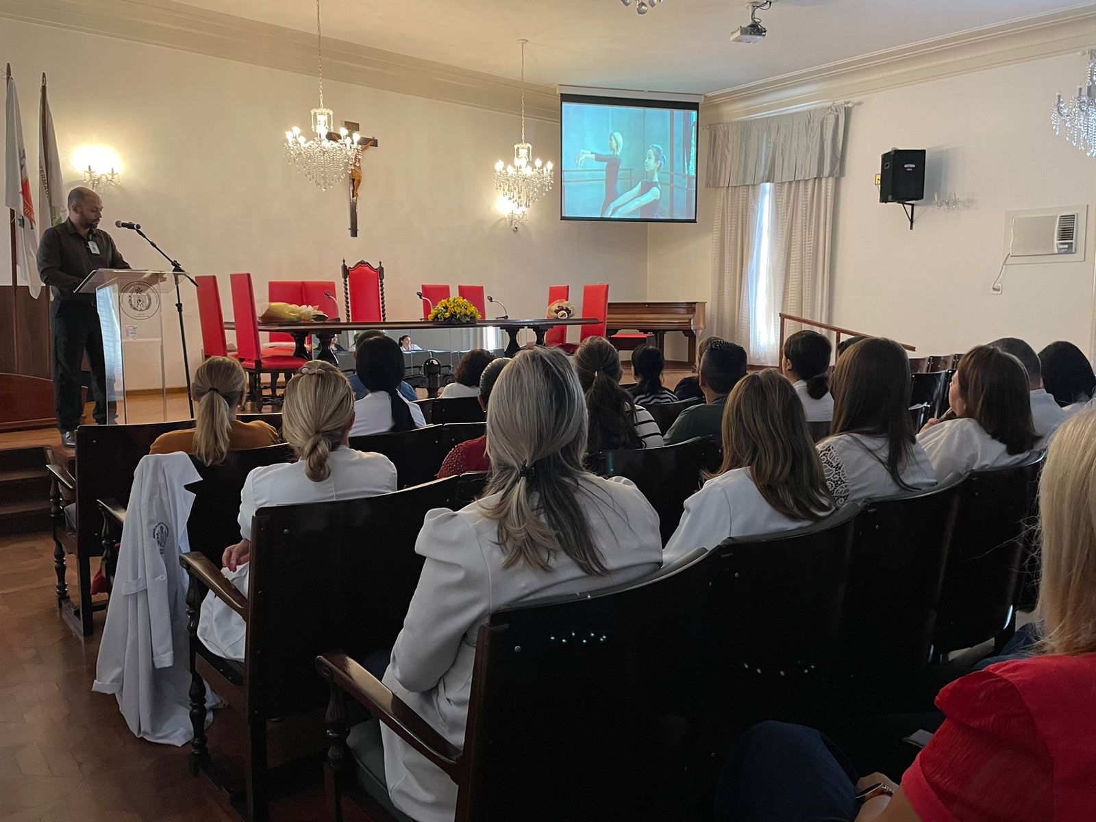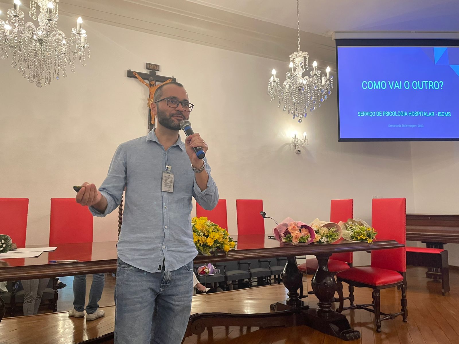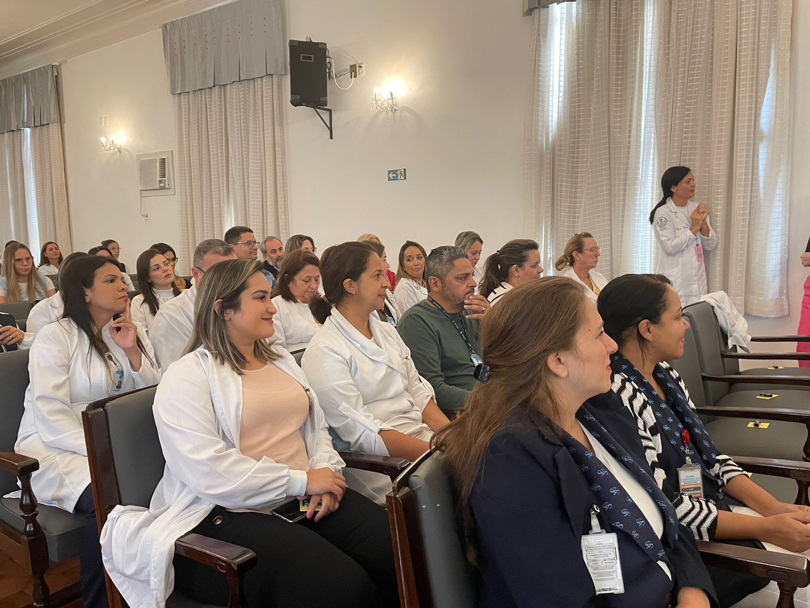 Após os discursos de abertura, a primeira palestra foi com a supervisora de Humanização do hospital, Cláudia Jacob, que abordou exatamente sobre o atendimento humanizado, e a importância de sempre dar o seu melhor, pois é sempre possível fazer um “algo a mais”, seja num gesto, uma palavra, ou uma simples “mudança na posição de uma cadeira”.