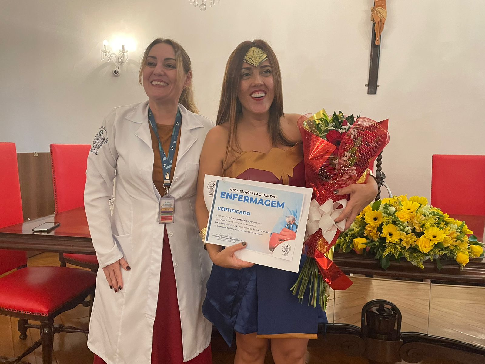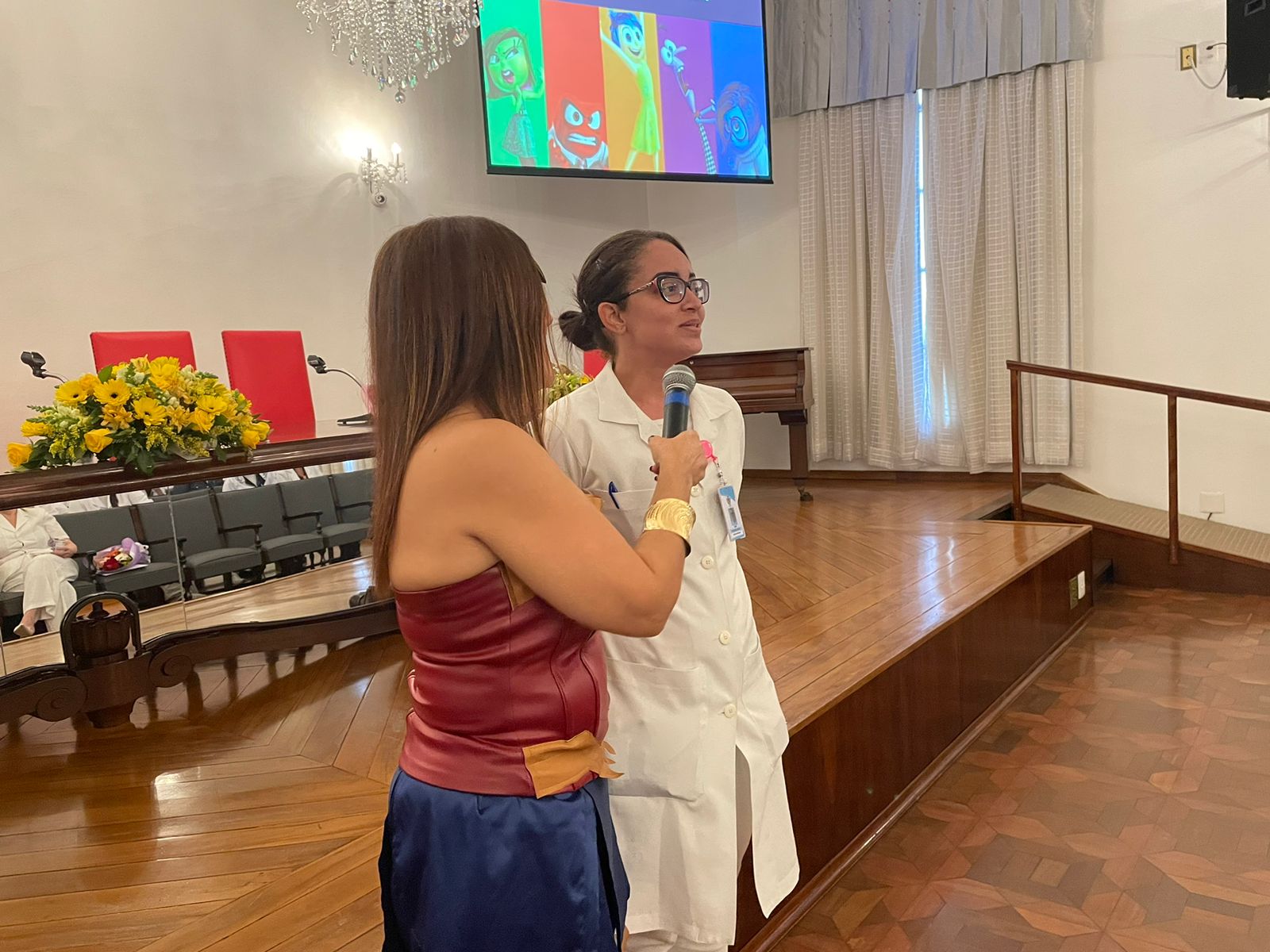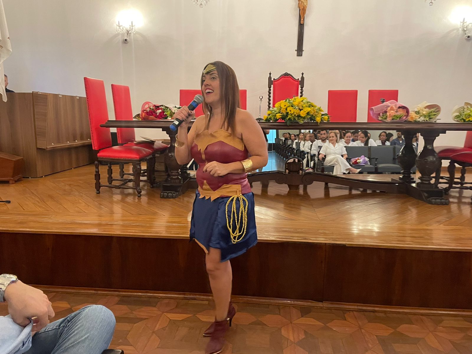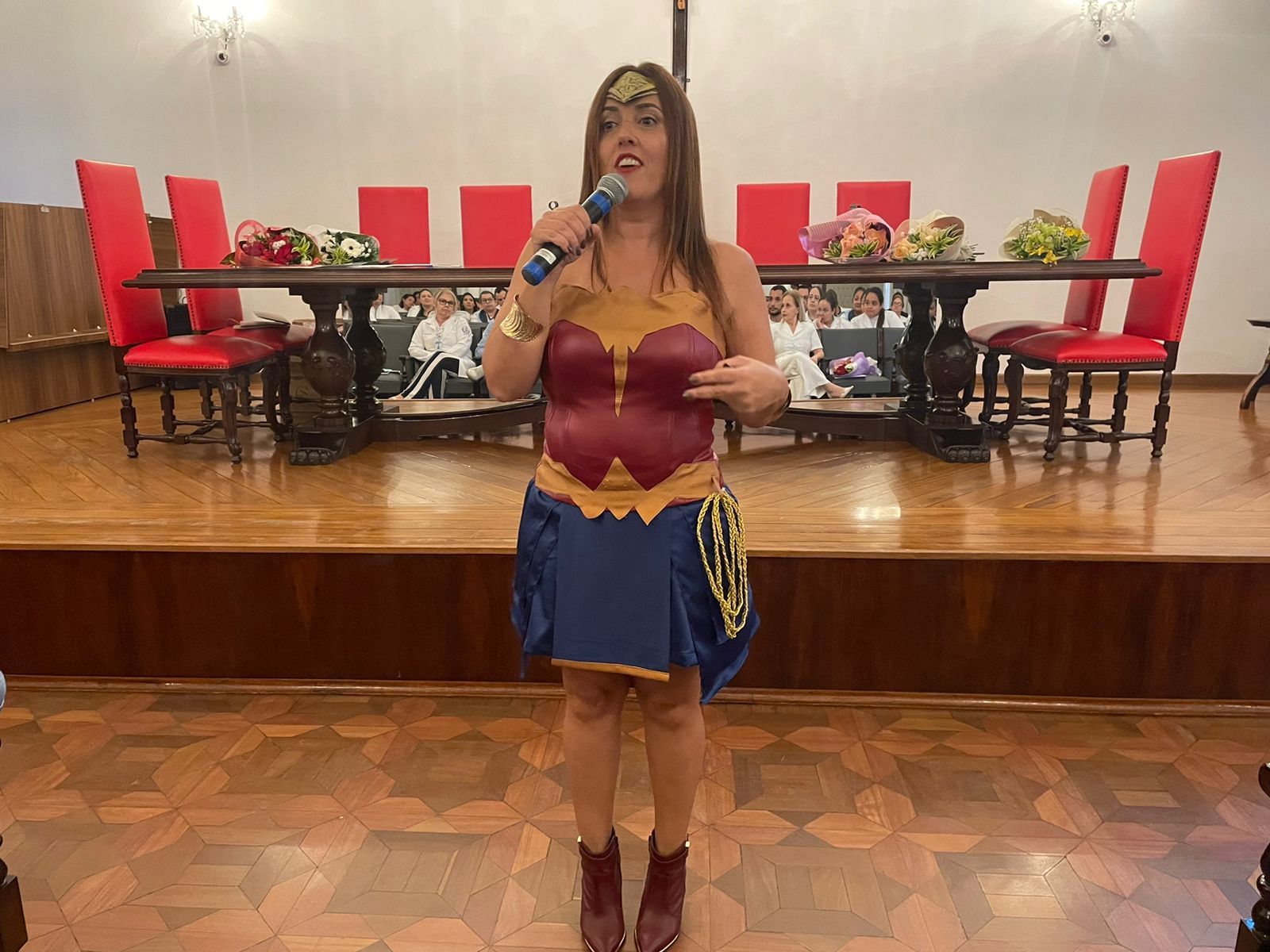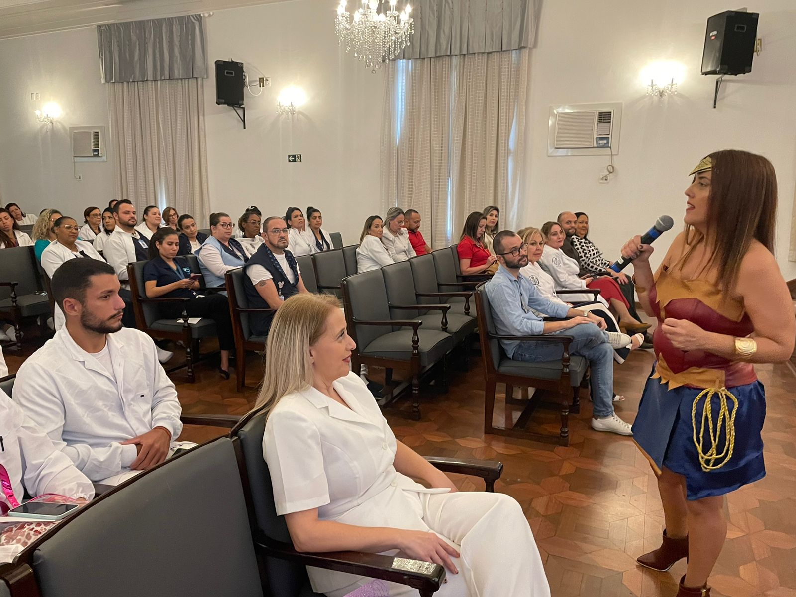 Na sequência, a enfermeira Fernanda Matilde Gaspar, trouxe o tema “Inteligência Emocional”, falando sobre como lidar com as pessoas. Fernanda, vestida de “Mulher Maravilha”, fez uma dinâmica com os participantes, e enfatizou sobre o fato de todos serem humanos que precisam “ser felizes e aproveitar a trajetória de vida”.