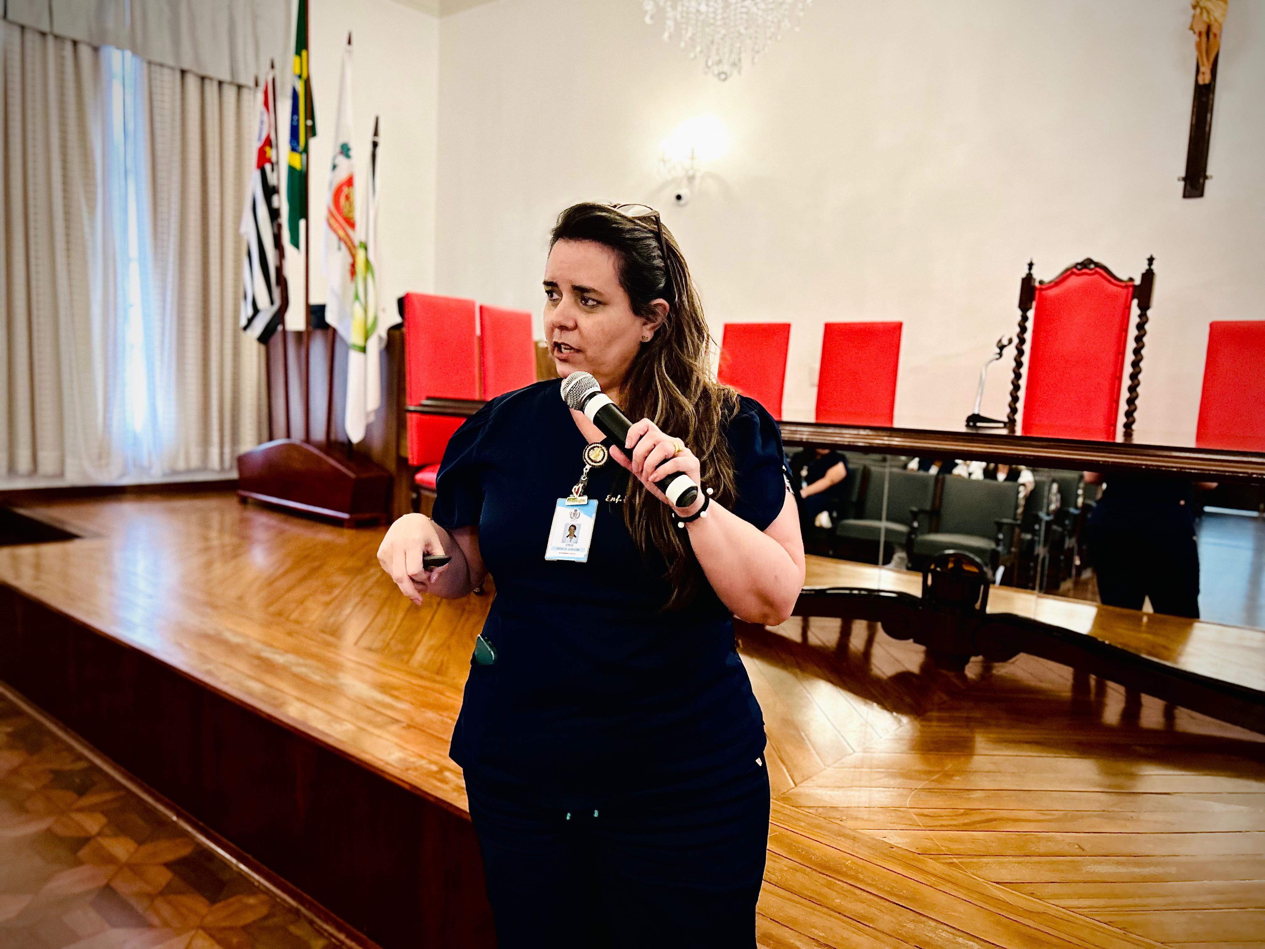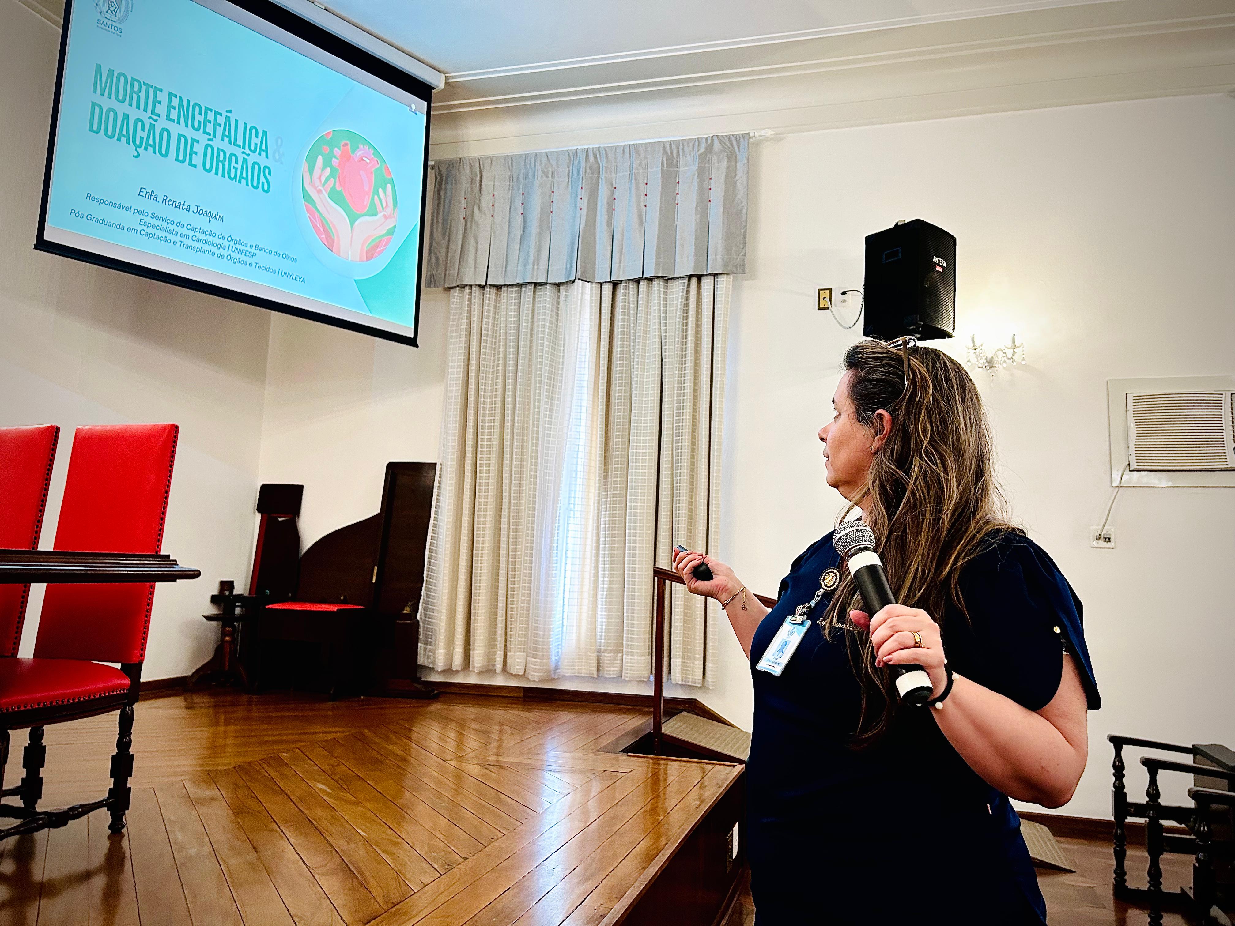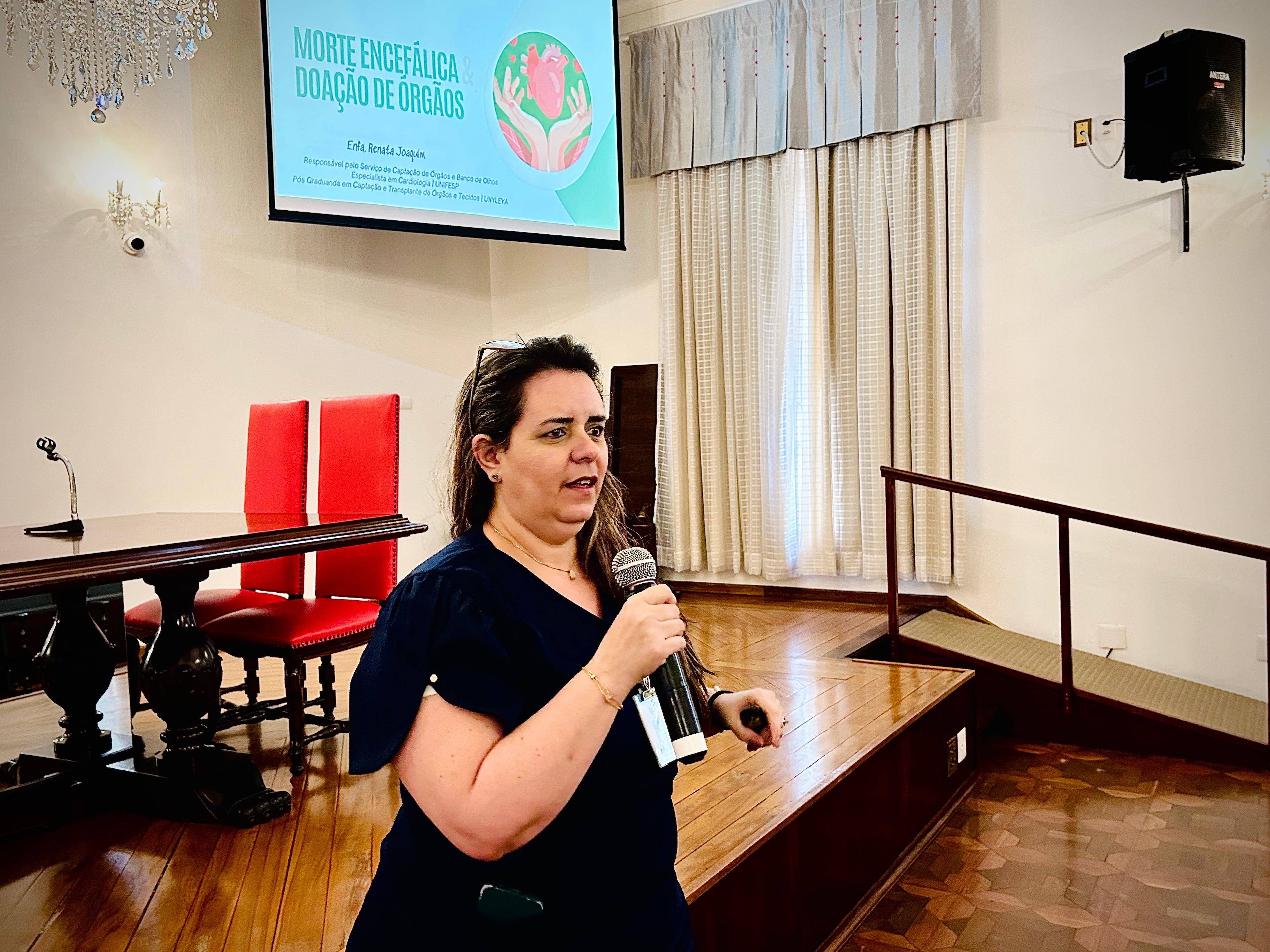 A seguir, a palestra foi ministrada pela enfª. Renata Joaquim, responsável pelo Serviço de Captação de Órgãos, que detalhou cada fase do protocolo de morte encefálica e o processo de doação dos órgãos.