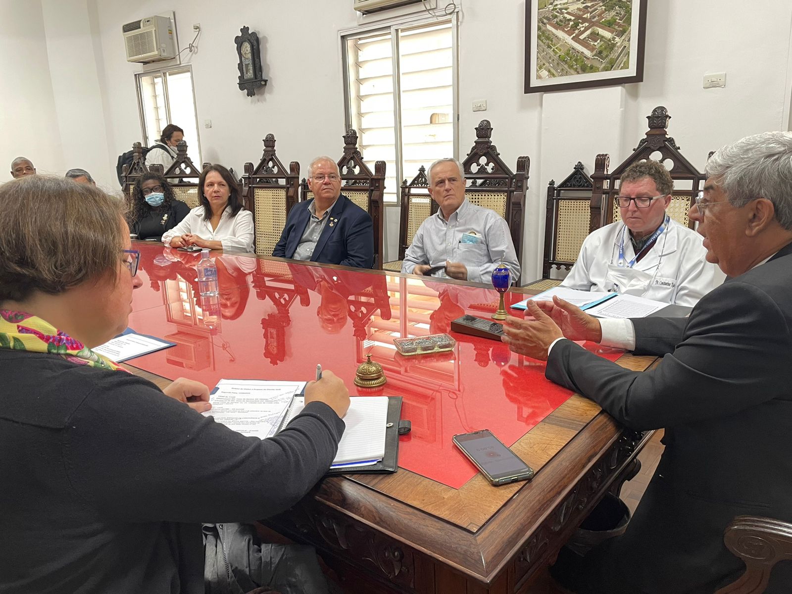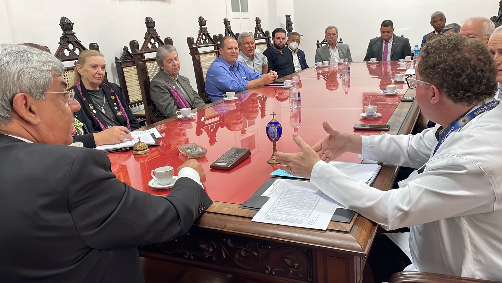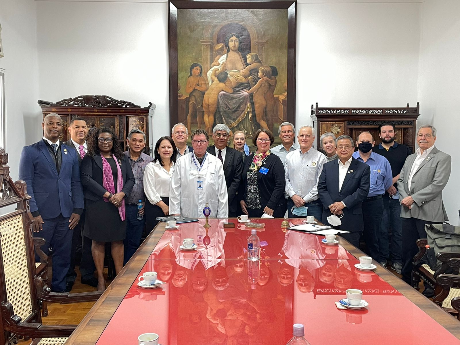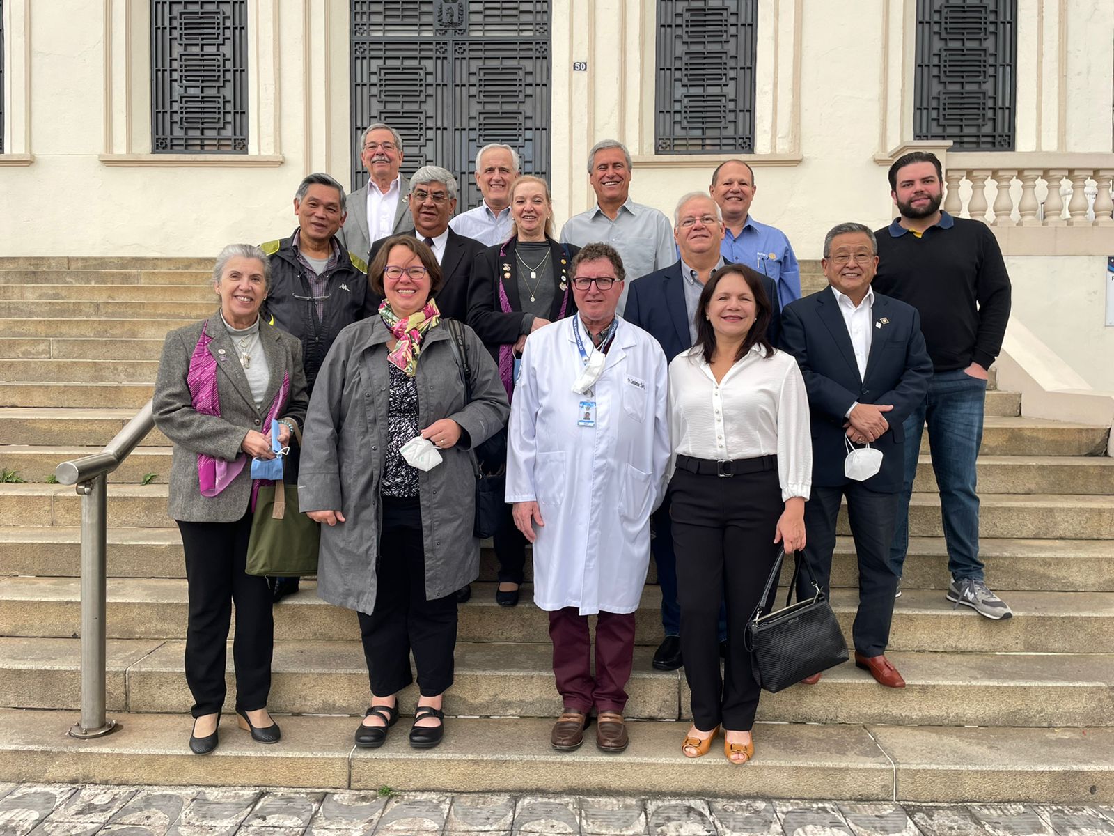 O vice provedor, Carlos Teixeira Filho, e o diretor clínico, Constantino Kader Conde, receberam a comitiva na Sala da Mesa Administrativa. O vice provedor explanou sobre a história da Santa Casa de Santos, como também sobre a representatividade da instituição para o país. O diretor clínico falou sobre os desafios da pandemia, e como foram os atendimentos no serviço de Oftalmologia neste período.