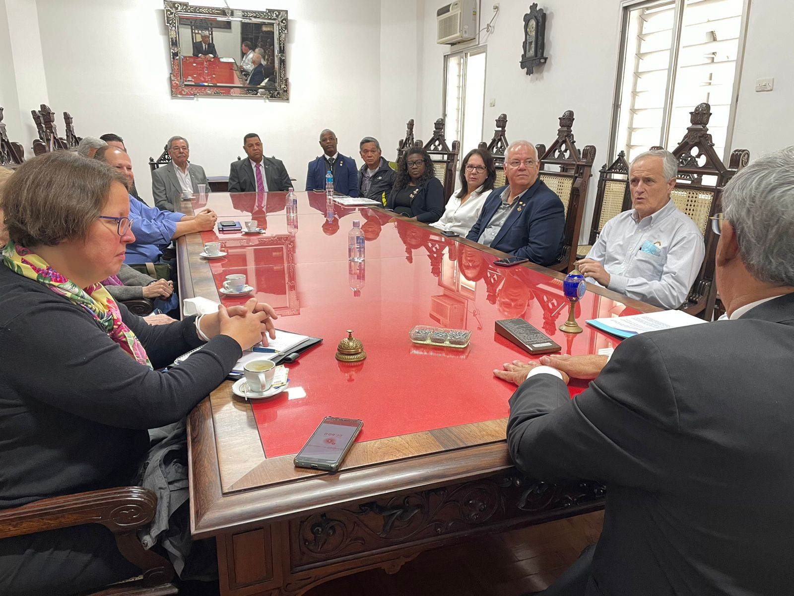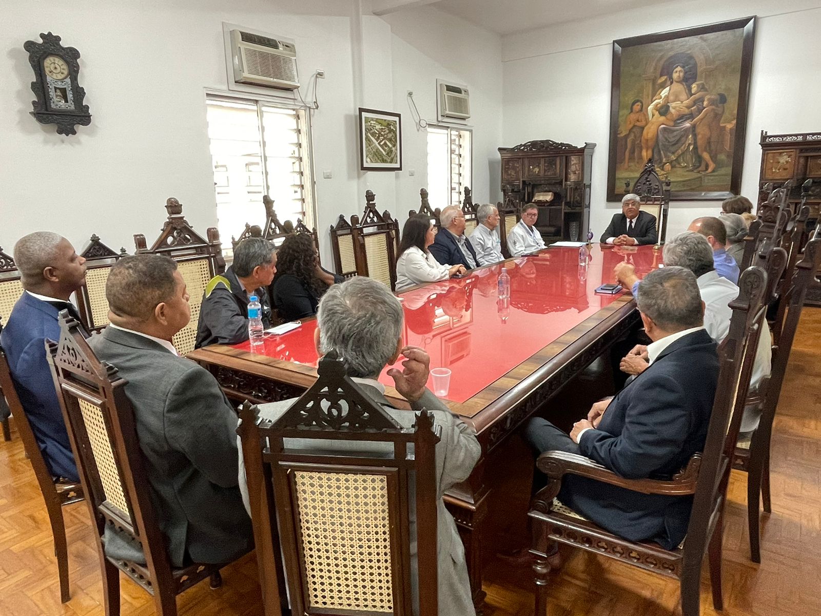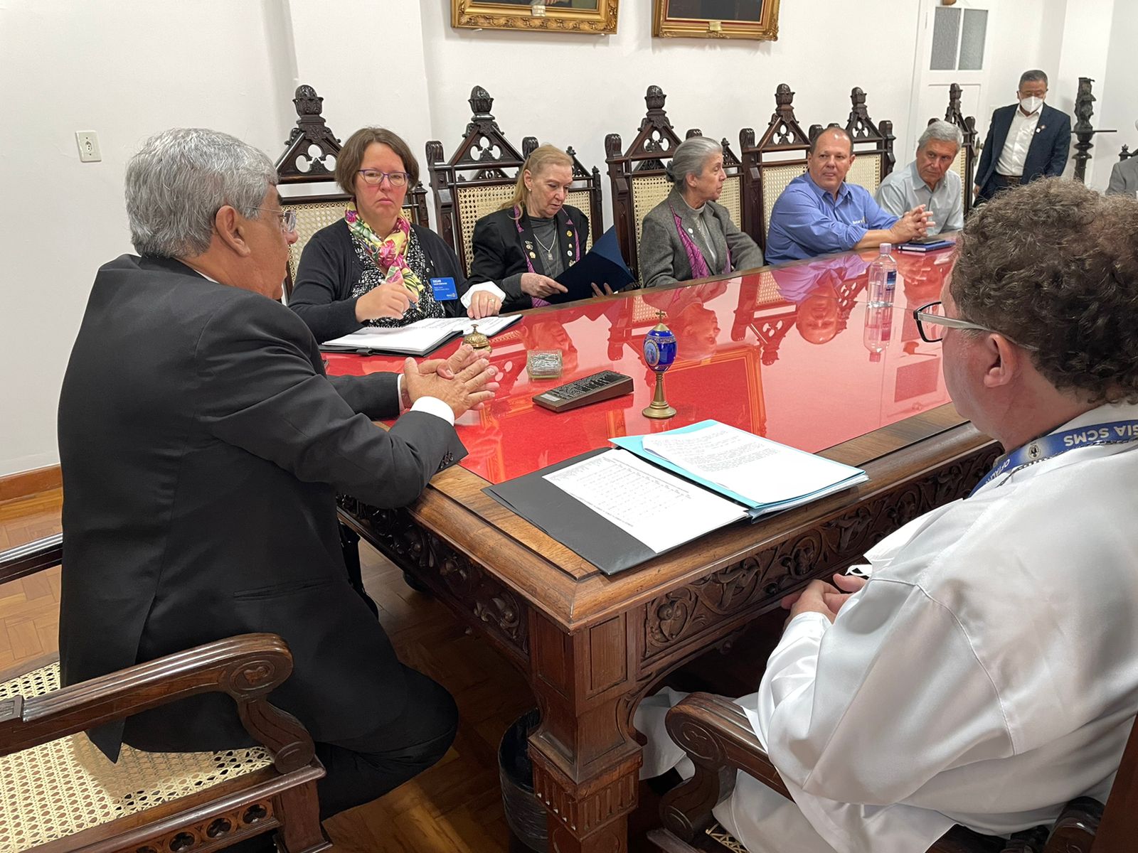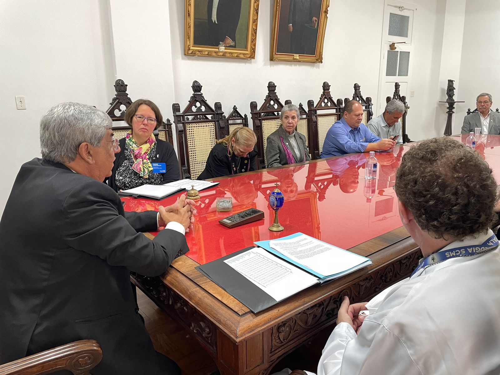 O vice provedor, Carlos Teixeira Filho, e o diretor clínico, Constantino Kader Conde, receberam a comitiva na Sala da Mesa Administrativa. O vice provedor explanou sobre a história da Santa Casa de Santos, como também sobre a representatividade da instituição para o país. O diretor clínico falou sobre os desafios da pandemia, e como foram os atendimentos no serviço de Oftalmologia neste período.
