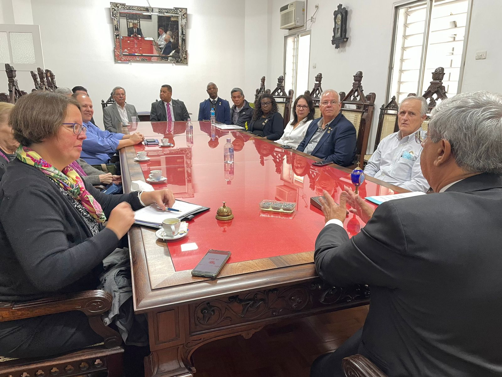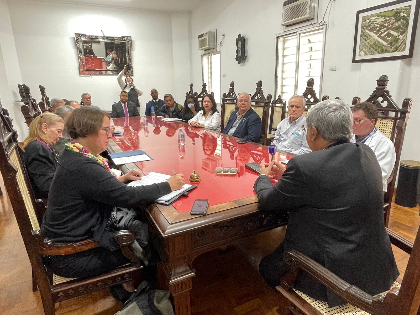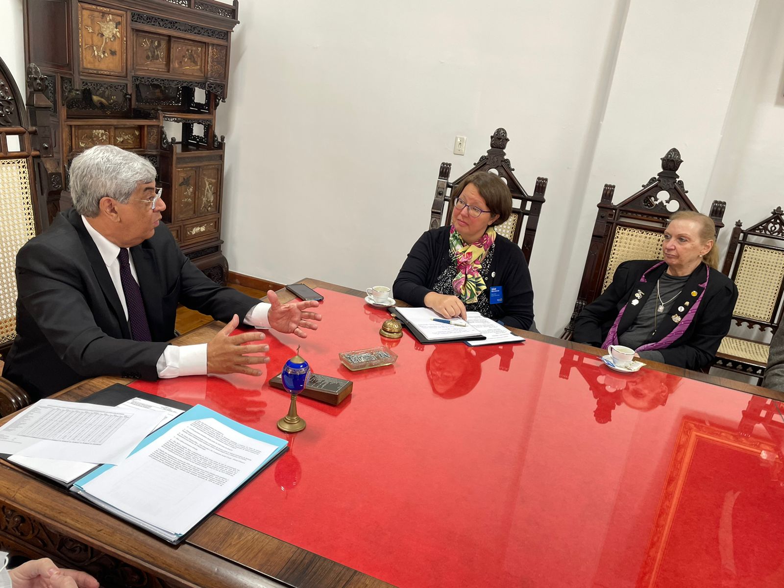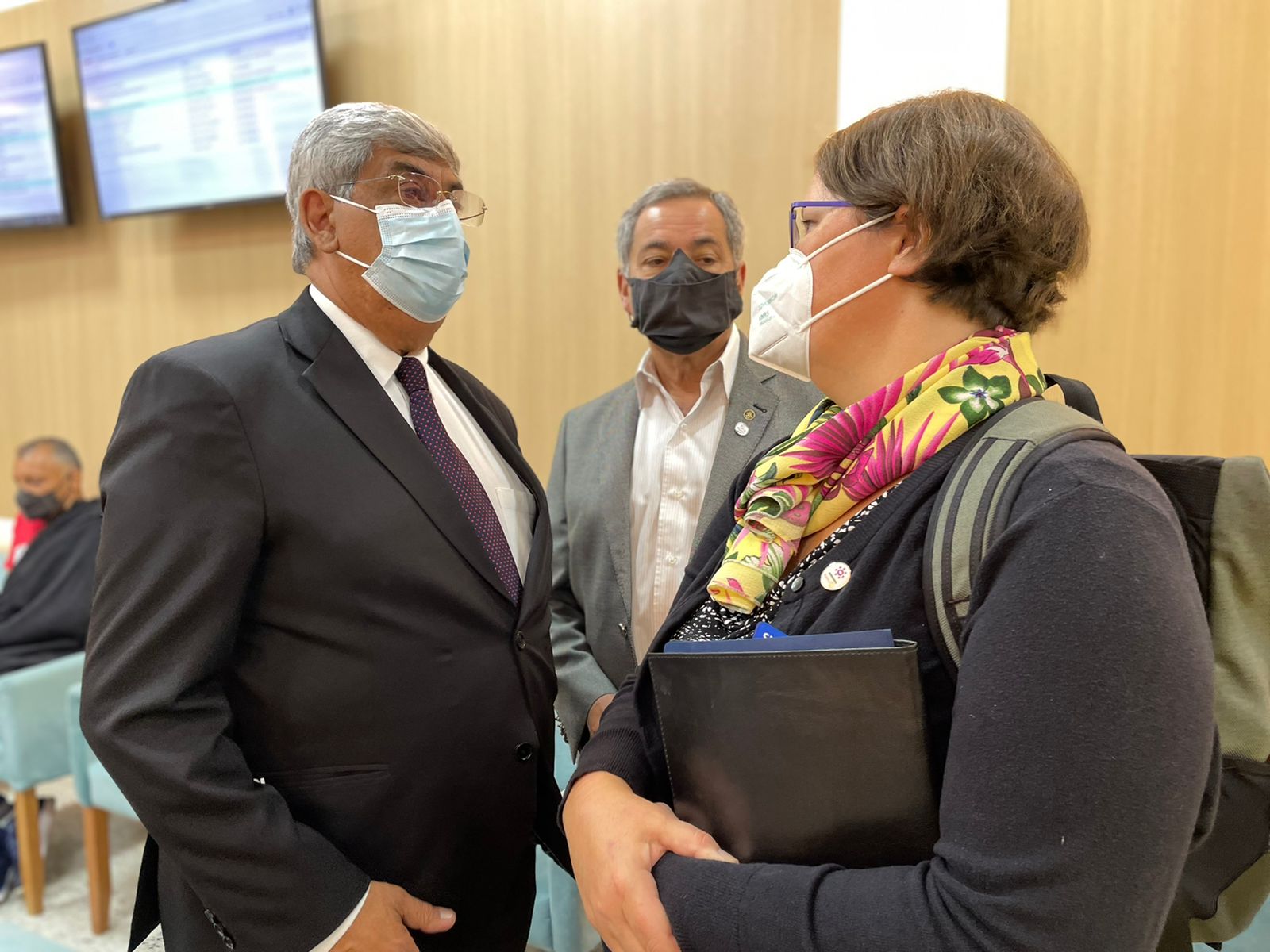 O vice provedor, Carlos Teixeira Filho, e o diretor clínico, Constantino Kader Conde, receberam a comitiva na Sala da Mesa Administrativa. O vice provedor explanou sobre a história da Santa Casa de Santos, como também sobre a representatividade da instituição para o país. O diretor clínico falou sobre os desafios da pandemia, e como foram os atendimentos no serviço de Oftalmologia neste período.