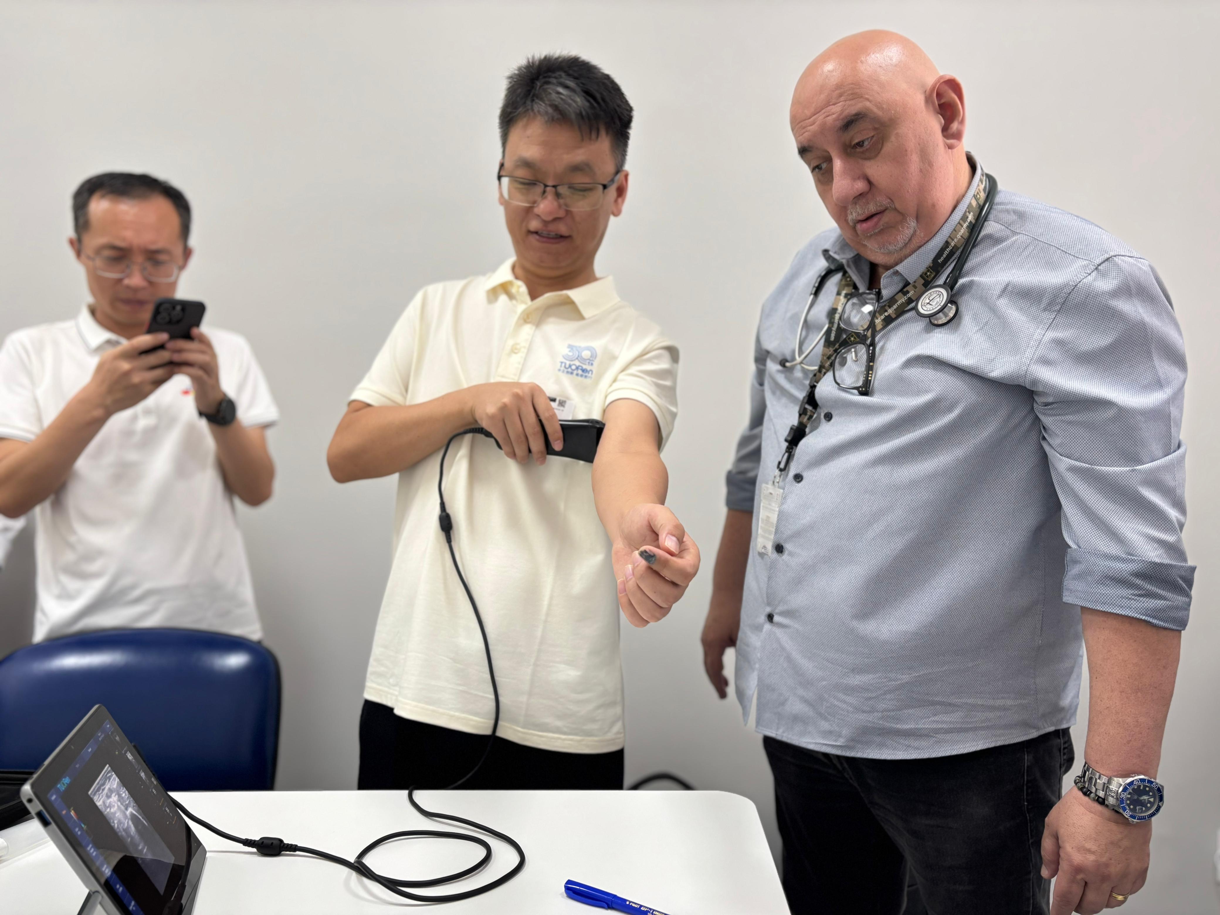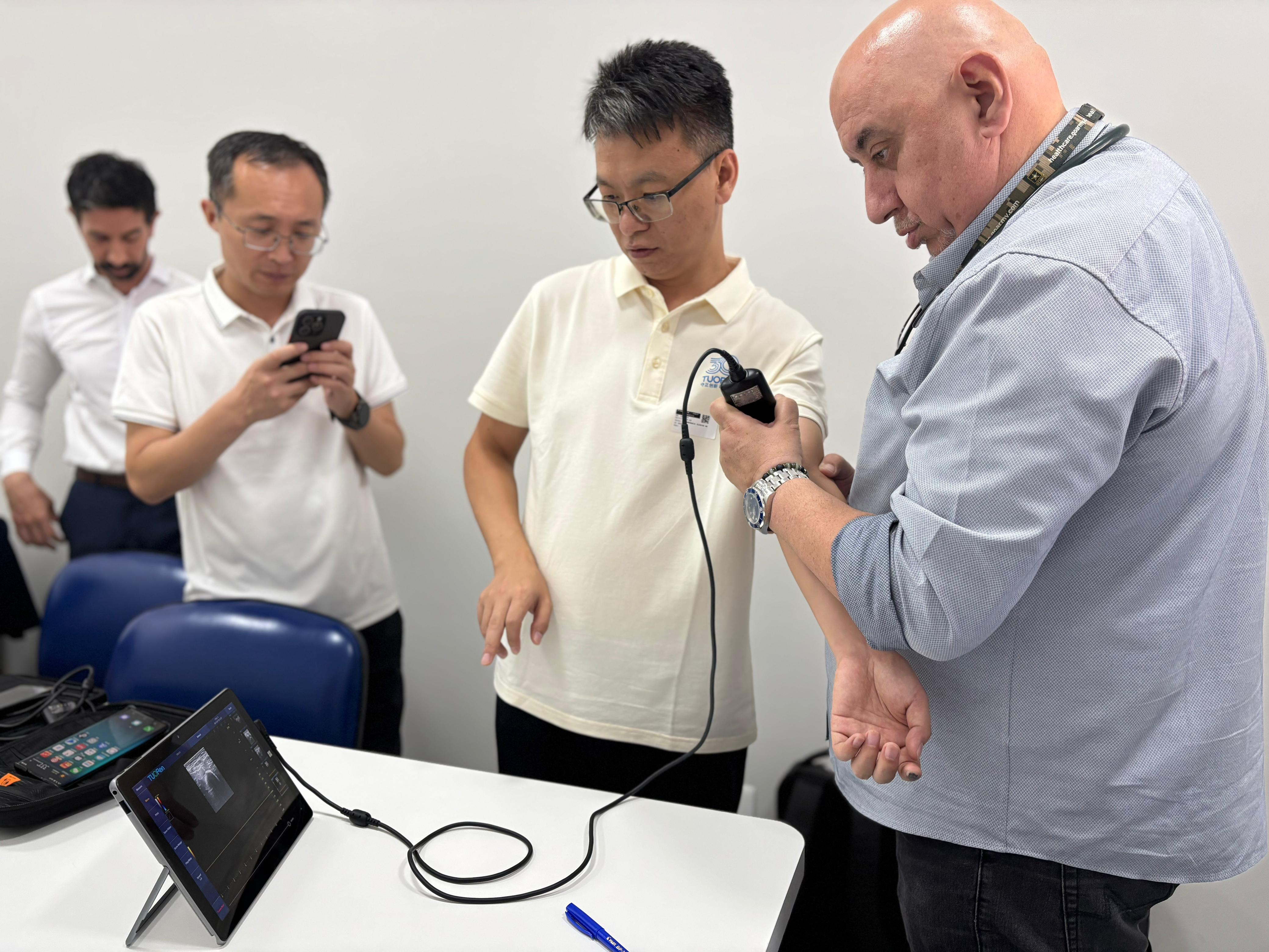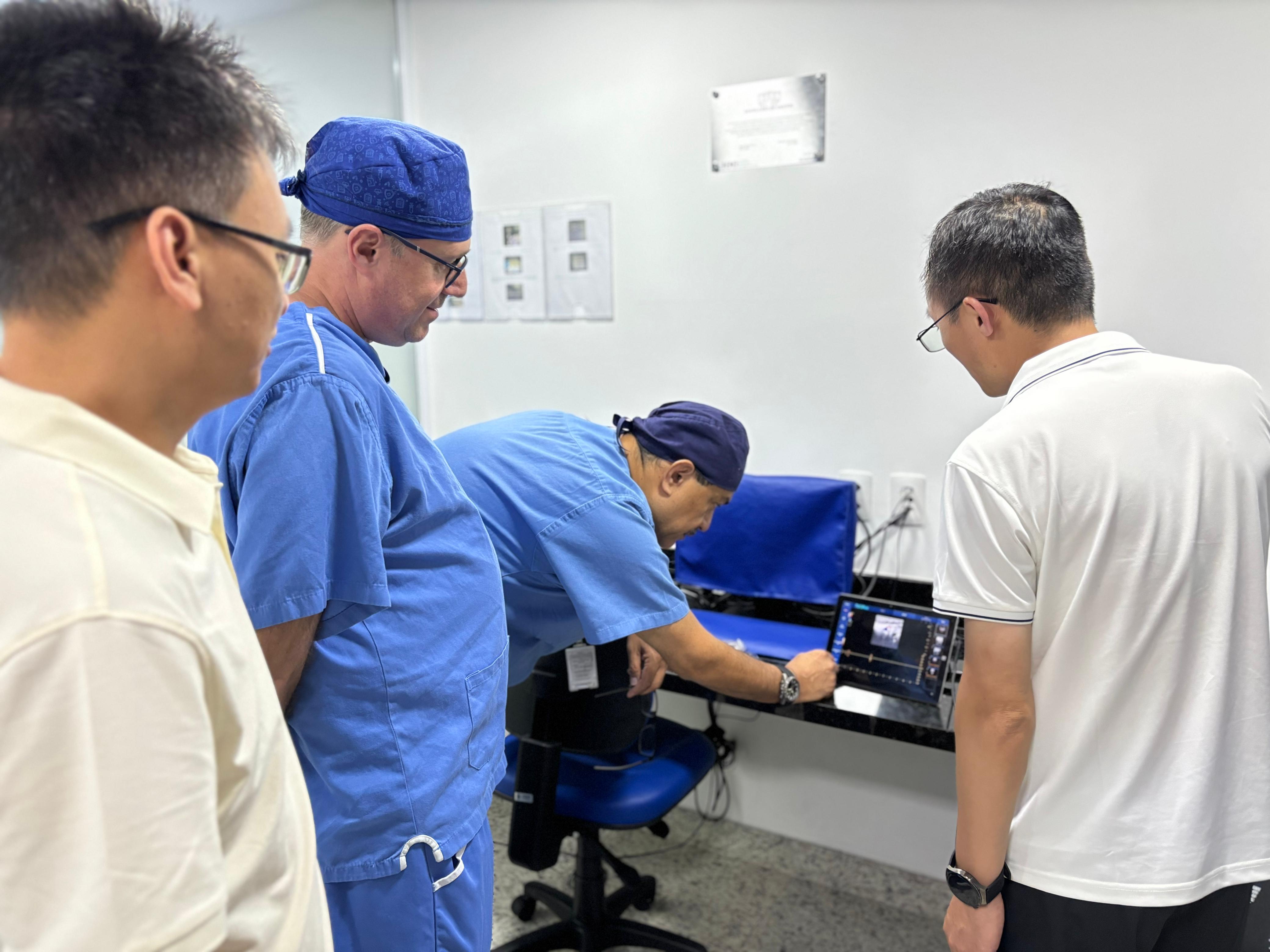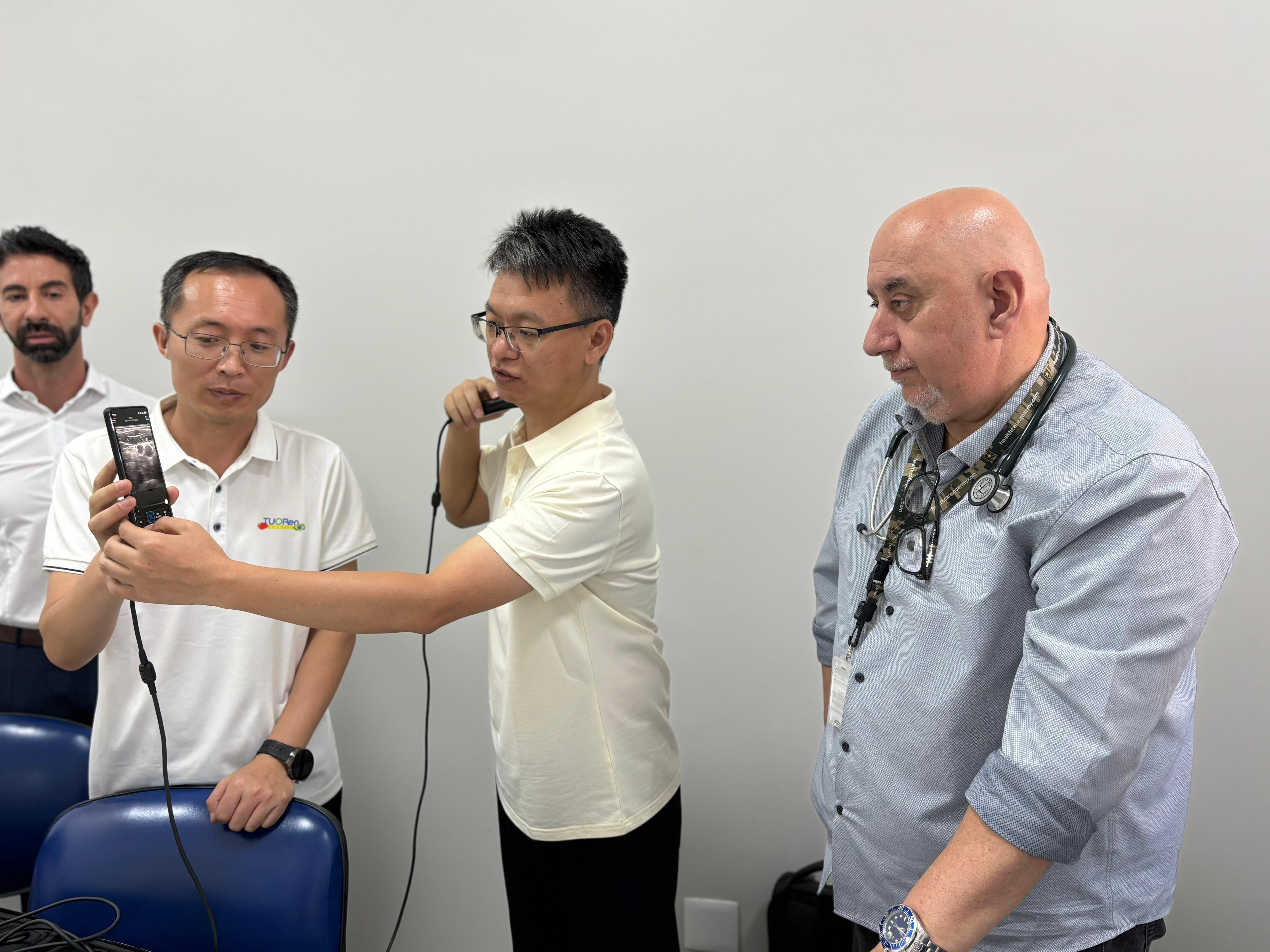 Ainda na visita, Zhang e Yao apresentaram o produto para os anestesistas da instituição, destacando a praticidade, facilidade e agilidade que o aparelho em questão promove para procedimentos cirúrgicos - "Com este aparelho o médico pode rastrear qualquer anormalidade durante o procedimento cirúrgico, além de ter uso também para o dia a dia das enfermarias do hospital", destacou Zhang Yu.
