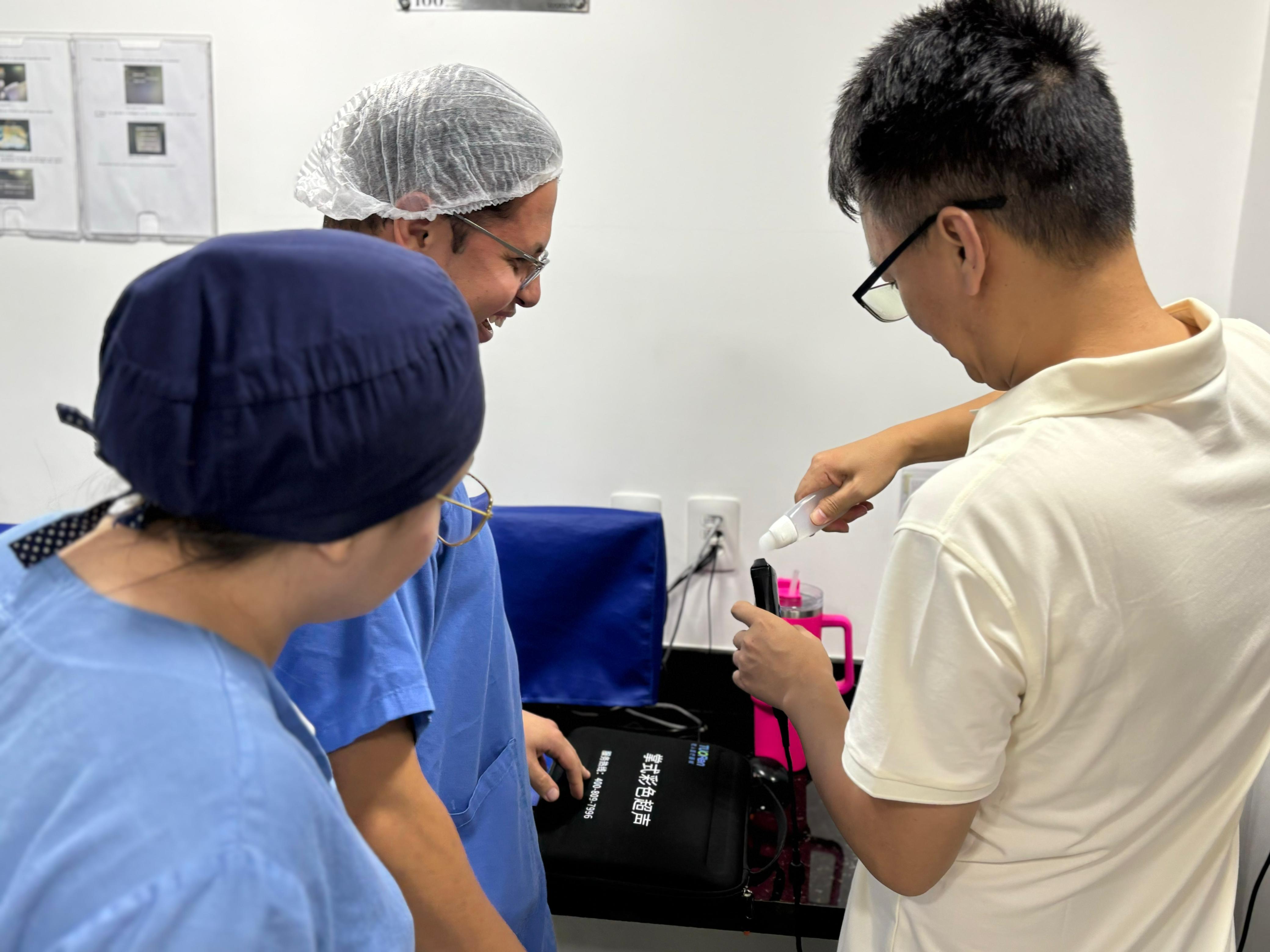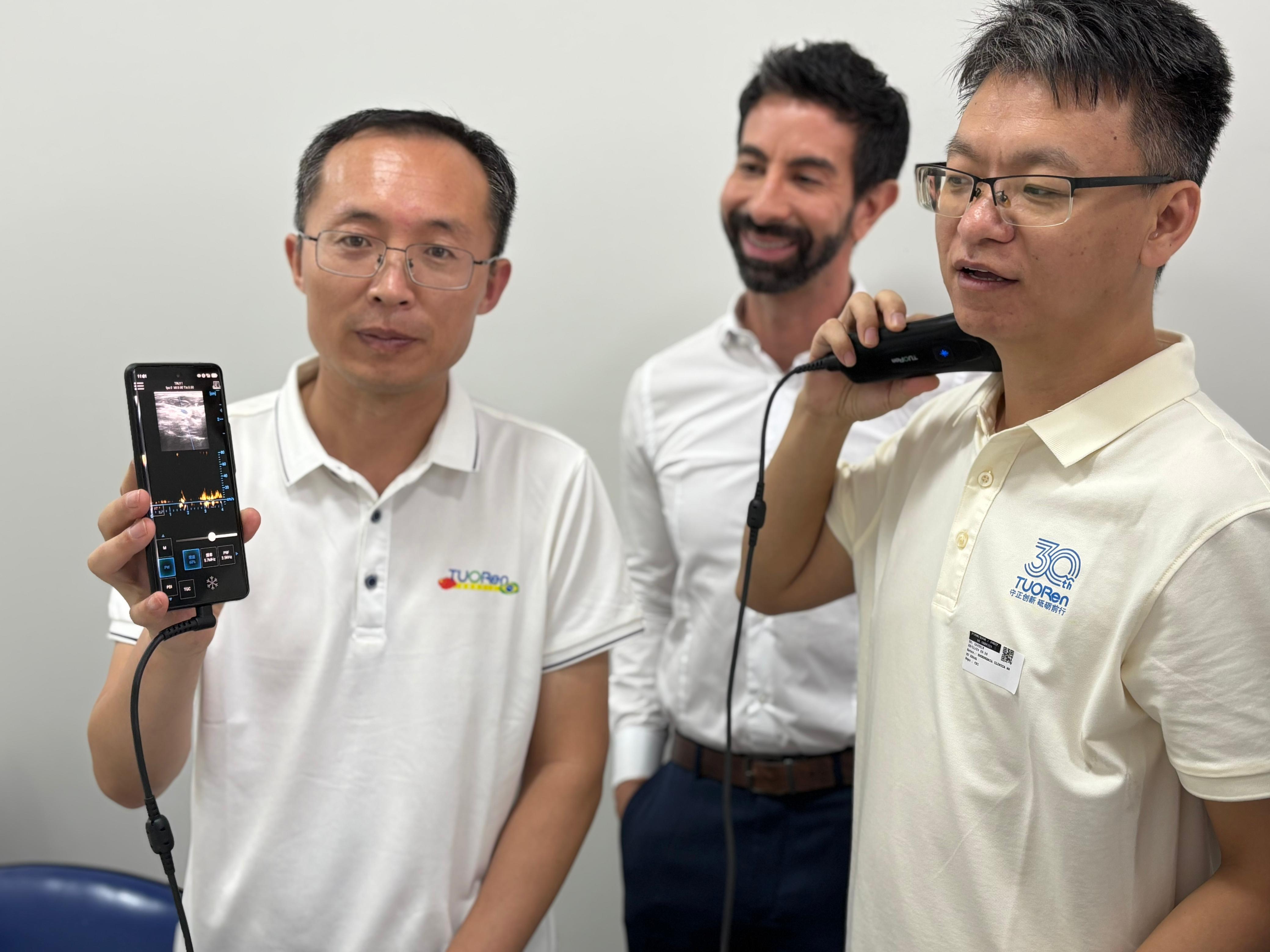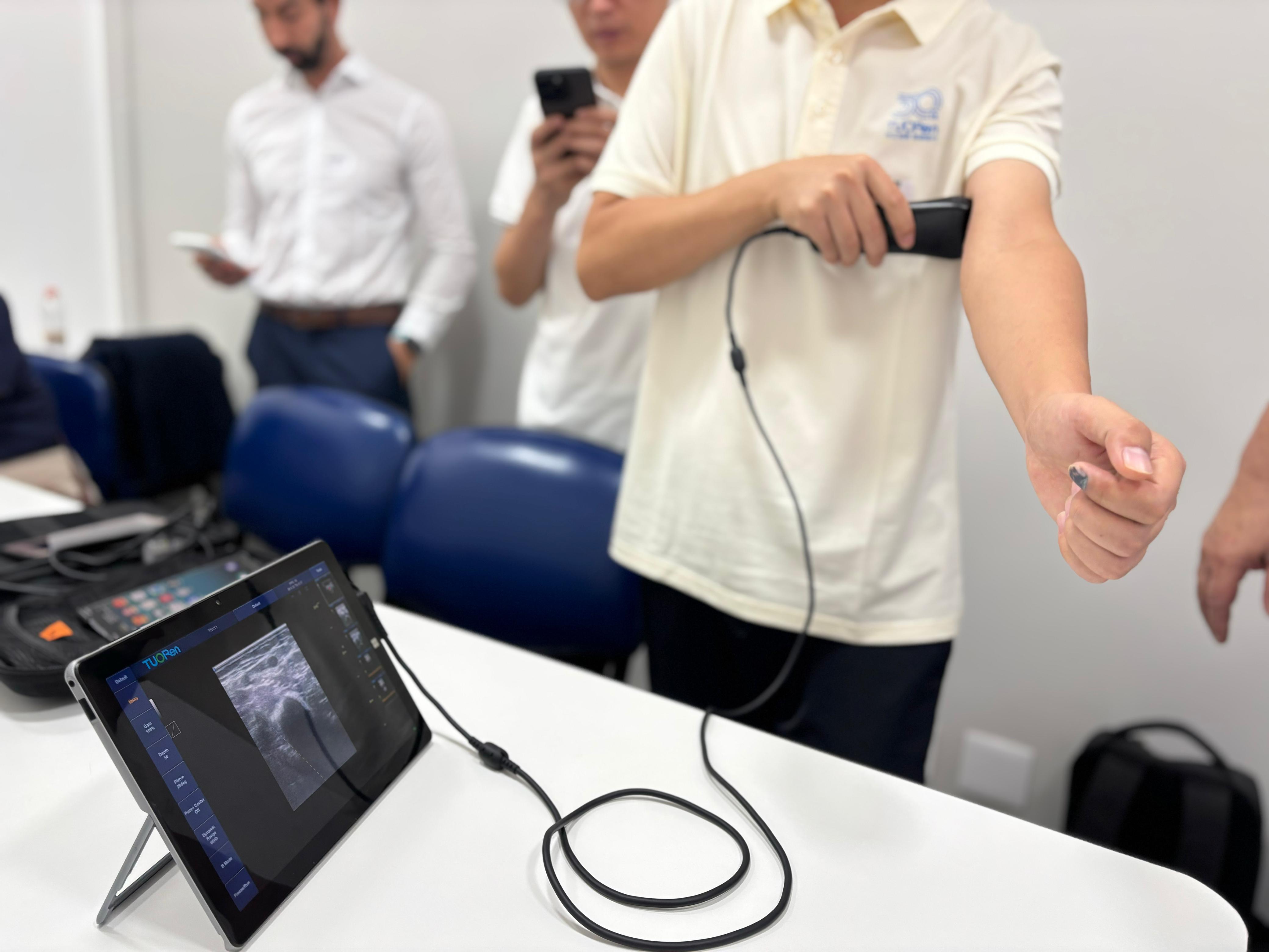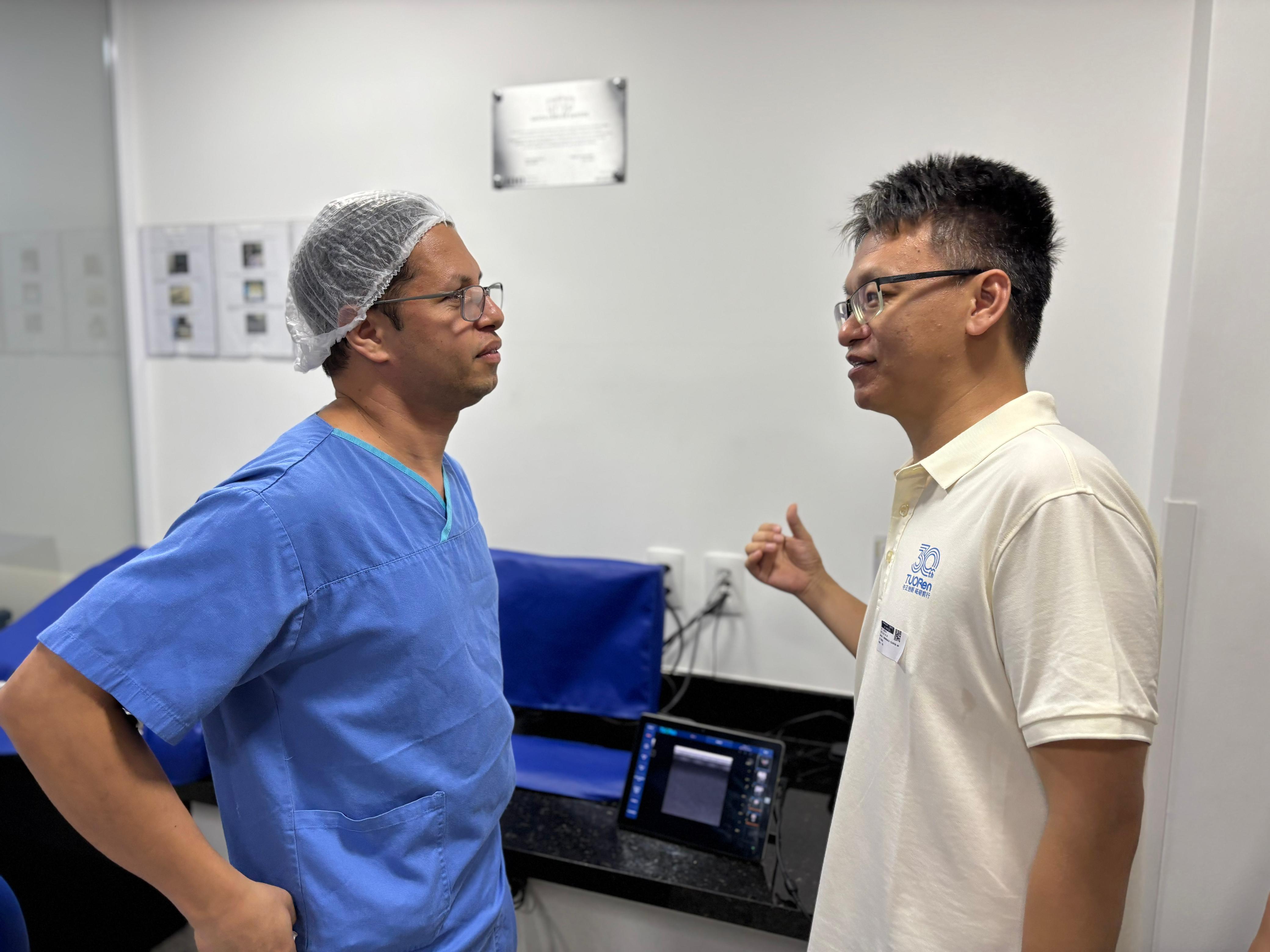 Ainda na visita, Zhang e Yao apresentaram o produto para os anestesistas da instituição, destacando a praticidade, facilidade e agilidade que o aparelho em questão promove para procedimentos cirúrgicos - "Com este aparelho o médico pode rastrear qualquer anormalidade durante o procedimento cirúrgico, além de ter uso também para o dia a dia das enfermarias do hospital", destacou Zhang Yu.