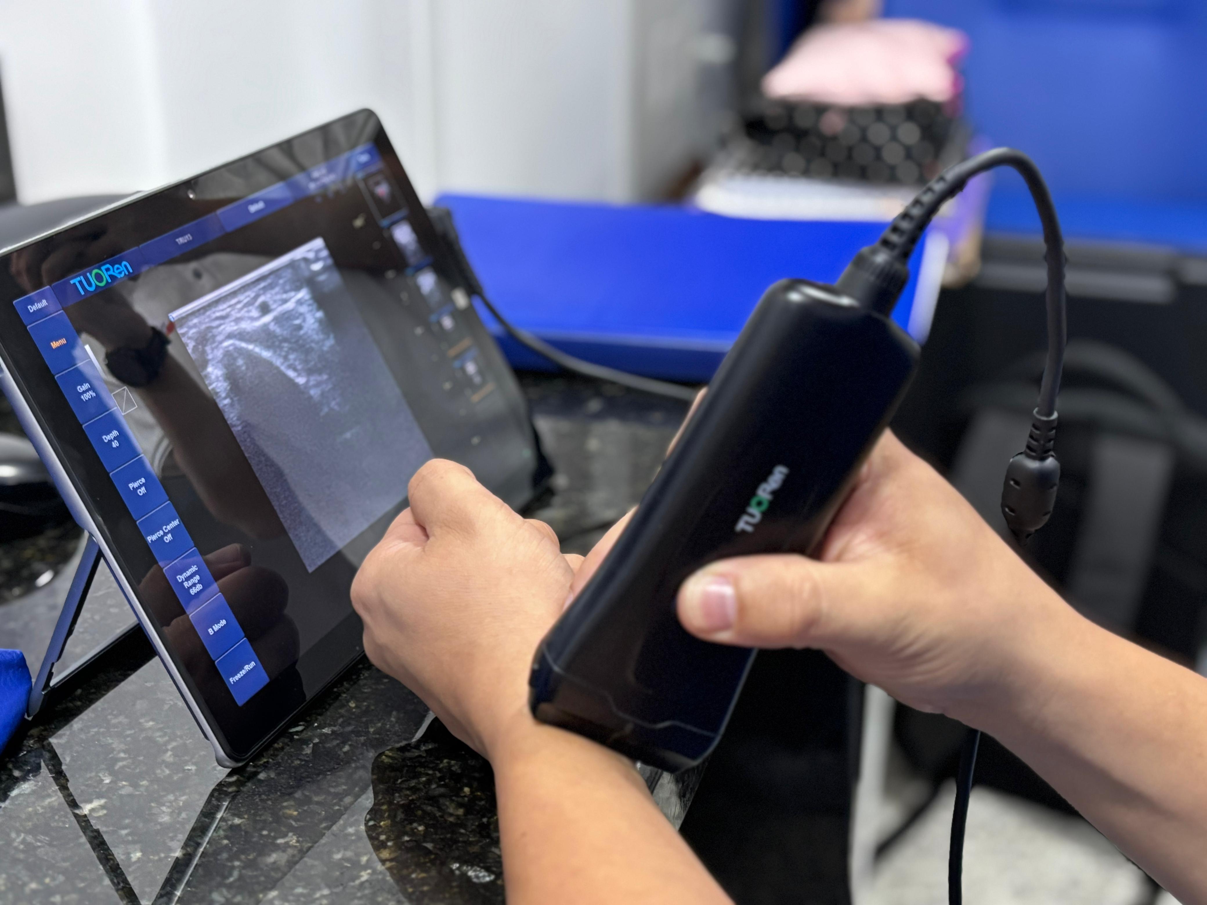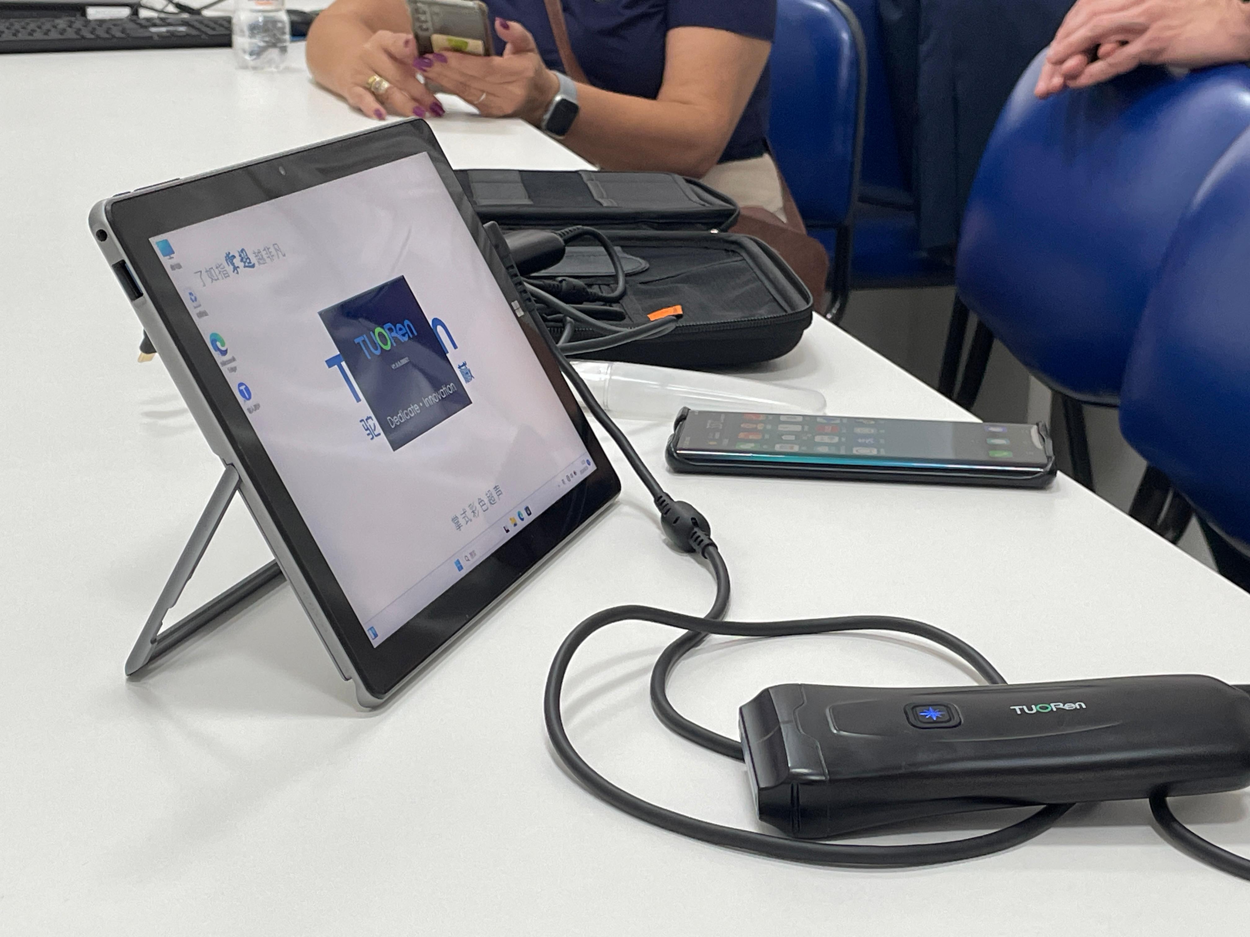 Nesta quinta-feira (28/11) a empresa Tuoren, da China, esteve na Santa Casa de Santos, representada por Zhang Yu e Yao Zengjun, para apresentar um aparelho de ultrassonografia digital destinados a aparelhos móveis.
