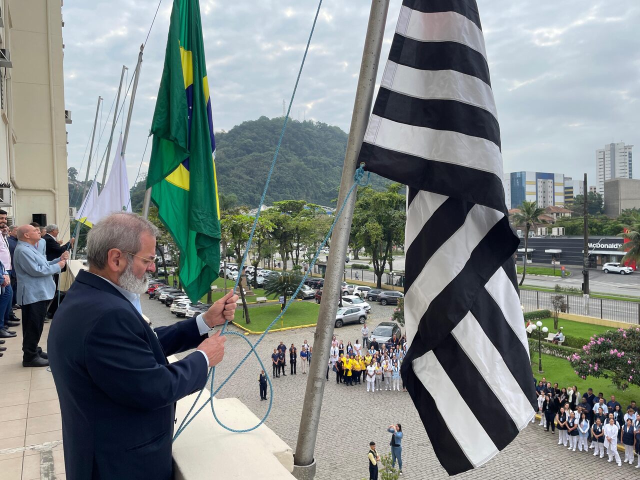 Da sacada da Santa Casa, gestores e membros da Mesa Administrativa e Conselho realizaram o hasteamento das bandeiras, conforme segue: provedor, Ariovaldo Feliciano (Bandeira do Brasil); presidente do Conselho Geral, Orlando Viscardi Junior (Bandeira de São Paulo); vice provedor e presidente da Câmara Municipal de Santos, Carlos Teixeira Filho (Bandeira de Santos); 1º Tesoureiro da Mesa Administrativa, Antonio Carvalho (Bandeira da Santa Casa de Santos); presidente da C.C.Q. , Eliana Lopes Feliciano (Bandeira do voluntariado da CCQ); presidente do voluntariado das Amarelinhas, Aparecida Regina Ramos Santos (Bandeira das Amarelinhas – AVOSC); gestora de Enfermagem, Enfª. Rita Rocha (Bandeira da Enfermagem). Também marcaram presença nos Festejos de Santa Isabel: o mordomo geral, Clóvis Moblize; a vice-presidente do Conselho Deliberativo, Marise Céspedes Tavolaro; o diretor de apoio, Octavio Tavolaro Filho; o diretor clínico, Dr. Constantino Kader Conde; o diretor comercial, Fábio Isoldi; o diretor jurídico, Dr. Aldo Santos Pinto; o diretor técnico, Dr. Alex Macedo; o vice-diretor clínico, Dr. Eloi Moccellin; e o coordenador médico do OS, Dr. Daniel Lustoza.