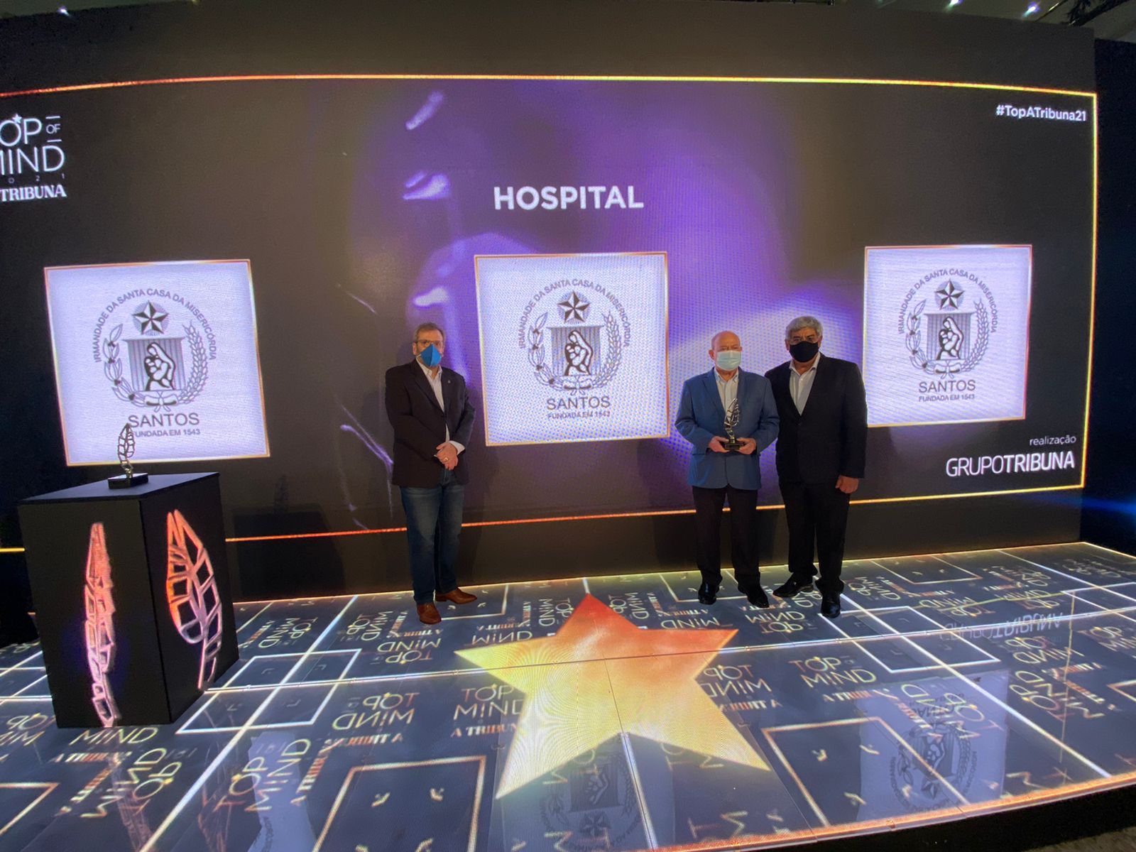 O hospital mais tradicional e moderno da região, é também o mais lembrado pelo segundo ano consecutivo. A Santa Casa de Santos recebeu na noite de 28/10 o troféu Top Of Mind 2021, entregue pelo Grupo Tribuna em cerimônia de premiação, que contou com as presenças do provedor Ariovaldo Feliciano, do vice provedor Cacá Teixeira e do superintendente, Augusto Capodicasa.