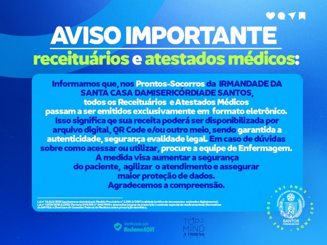 A partir de segunda-feira, dia 9 de fevereiro de 2026, todos os receituários e atestados médicos emitidos nos Prontos-Socorros da Irmandade da Santa Casa da Misericórdia de Santos passarão a ser disponibilizados exclusivamente em formato eletrônico.