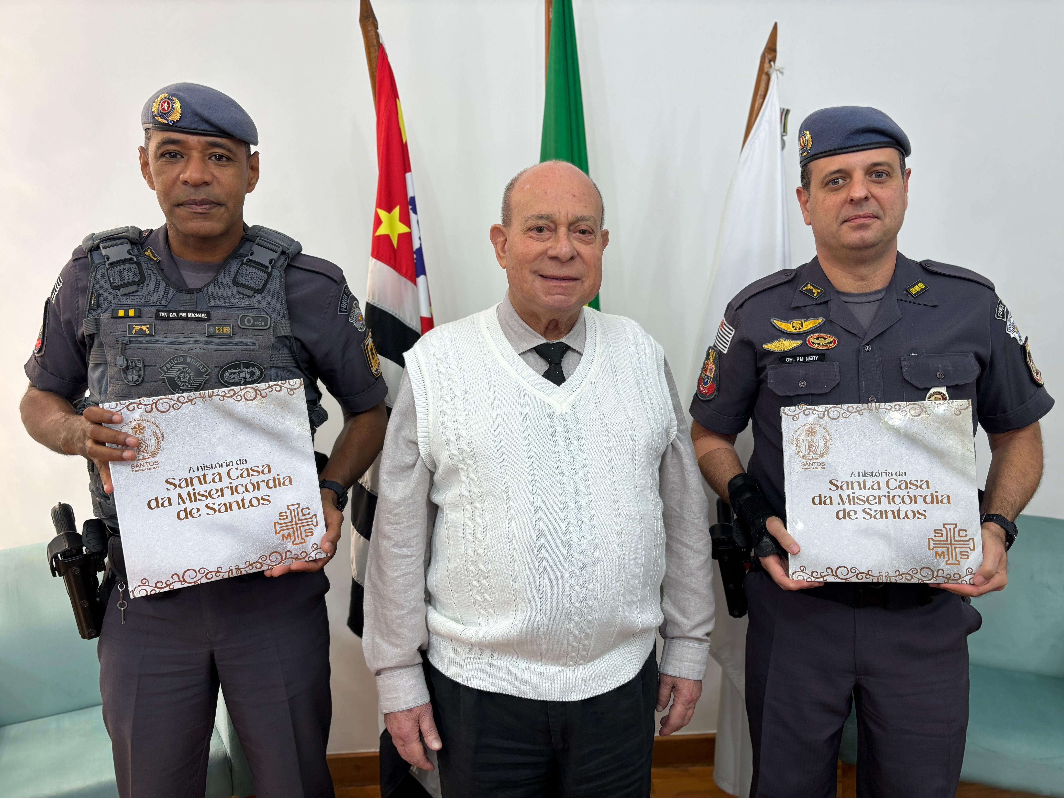 Ao final da visita, o provedor Ariovaldo presenteou a comitiva da PM com o livro capitular que conta a história dos 482 anos da Santa Casa de Santos.