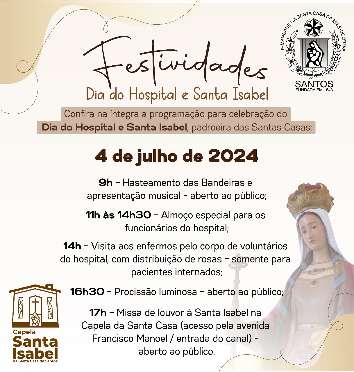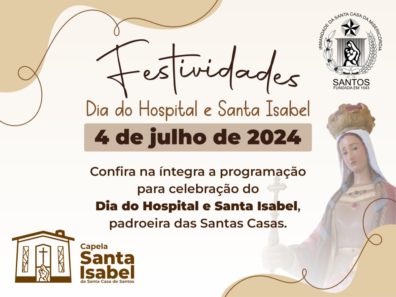 No dia 4 de julho, a Santa Casa de Santos promoverá uma programação especial para celebrar o dia de Santa Isabel, a padroeira das Santas Casas.