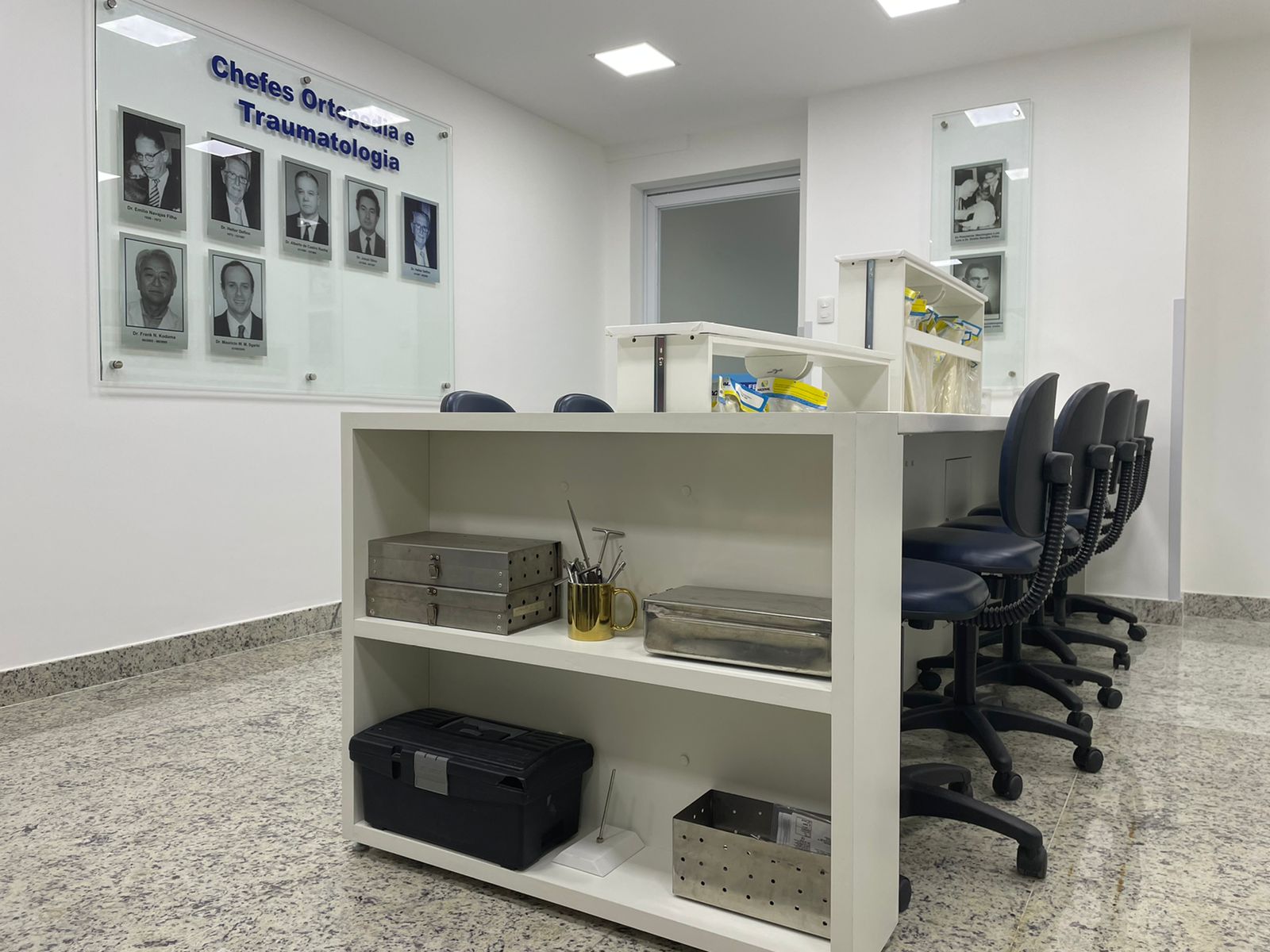 O local também conta com televisor de led full hd, instrumentos cirúrgicos para simulações, e um painel ilustrando todos os médicos chefes que fizeram parte da história do serviço.