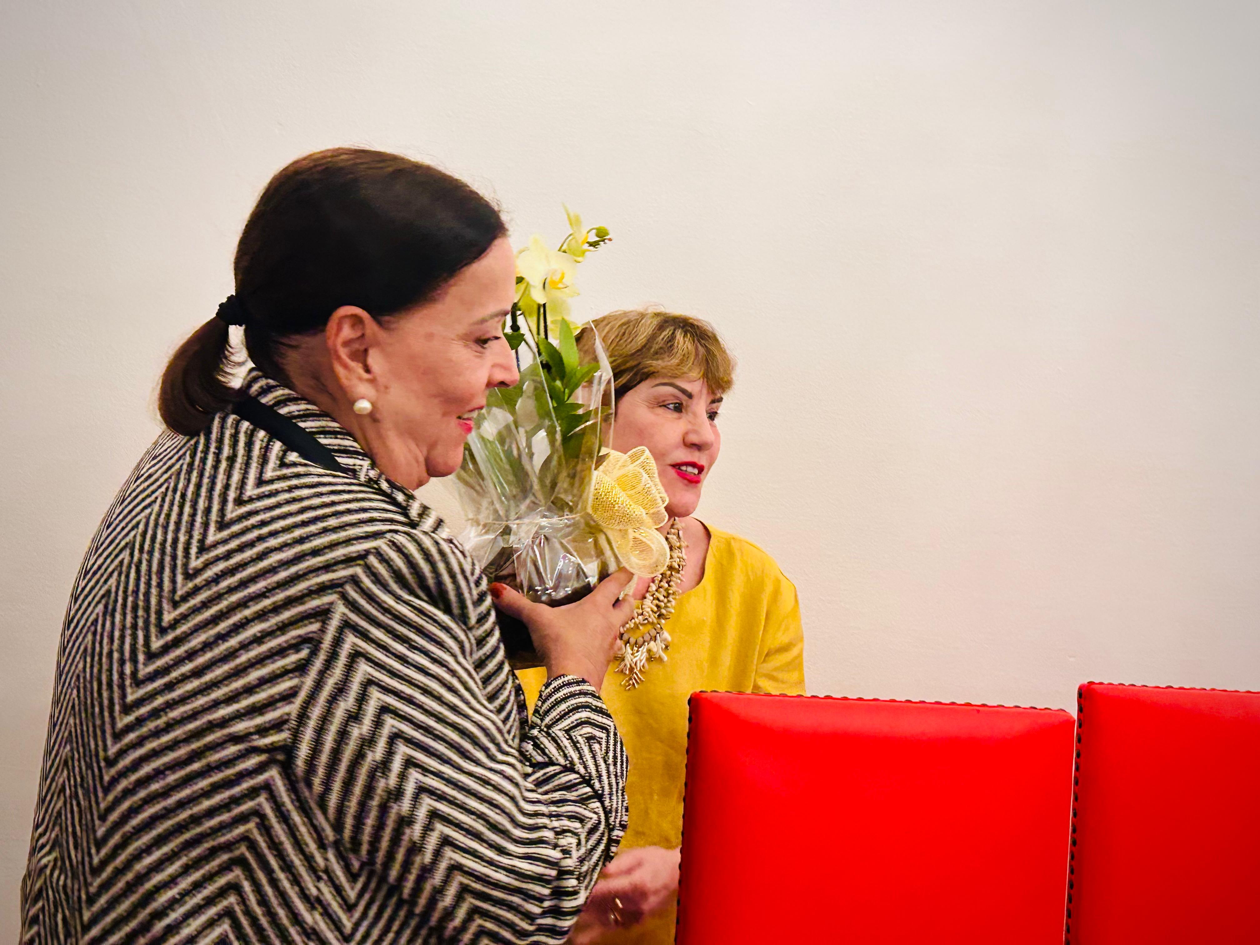 Para encerrar a solenidade, a Presidente da Comissão de Controle da Qualidade, Eliana Lopes Feliciano entregou arranjos de orquídeas para a sobrinha Cristina Prata Amendola, Diretora Médica do Hospital do Amor e para a irmã Clarice Duarte Prata.