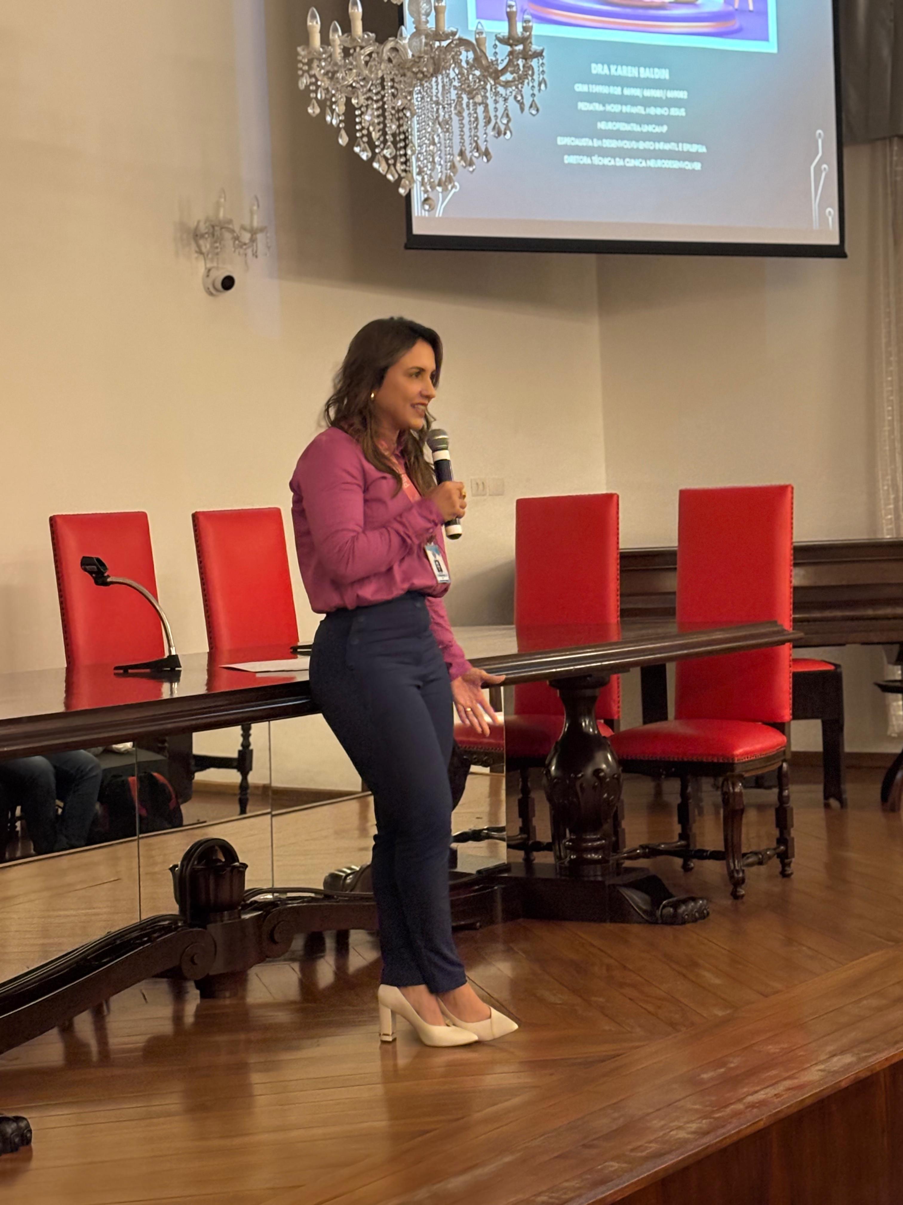 A segunda palestra foi a Neuropediatra Dra. Karen Baldin que explicou sobre os principais distúrbios como dislexia, TDAH e discalculia, seus sinais precoces e impactos emocionais. “Os principais sintomas iniciais incluem: Dislexia: dificuldade com leitura, escrita, soletração e alfabetização. TDAH: desatenção persistente, hiperatividade, impulsividade, presentes por pelo menos seis meses em múltiplos ambientes; causa impacto acadêmico e emocional. E discalculia: dificuldade significativa com operações matemáticas e raciocínio lógico. Além do rendimento escolar prejudicado, essas condições podem gerar frustração, estresse e afetar negativamente a autoestima dos pequenos”.