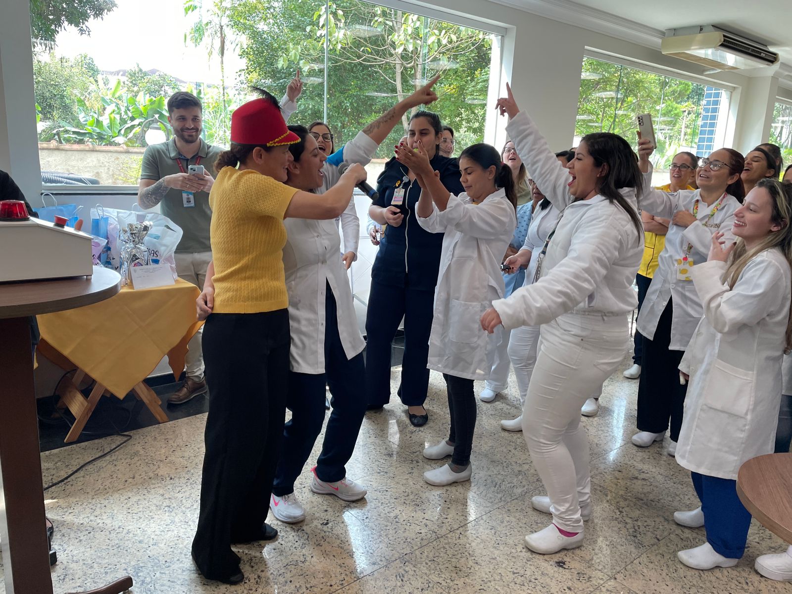 Após a palestra, teve uma gincana onde foram divididos grupos para competirem entre si na prova “Qual é a música?” usando nomes relacionados com questões que mexem com a saúde mental. Para estimular o alto astral, também foi criado um espaço lúdico, com ambiente instagramável e uma cabine de fotos exclusiva, feita pela equipe do DMG, que foi o grande destaque do local.