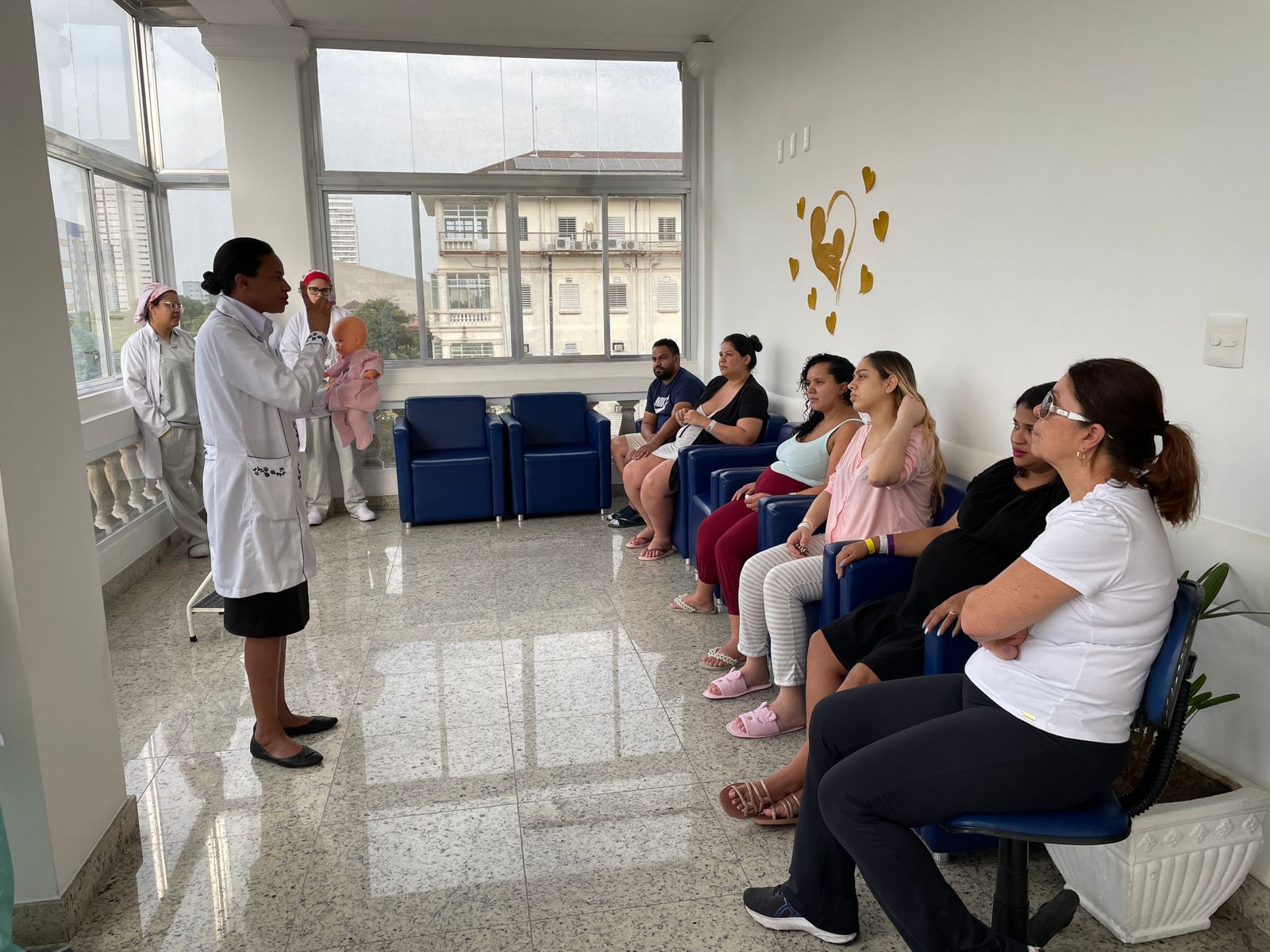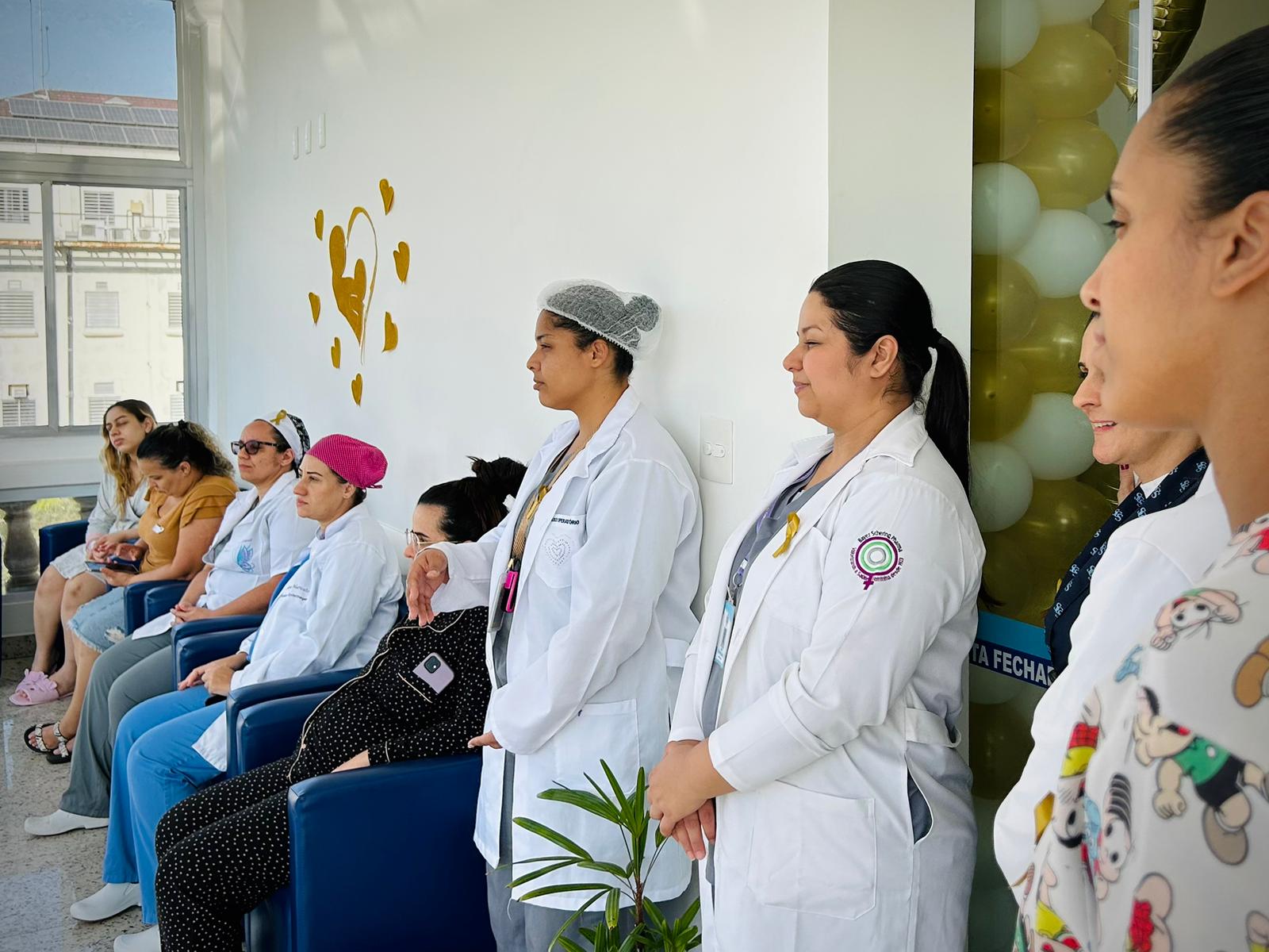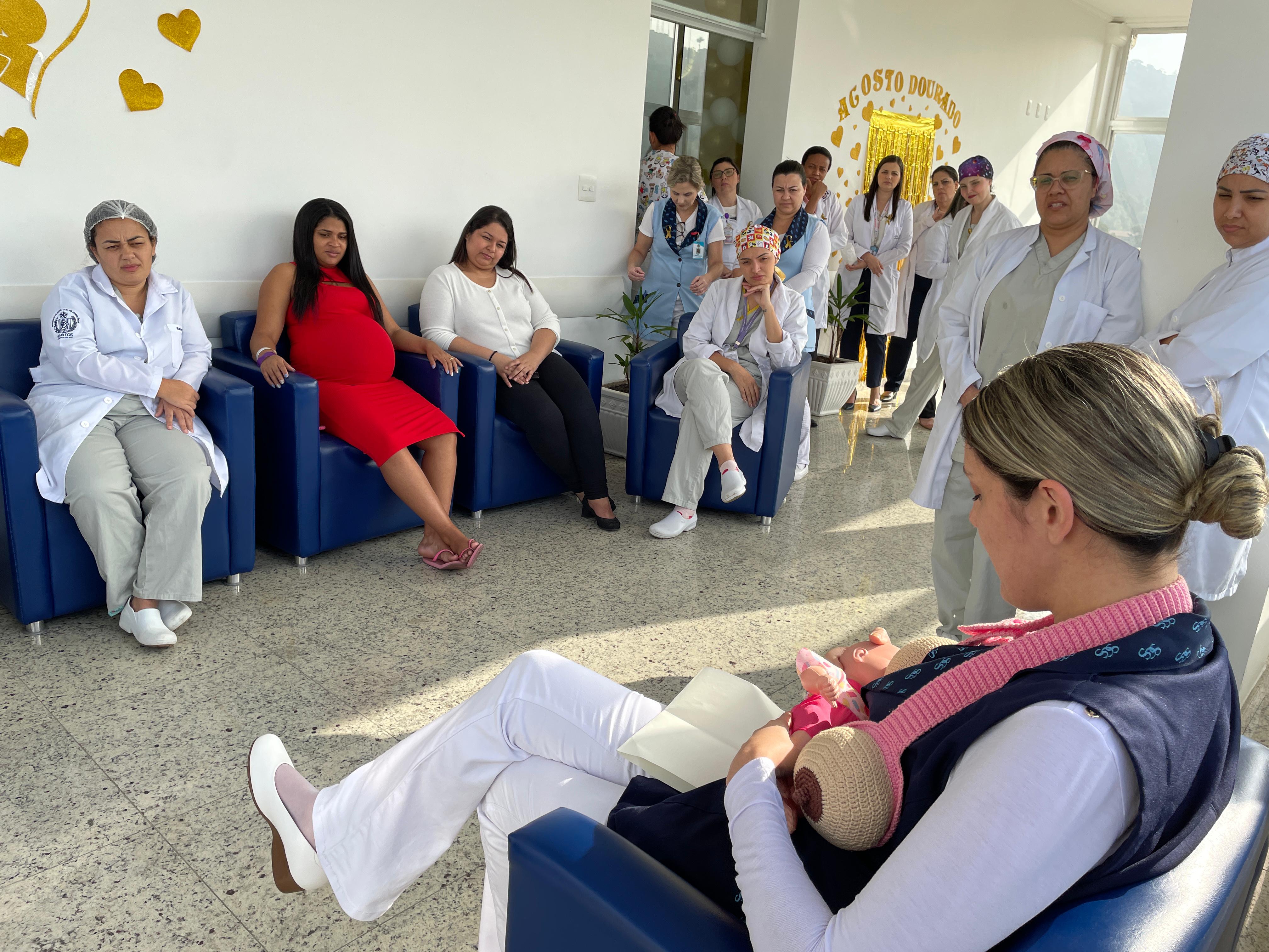 Com a Maternidade toda enfeitada da cor dourada, os colaboradores fizeram diversas atividades com as recém mamães e também com as gestantes que estavam internadas. No primeiro dia, a enfermeira Edlaine Ramos, reuniu as pacientes no solarium da ala e falou sobre Aleitamento e mostrou na prática as técnicas de amamentação.