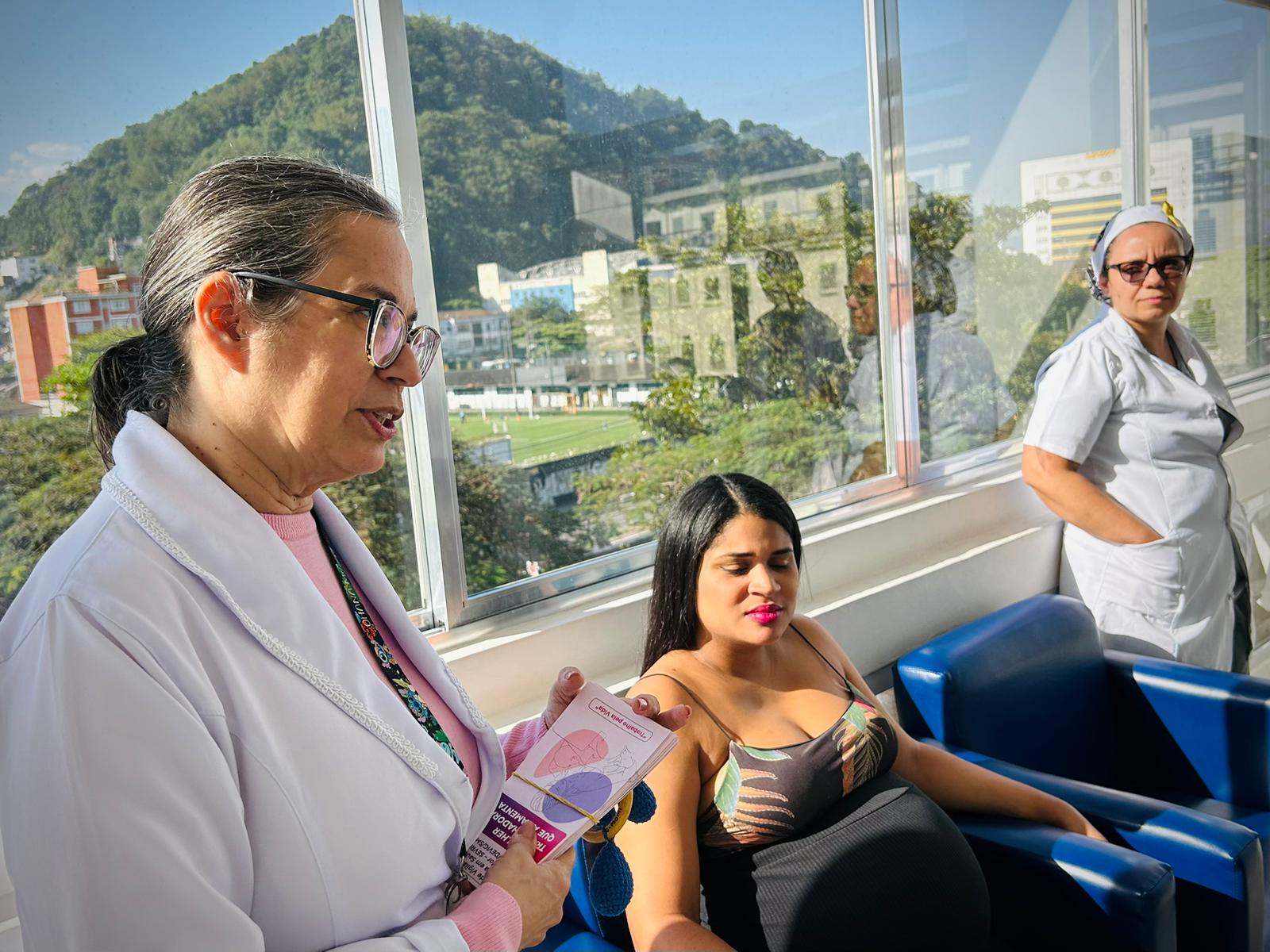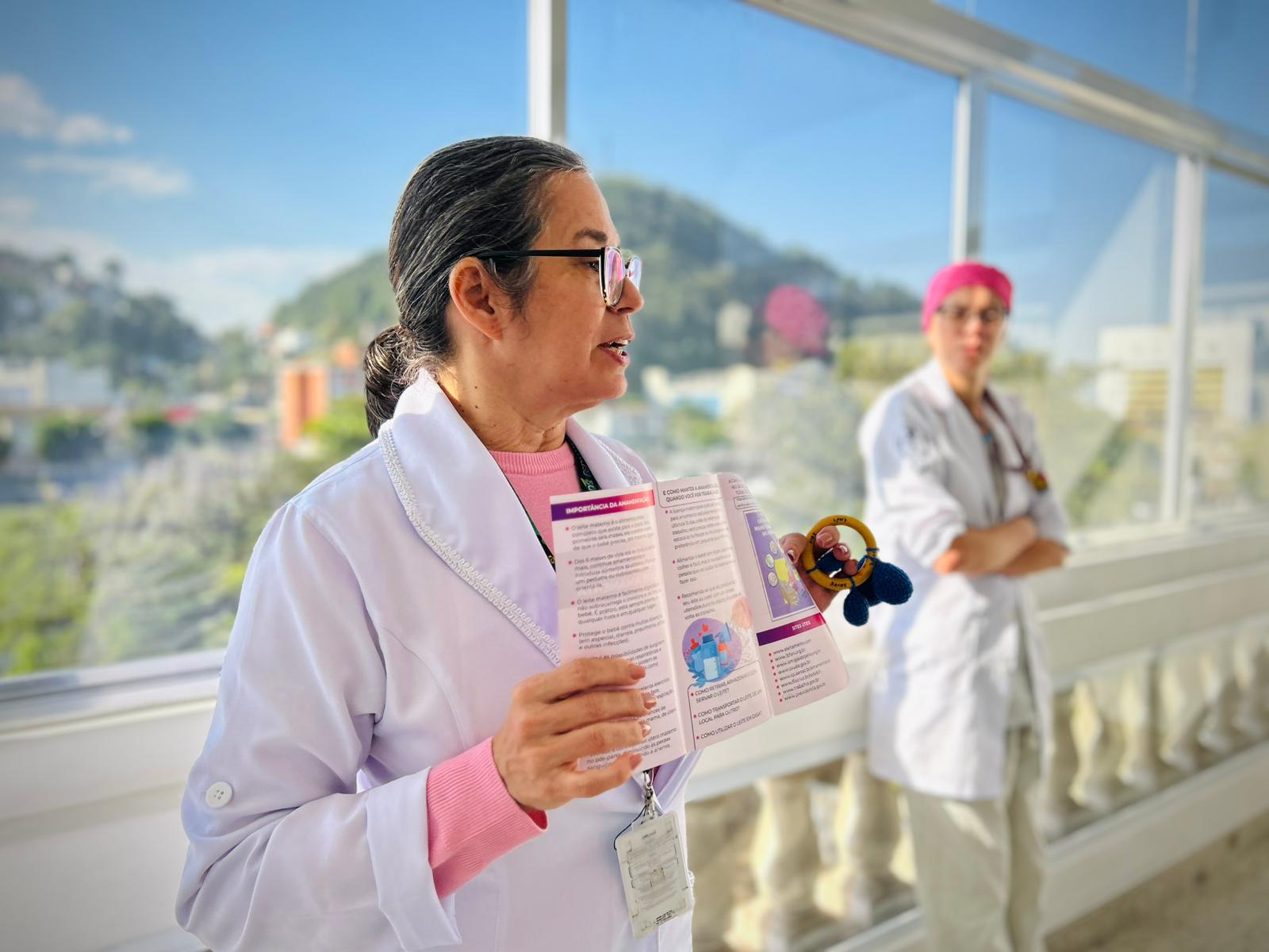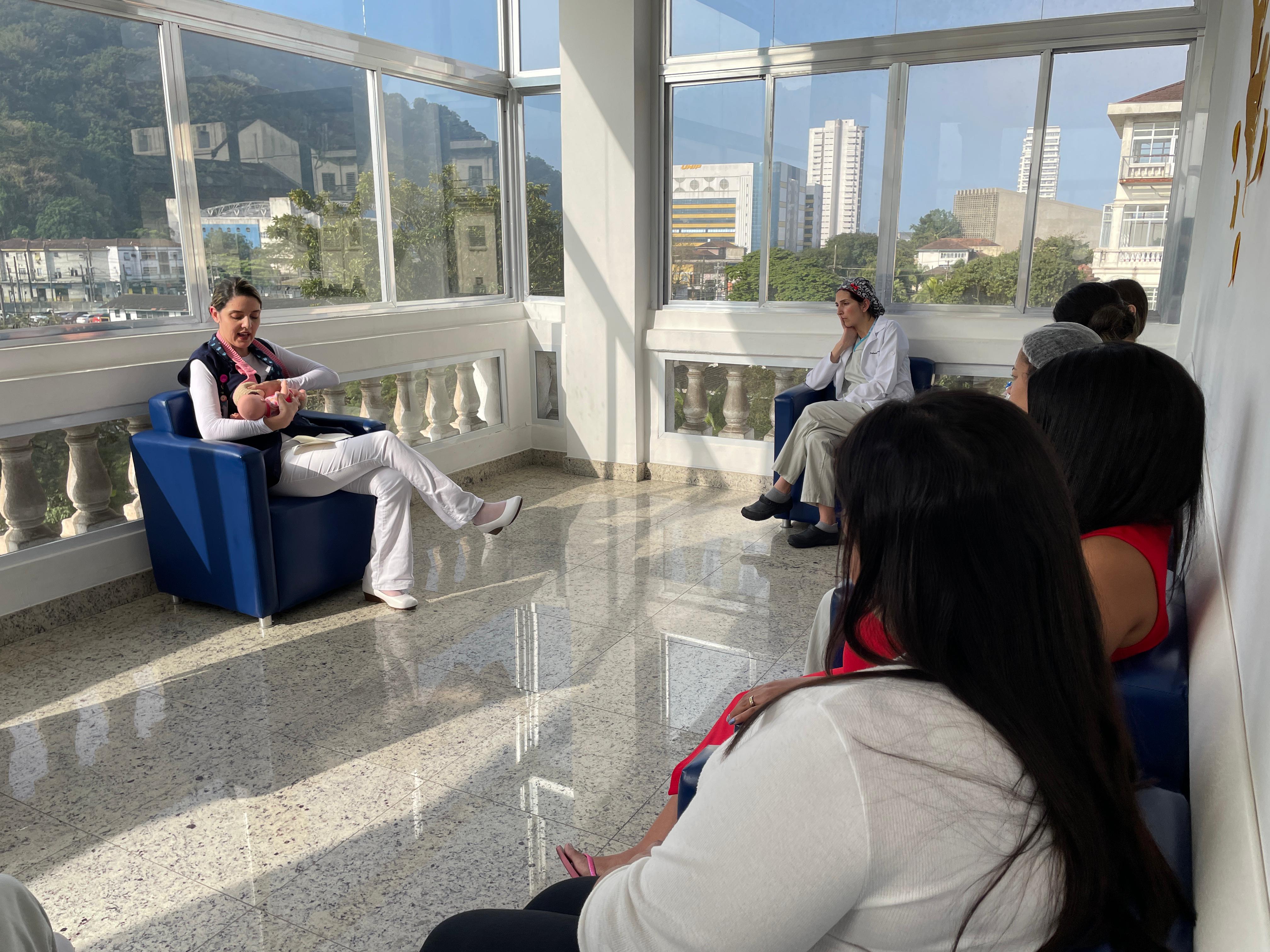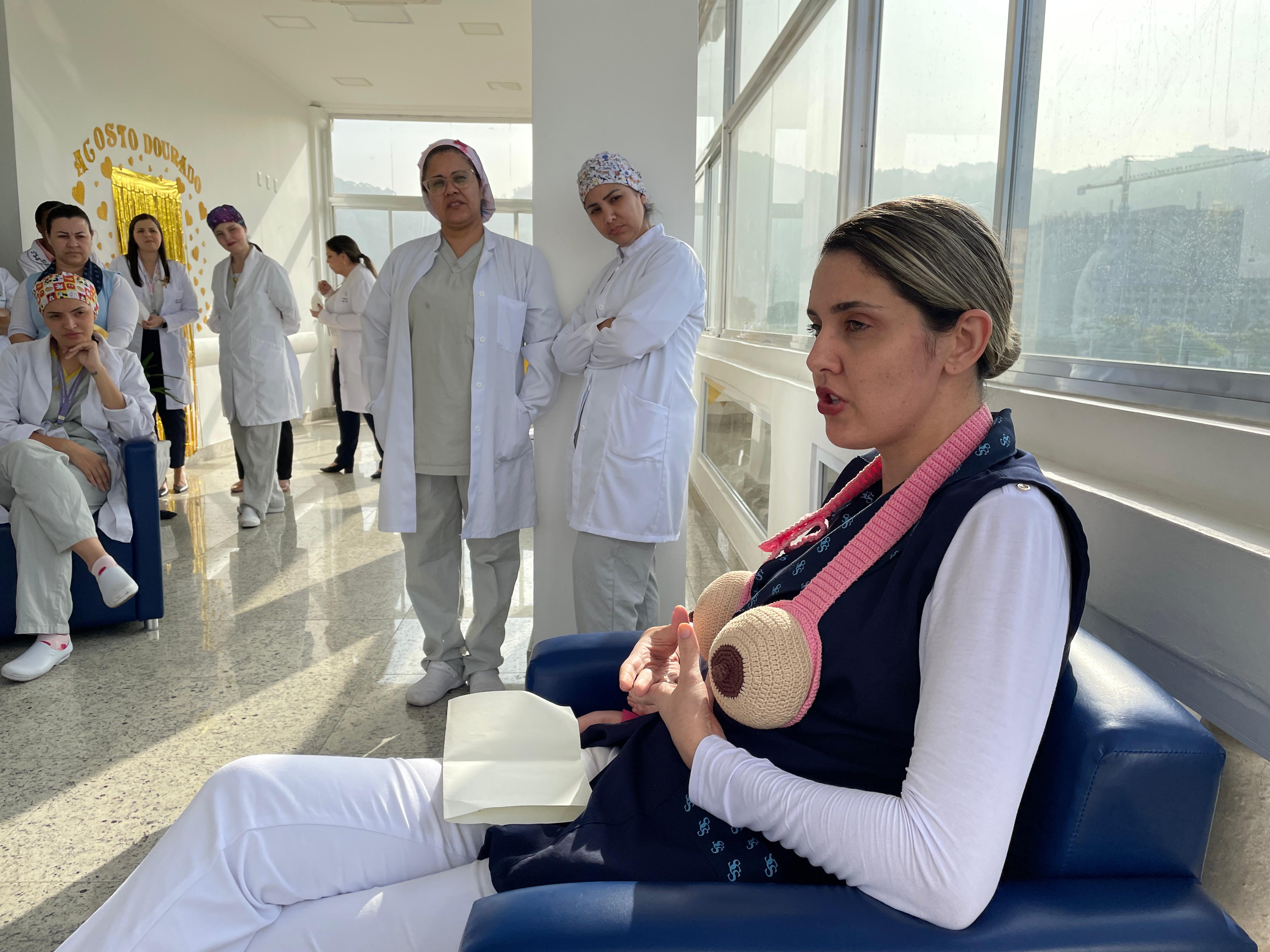 No segundo dia de ação, as mamães e gestantes da Maternidade tiveram uma palestra com a fonoaudióloga da instituição Eliane Blanco, que falou sobra a amamentação com visão realista e citou sobre as orientações fakes que aparecem na internet. Além disso, explicou que o aleitamento materno é um processo de aprendizado tanto para o bebê quanto para a mãe. E que o processo de solidificação da amamentação não é dependência única da mãe, cabe também ao acompanhante aprender e auxiliar neste processo para que o bebê seja amamentado até os seis meses, antes da introdução alimentar por via oral.