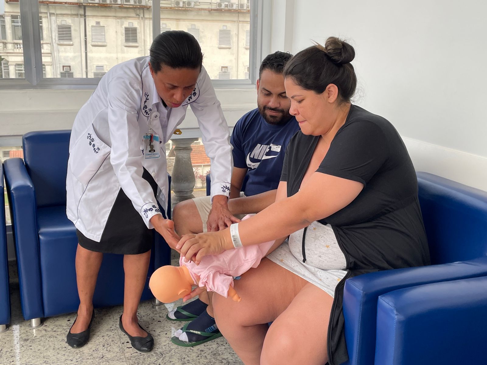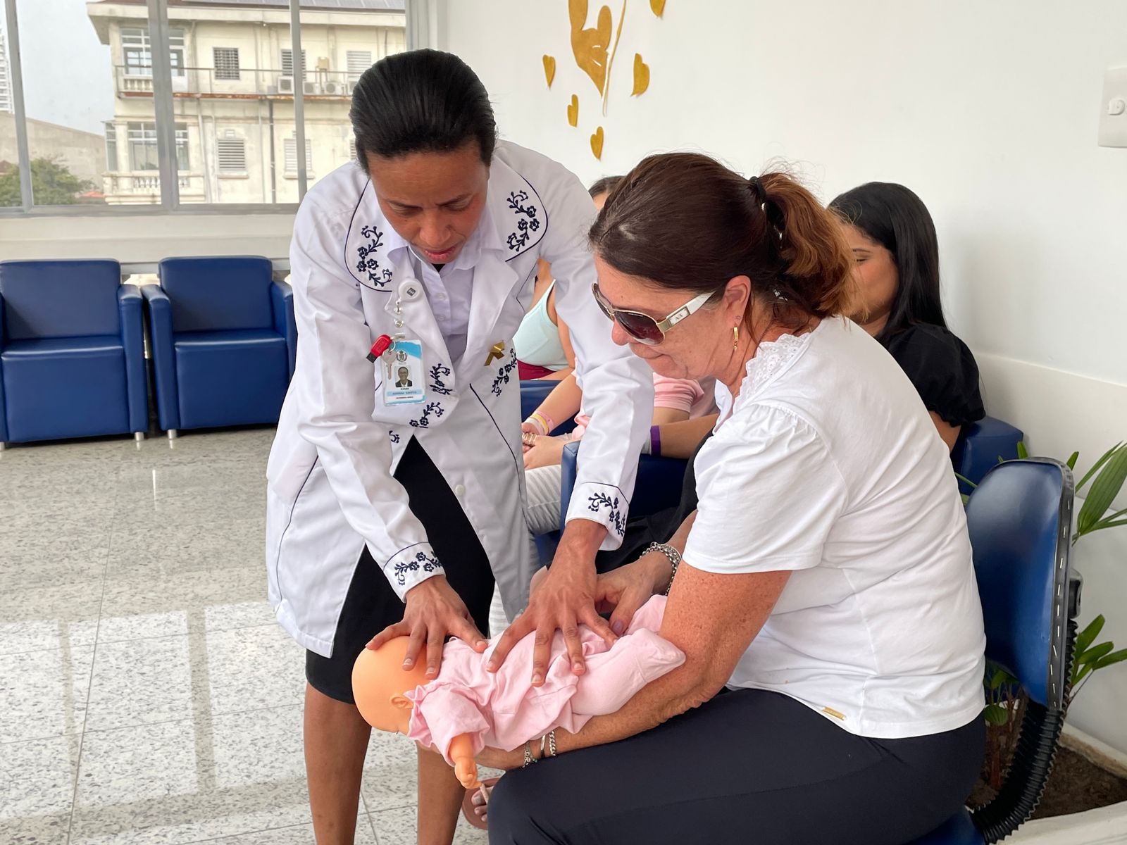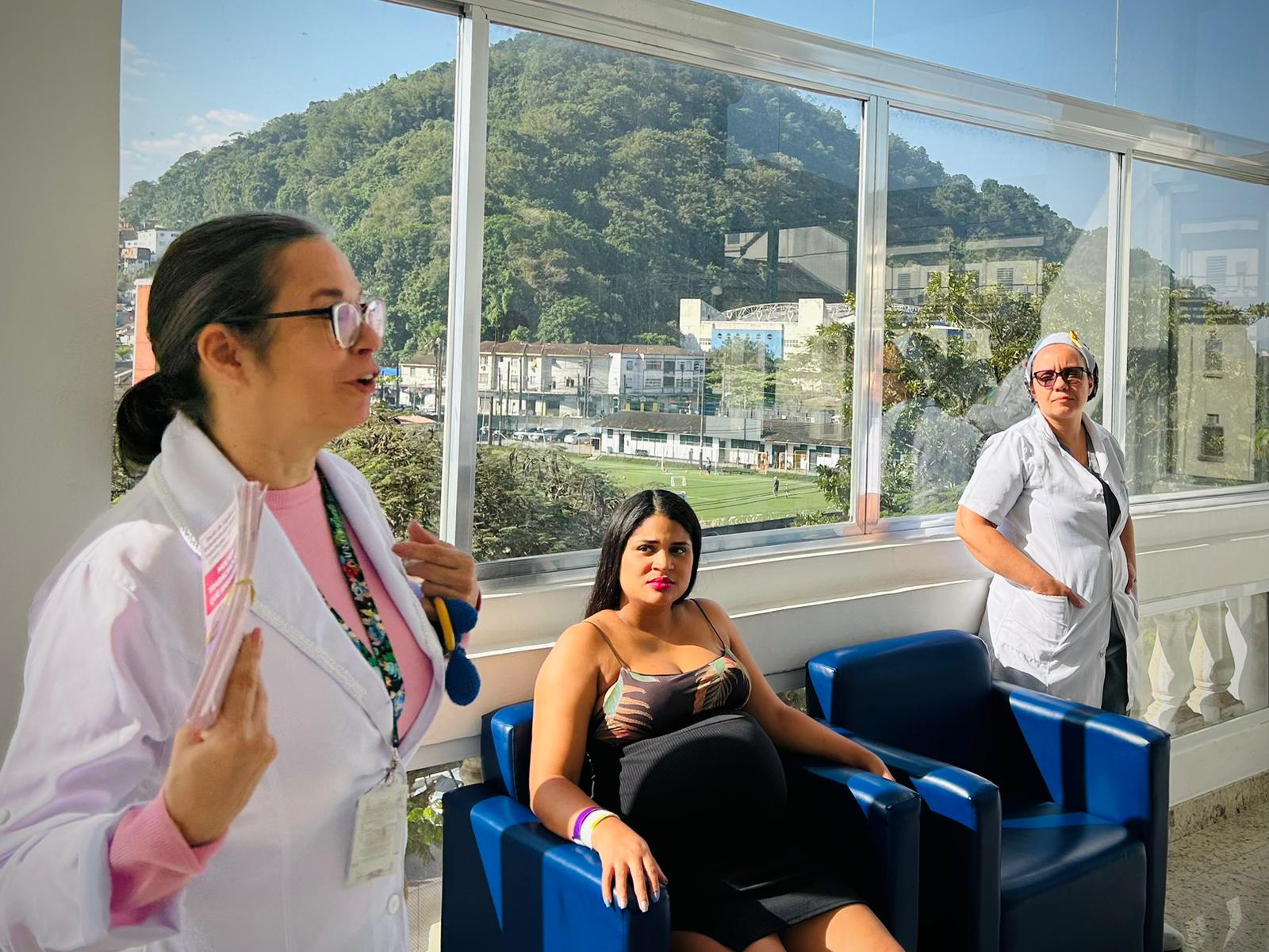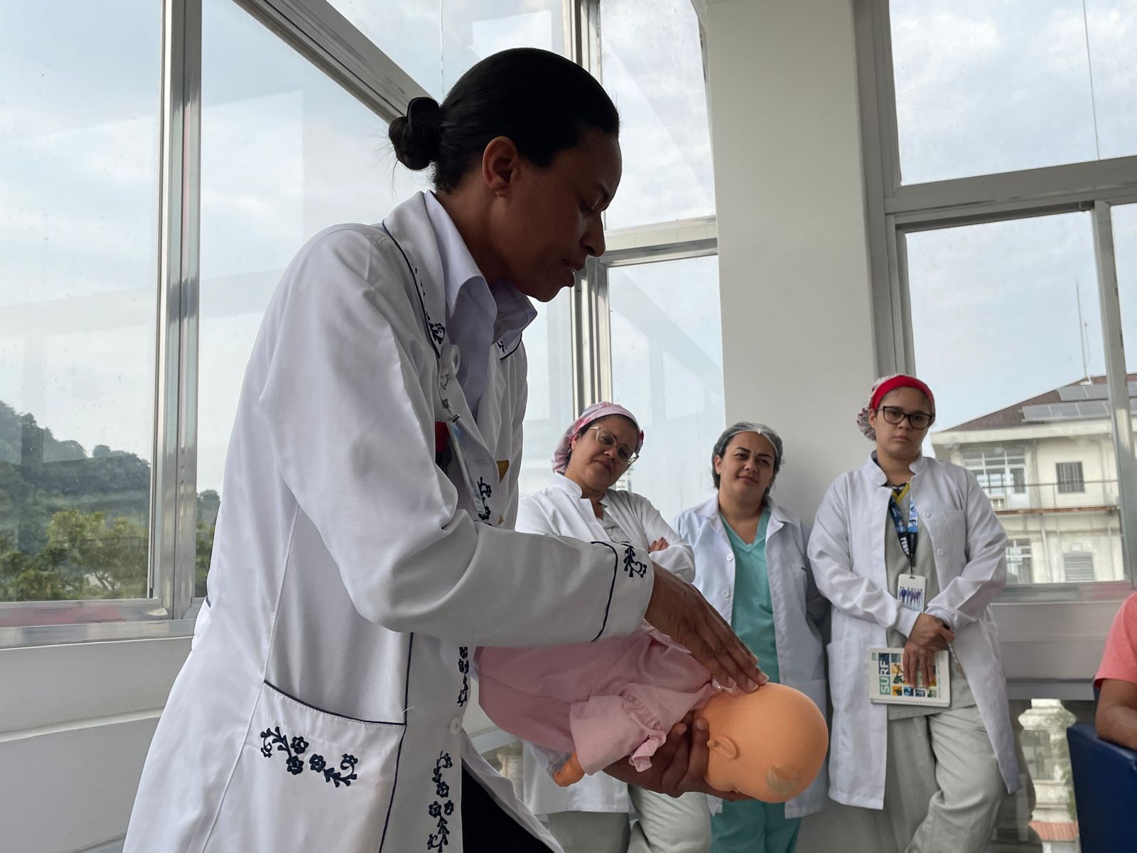 No terceiro dia de ação, foi a vez da enfermeira Adriana Silva, do setor de Educação Continuada da Santa Casa de Santos, falar sobre as manobras de desengasgo do recém-nascido. Um tema também muito importante e é um procedimento rápido de primeiros socorros para tratar asfixia por obstrução das vias respiratórias superiores.