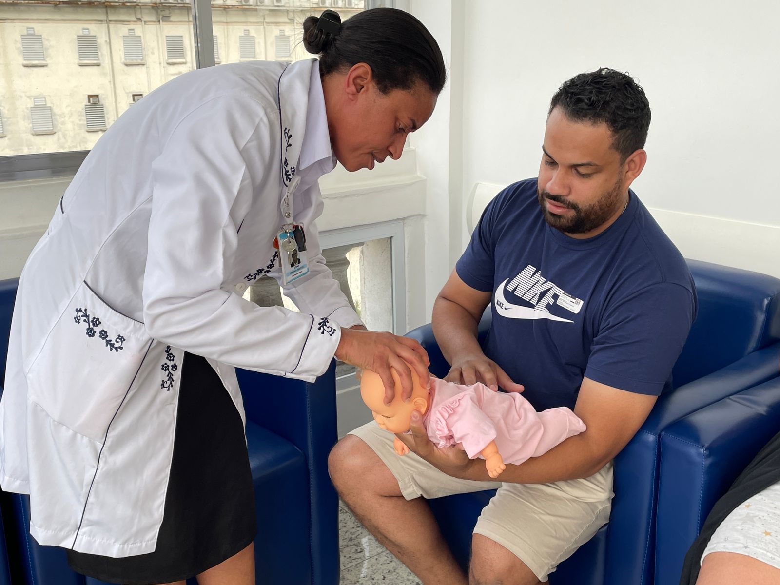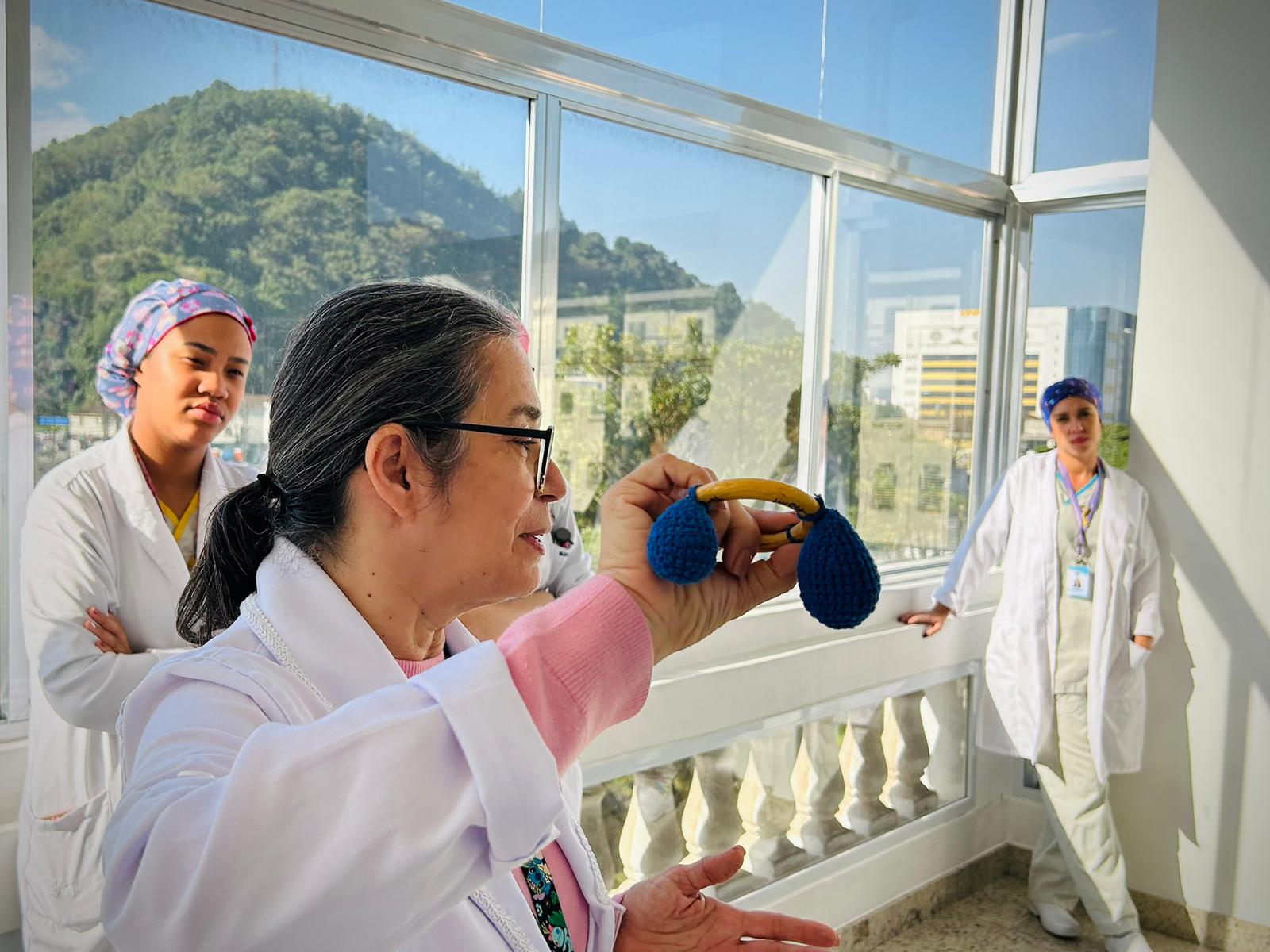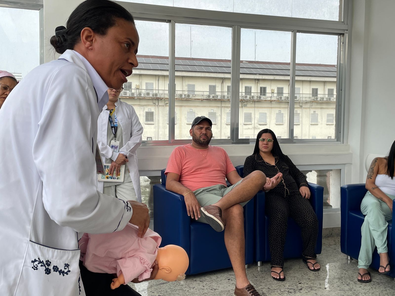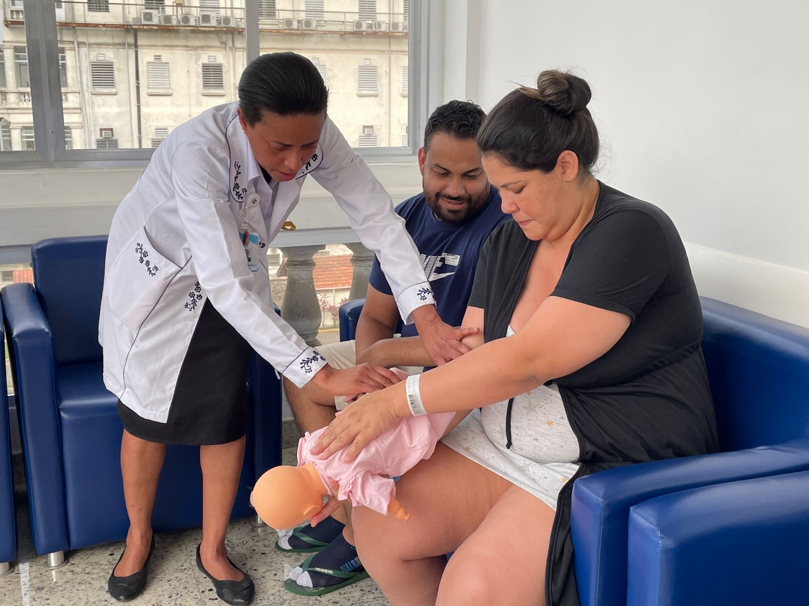 No terceiro dia de ação, foi a vez da enfermeira Adriana Silva, do setor de Educação Continuada da Santa Casa de Santos, falar sobre as manobras de desengasgo do recém-nascido. Um tema também muito importante e é um procedimento rápido de primeiros socorros para tratar asfixia por obstrução das vias respiratórias superiores.
