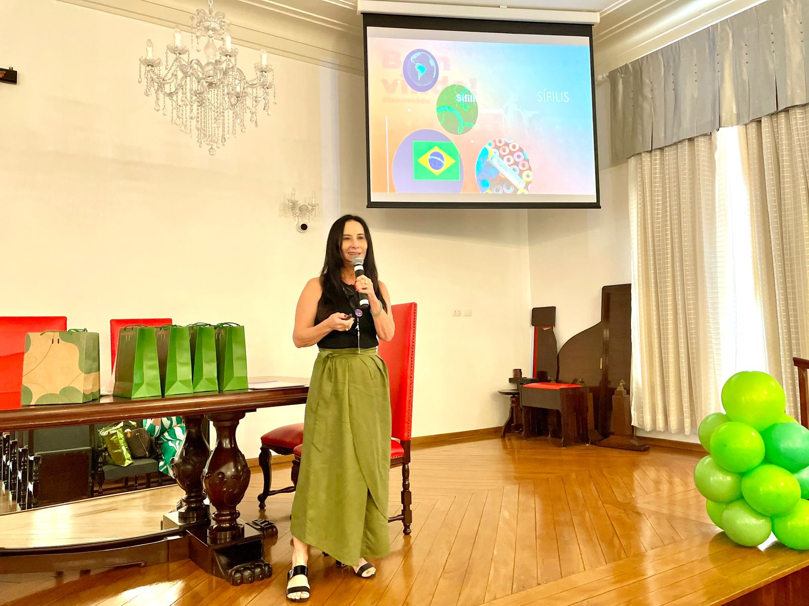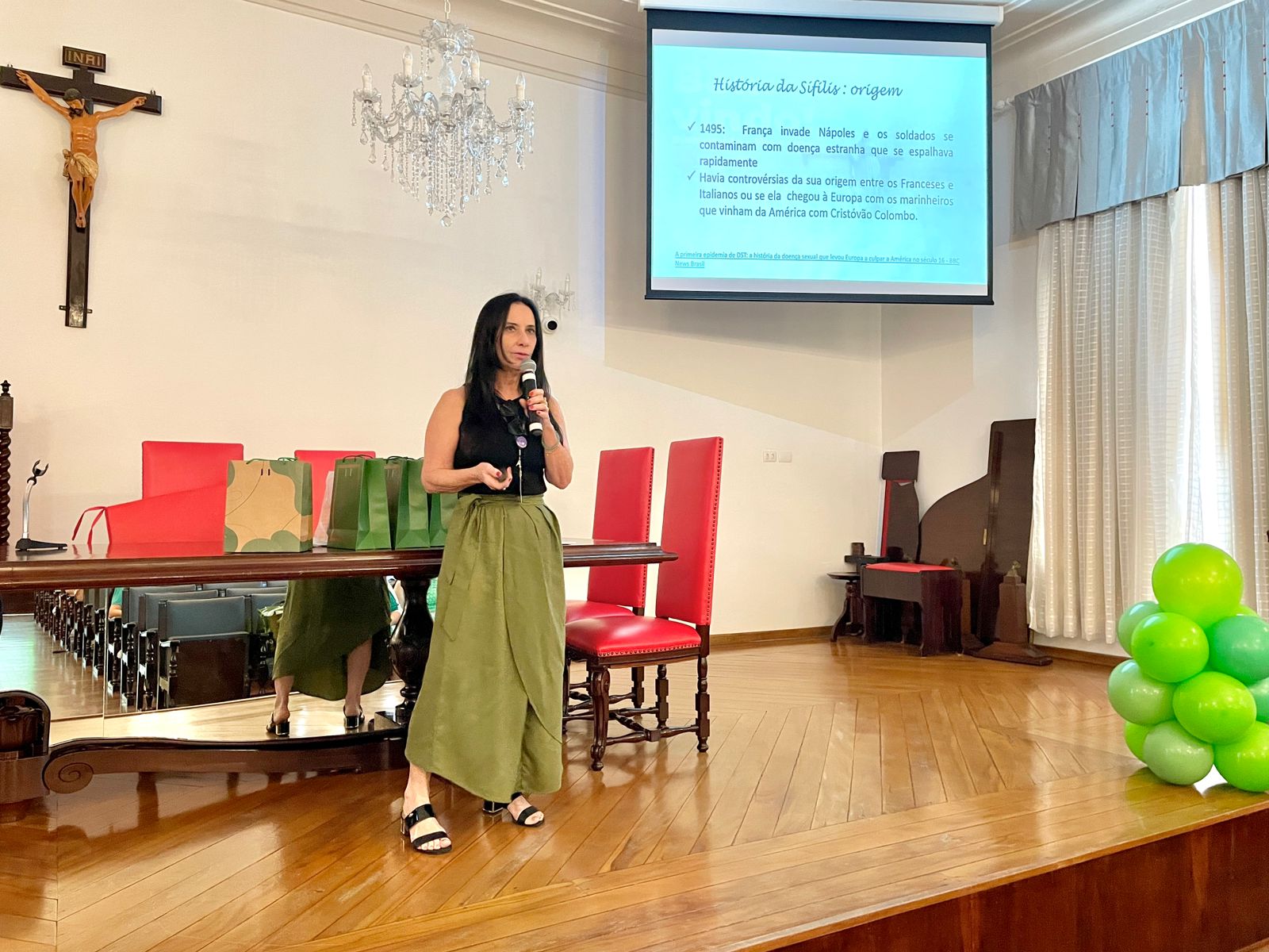 A primeira palestra foi com pediatra neonatologista, Drª Josiane Q. Xavier Castro, que falou sobre a história da sífilis na humanidade, explanando sobre o contexto social vivido à época do início da doença até os tempos atuais. Drª. Josiane apresentou dados sobre a incidência de sífilis congênita, inclusive regionais, e também falou como o pediatra pode intervir na diminuição da doença.