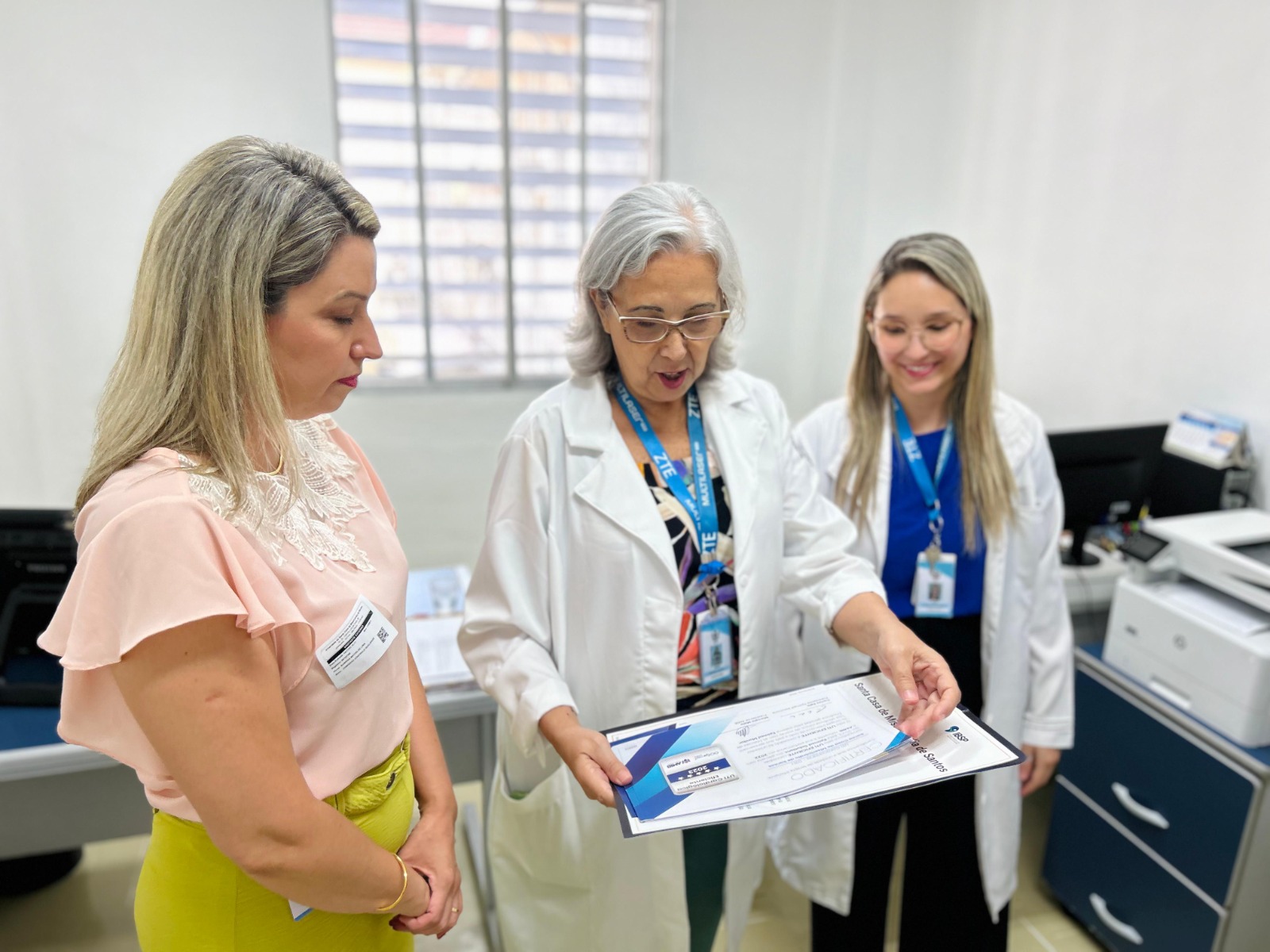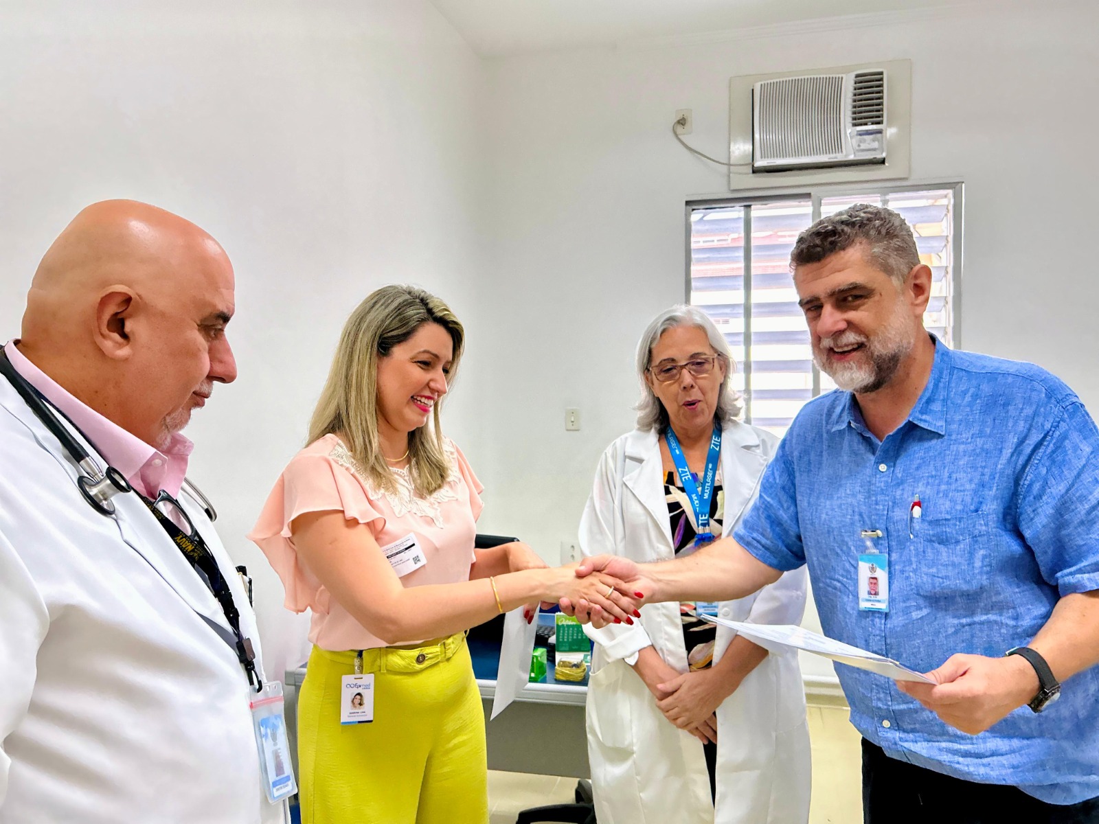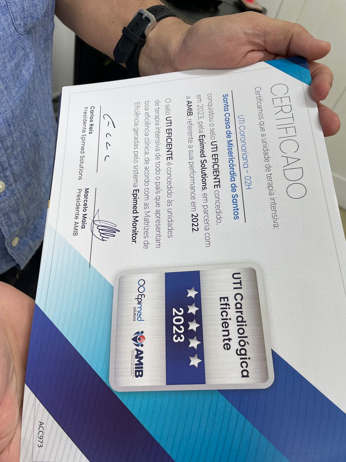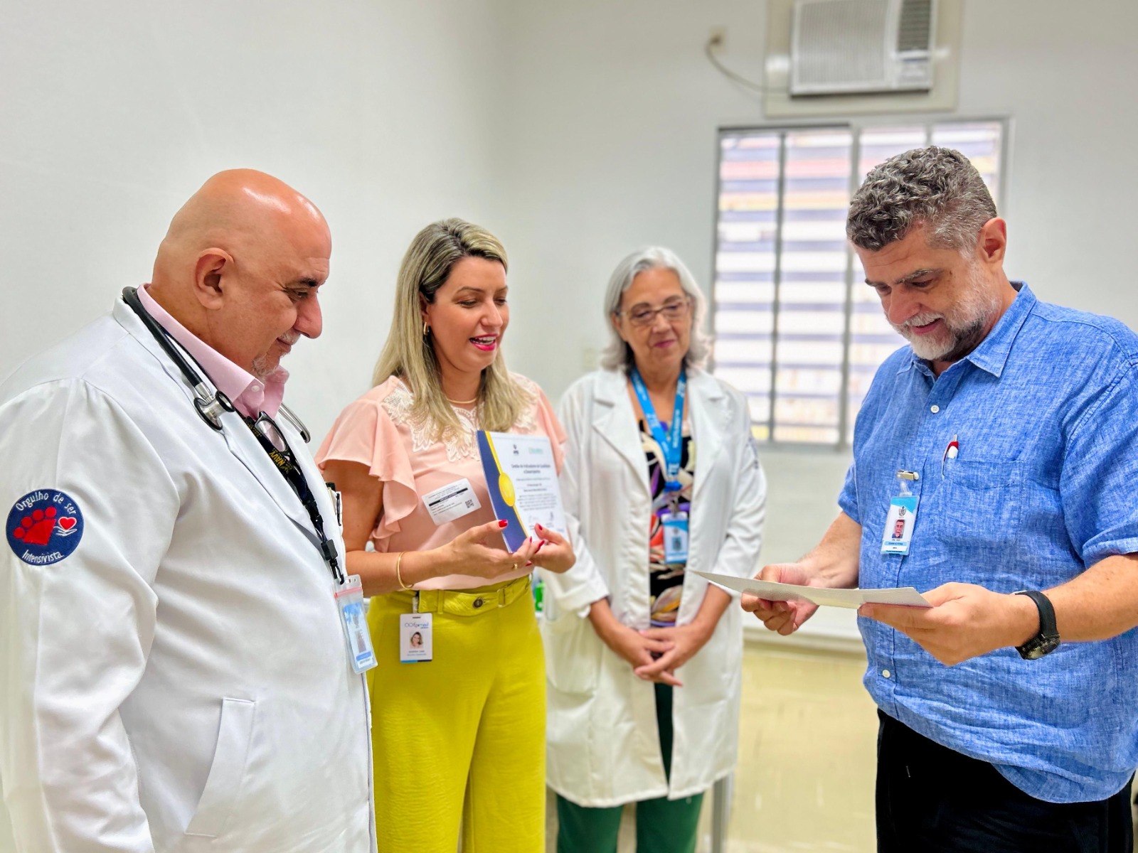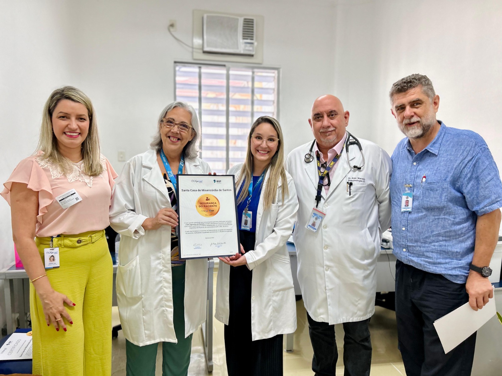 A formalização da entrega dos certificados aconteceu no dia 14/11/23, na diretoria técnica, com as presenças do diretor técnico, Dr. Alex Macedo; do médico intensivista Dr. Edwin Koterba; e das representantes do Núcleo de Segurança do Paciente, Enfª. Márcia Torelli e Enfª. Amanda Antunes. Os selos foram entregues pela gerente comercial da Epimed, Sabrina Lima.