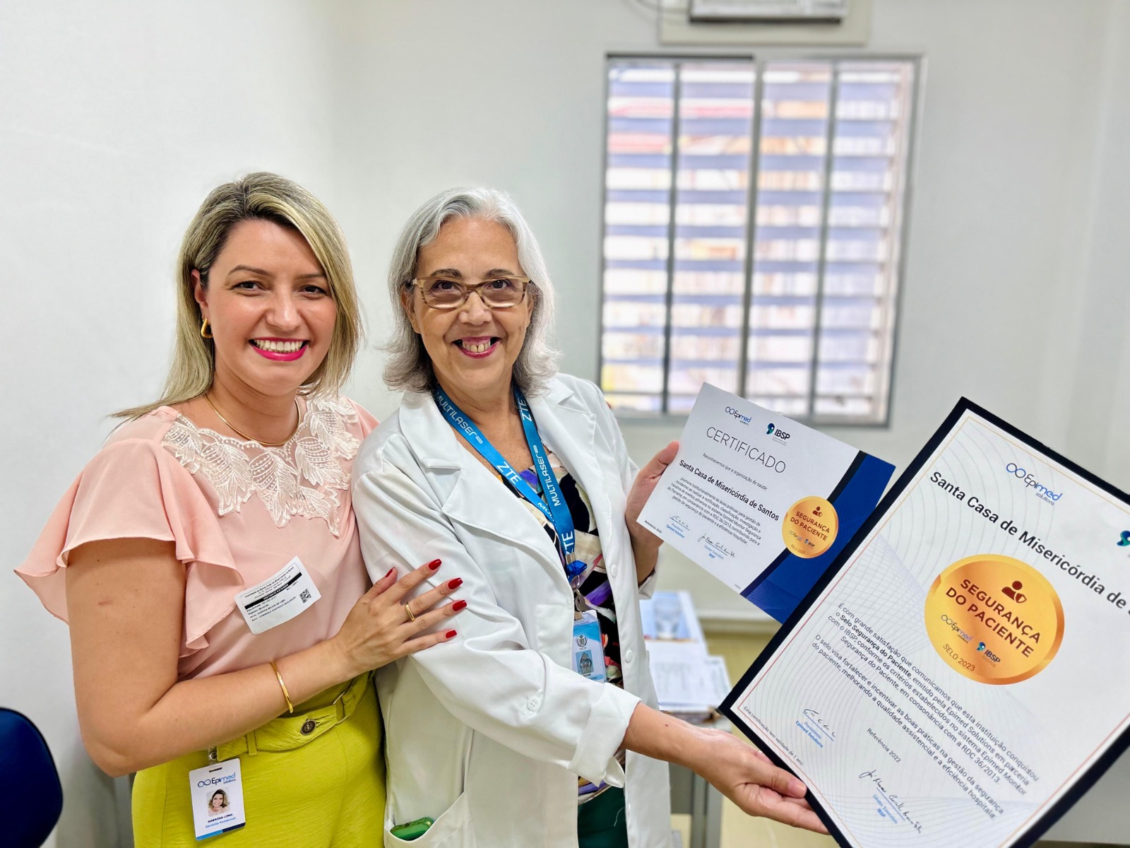 Além de todos esses certificados, destaque para o Selo de Segurança do Paciente entregue à equipe responsável pelas notificações de eventos adversos e promoção de ações que visam as boas práticas para a gestão de incidentes: Enfª Márcia Torelli e Enfª. Amanda Antunes, do Núcleo de Segurança do Paciente da instituição.
