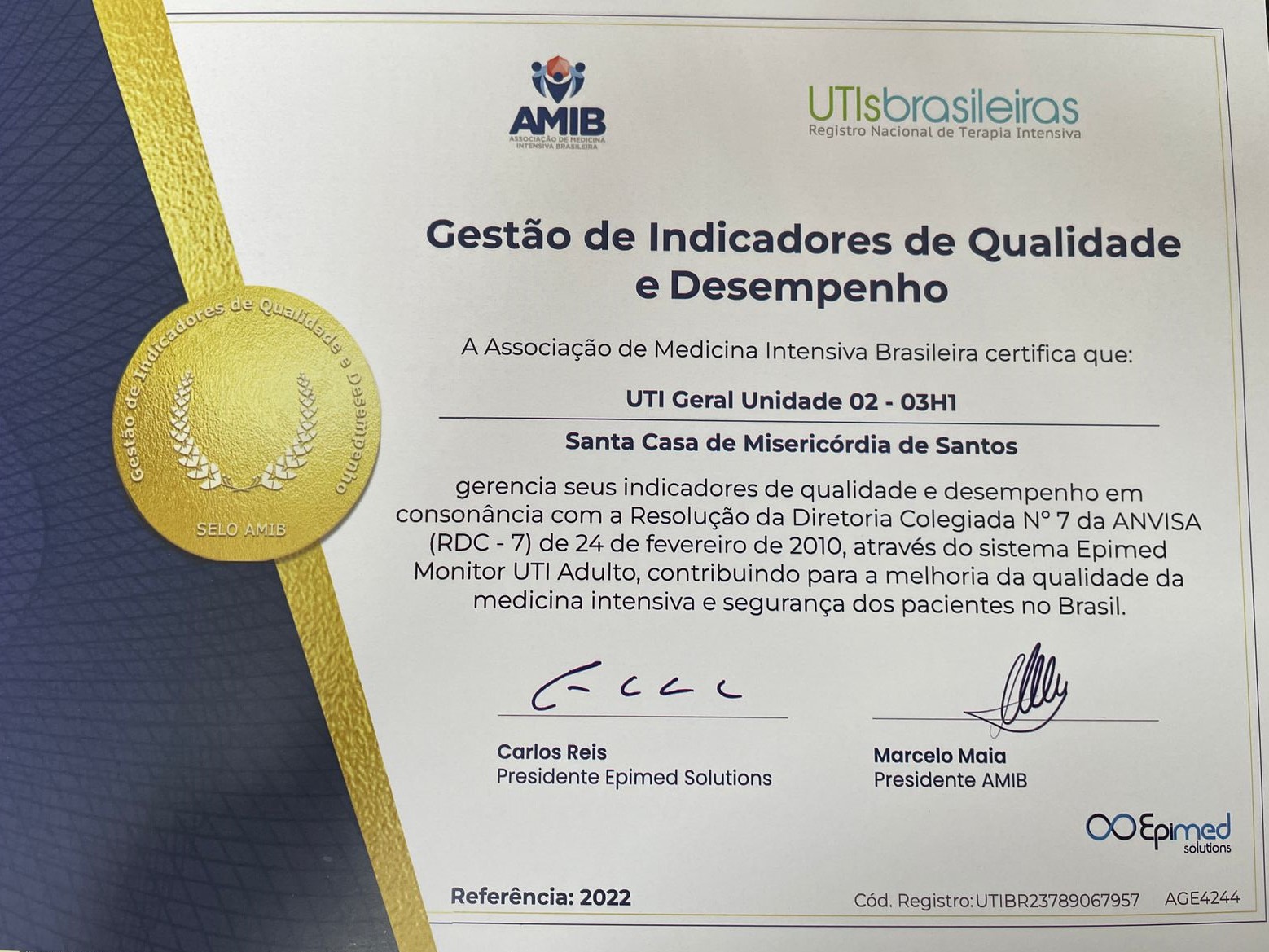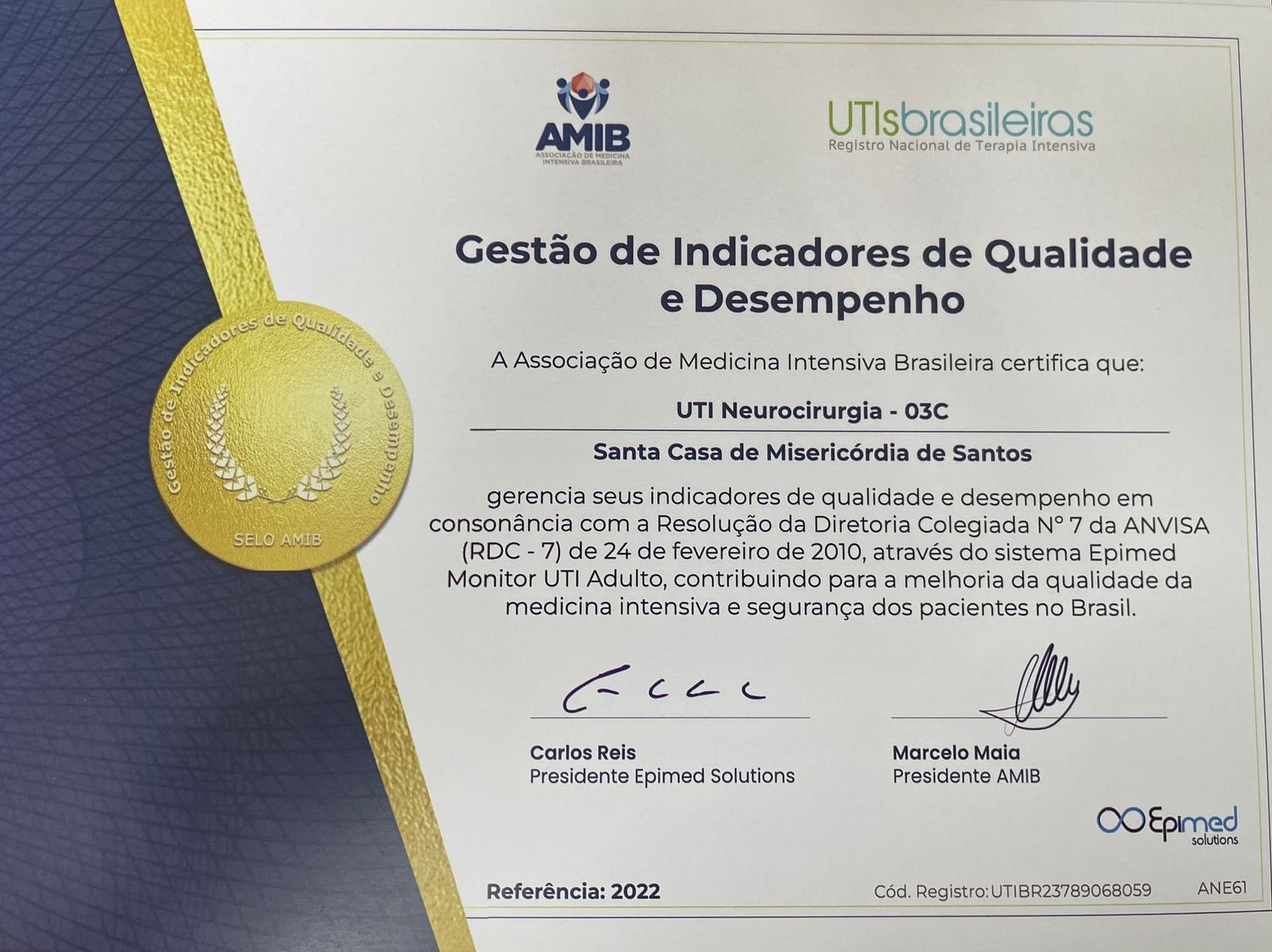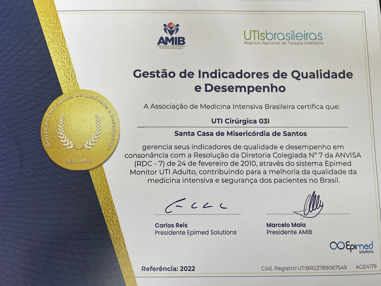 Qualidade e desempenho foram os principais quesitos que deram às Unidades de Terapia Intensiva da Santa Casa de Santos o reconhecimento para a certificação da Associação de Medicina Intensiva Brasileira - AMIB. O importante selo de qualidade foi conquistado através do sistema Epimed Monitor, com a avaliação de indicadores em consonância com a Resolução da Diretoria Colegiada Nº7 da ANVISA (RDC-7).